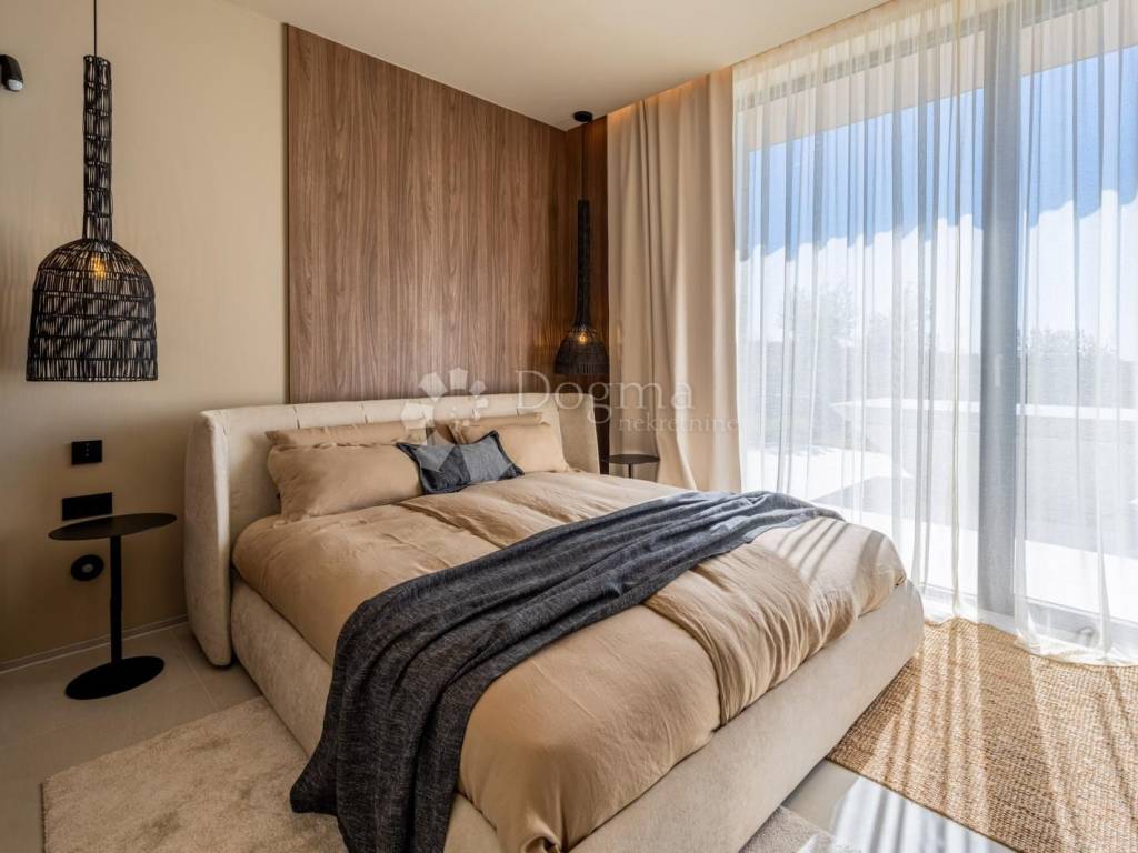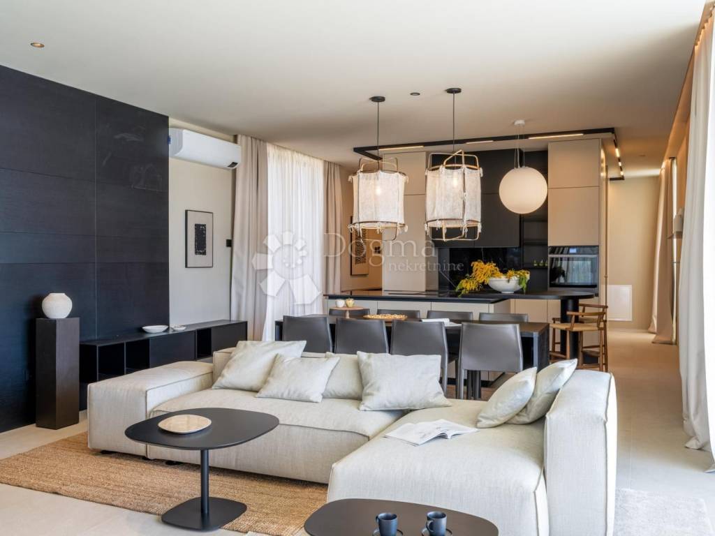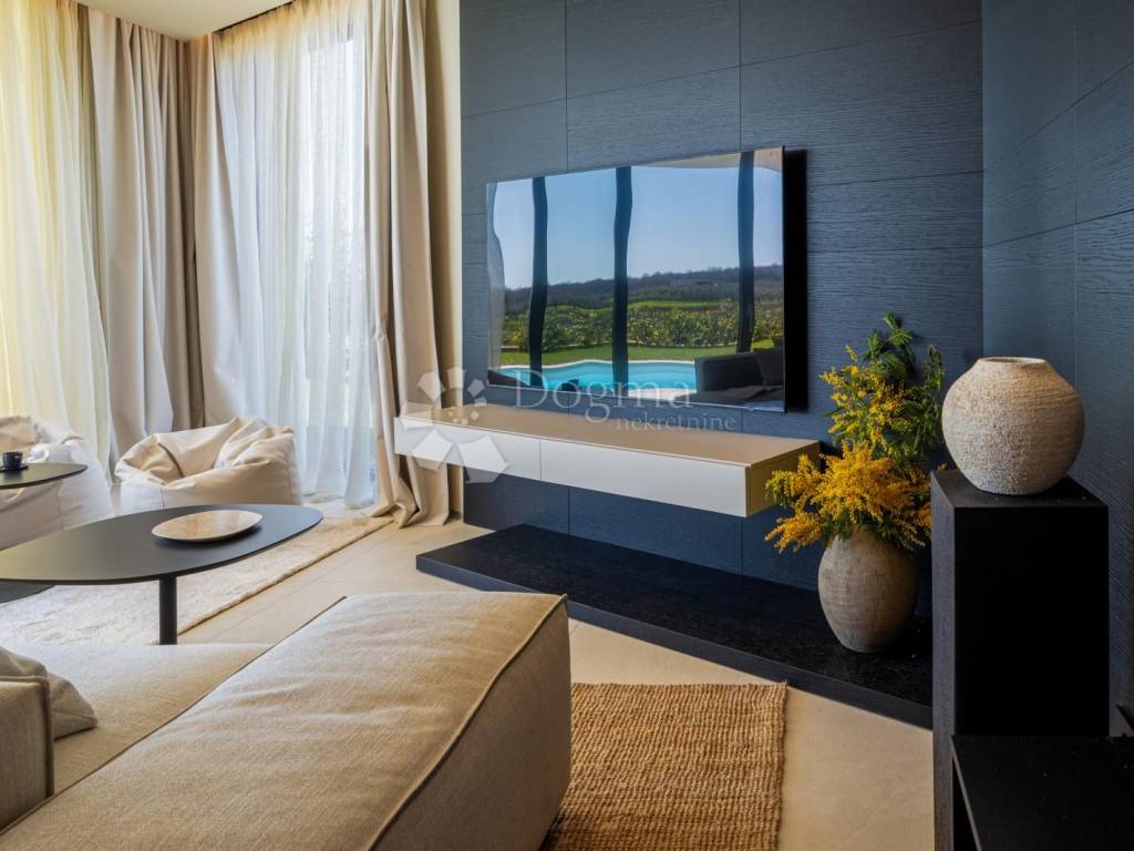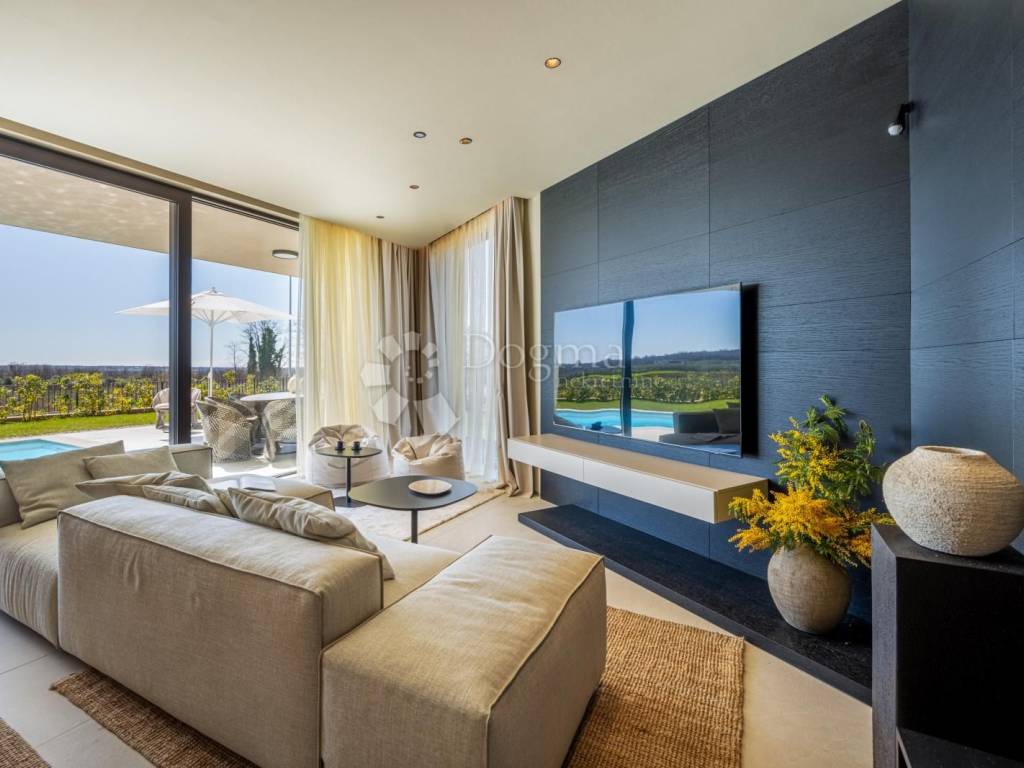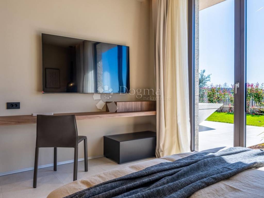 In an exceptional location in a newly built settlement (completely new infrastructure) is this modern single-storey house of top design, quality and fully equipped. Built in the first row of the settlement, next to a green area and olive groves, it is guaranteed an open view of the sea in the distance. The villa is fully automated via the Loxone smart home system, including a smart charger for electric vehicles.
