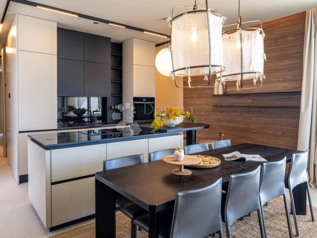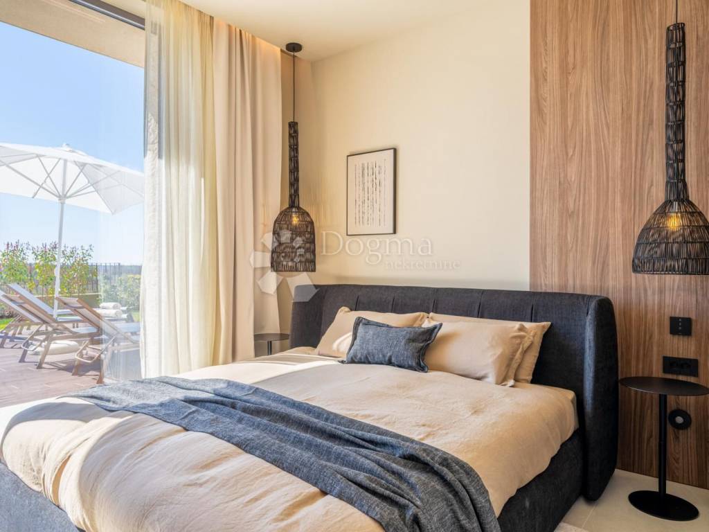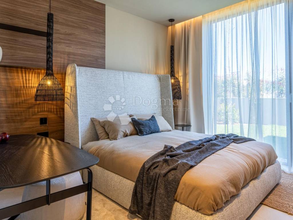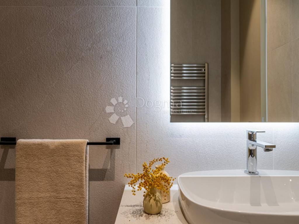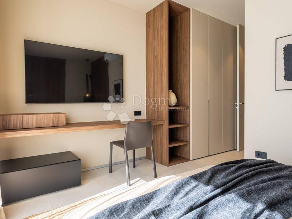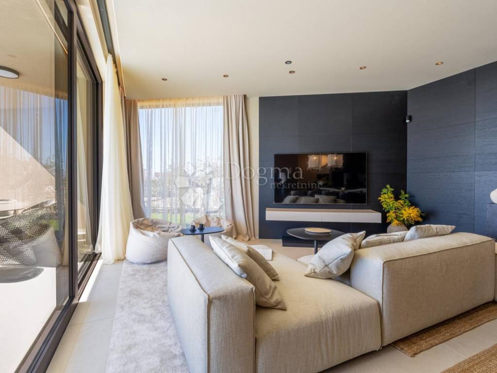 In an exceptional location in a newly built settlement (completely new infrastructure) is this modern single-storey house of top design, quality and fully equipped. Built in the first row of the settlement, next to a green area and olive groves, it is guaranteed an open view of the sea in the distance. The villa is fully automated via the Loxone smart home system, including a smart charger for electric vehicles.