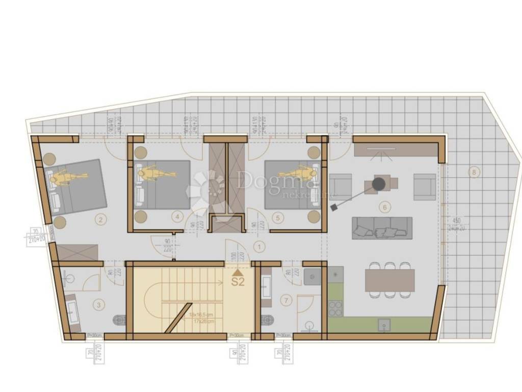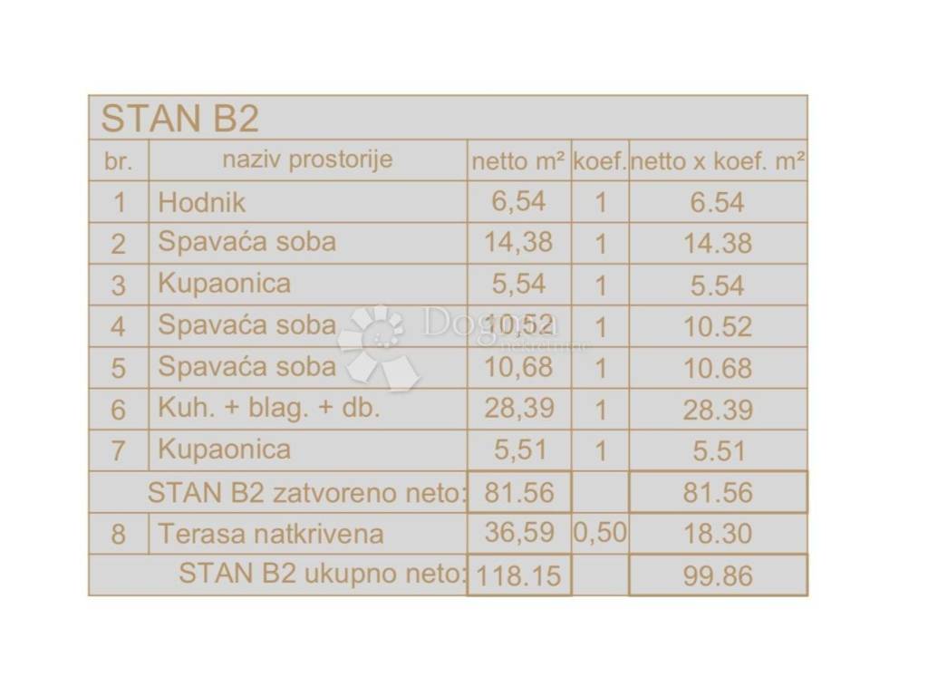 NEW CONSTRUCTION TWO BUILDINGS WITH THREE APARTMENTS EACH For sale are two smaller residential buildings, each with three apartments, located in an attractive location. 1/1 ownership, possibility of interior personalization and payment by construction phases. Layout of the apartments: Ground floor apartments one-bedroom, with private garden and one parking space - POSSIBILITY TO BE TWO-BEDROOM! First floor apartments three-bedroom, with two parking spaces and the possibility of dividing into two smaller apartments for investment and rental (but for one buyer) Specifications: PVC joinery with triple glazing UNDERFLOOR HEATING Completion planned for spring next year (2026) Flexibility in choosing materials and finishes APARTMENT DESCRIPTION S2 - BUILDING B: - 1ST FLOOR - 3000/m2 !! - usable living area 118.15m2, two parking spaces 25m2 (with coef. apartment 99.86m2 + 2x parking. 2.50m2 = 104.86m2) - kitchen, dining room and living room - 2 bathrooms - 3 bedrooms - large terrace gross usable area 36.59m2!! This modern new building offers quality construction and a functional layout, adaptable to the buyer's wishes. Excellent opportunity for living or investment. For more information and to arrange a viewing, please contact us. Gabrijela Lovrinović Brokerage Assistant Mob: 097 7617 229 Email: gabrijela.lovrinovic@dogma-nekretnine.com