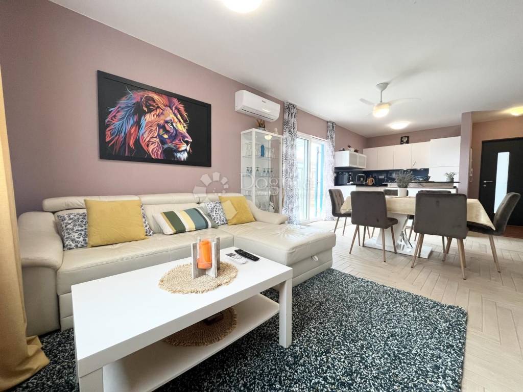 It consists of an entrance hall, open-space living room, kitchen and dining room, 2 bedrooms, bathroom and storage room. From the living room, through a glass wall, there is access to a covered terrace, sundeck and pool. Heating and cooling are provided by modern inverter air conditioners located in each room.