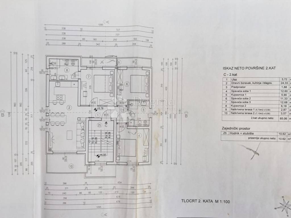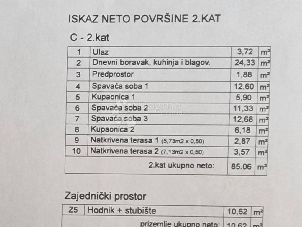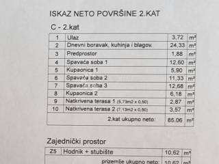 The apartment is located on the 2nd floor, which is also the last, with a net living area of 85.06 m2, and consists of a hallway, open space kitchen, living room and dining room, 3 bedrooms, 2 bathrooms (one of which belongs to 1 bedroom) and 2 covered terraces.