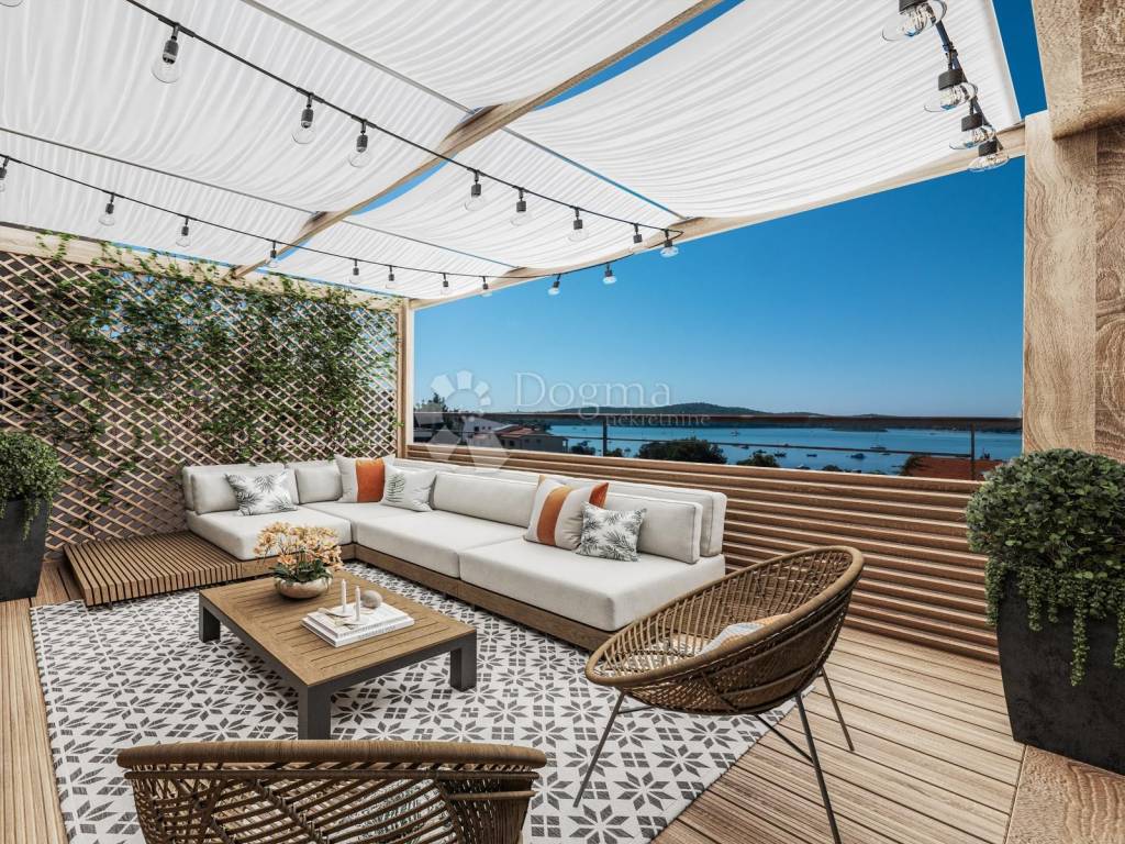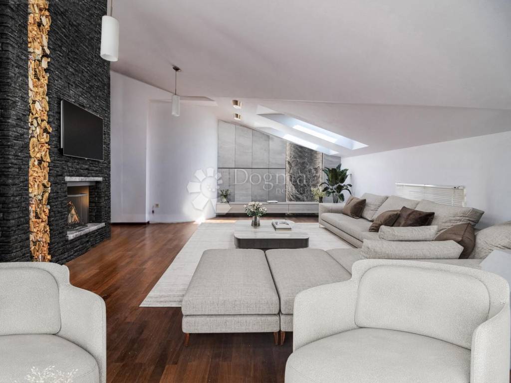 In the peaceful part of Medulin, near the sea, we are selling this beautiful apartment with a total living area of 191.69 square meters. The property is situated on the third and final floor of a well-maintained building, consisting of a spacious living room with a fireplace and access to two terraces, a kitchen and dining room with an additional terrace, three bedrooms, two bathrooms, a walk-in closet, and a hallway. Both terraces offer a panoramic sea view. The apartment comes with a parking space in front of the entrance.