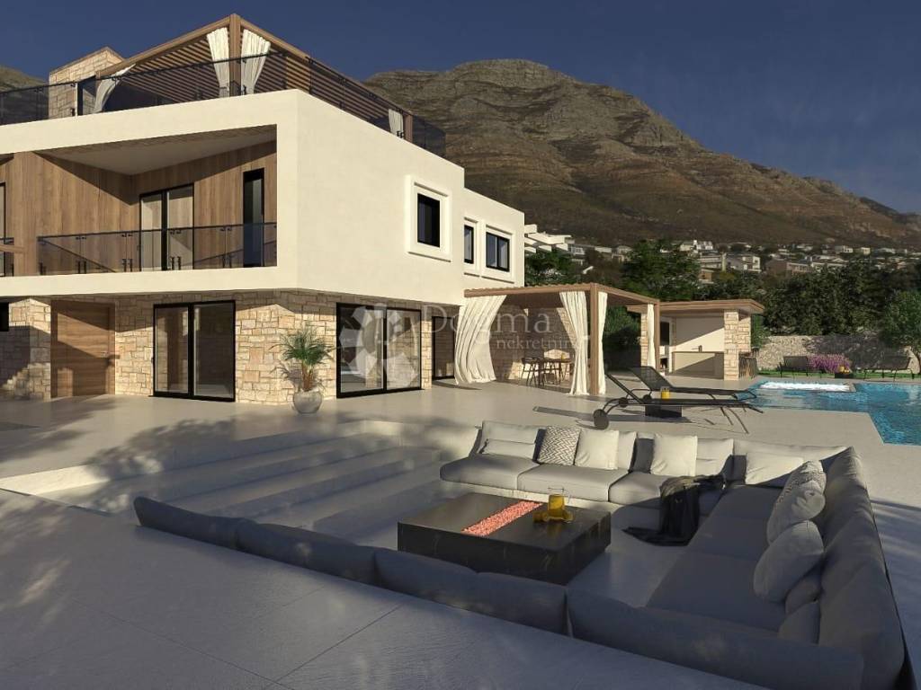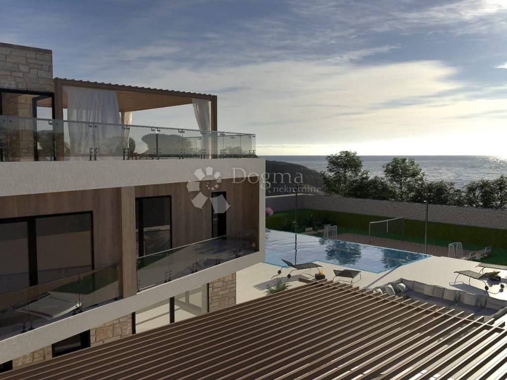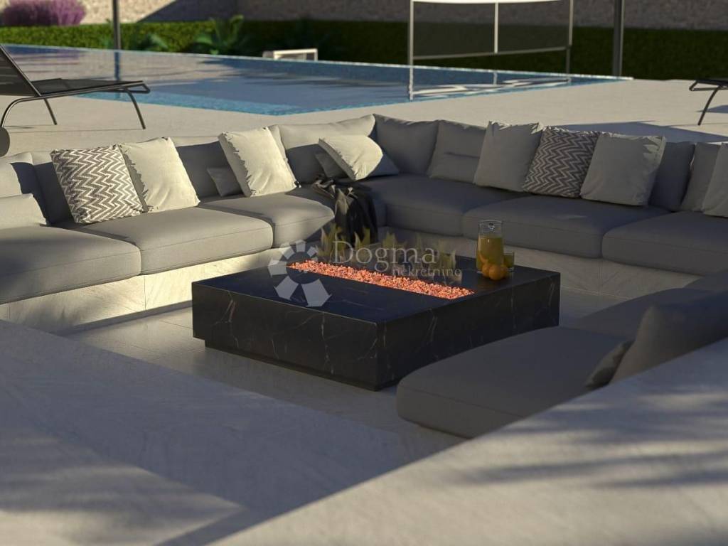 Certainly the special feature of this smart villa will be the exterior in which a large overflow pool of 60 m2 will stand out, which will have a separate jacuzzi. The pool will be heated, with salt water, a waterfall and ice lighting in colors and an outdoor shower. Next to the pool there will be a place to relax by the fire, which will be flush with the sun deck. The summer kitchen will be equipped with high quality kitchen appliances, barbecue, bar with bar stools and TV to enjoy sports matches. On the lower part of the land under the pool there will be a volleyball and beach soccer field with its own lighting for the possibility of evening play, while behind the playground or behind the bench there will be a storage room with pool equipment. The villa will have 3 covered parking spaces with automatic entrance and a separate smaller entrance. The environment of the villa will be decorated with various plants and greenery, olives, lavender and other Mediterranean plants fully equipped with automatic irrigation.