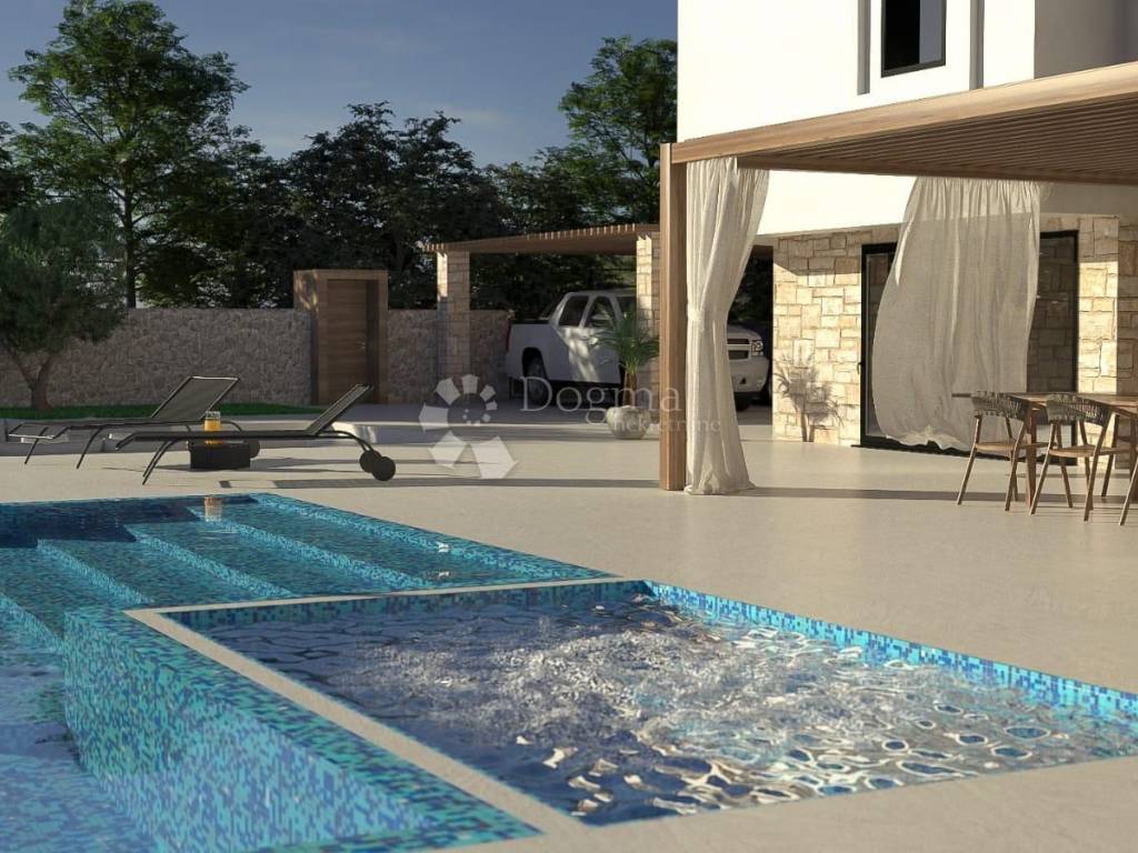Right in the vicinity of Vodnjan with a view of the Brijuni archipelago, the construction of this luxury smart villa with a living area of 297 m2 and a garden area of 1000 m2 is planned. This beautiful villa on the ground floor will consist of an entrance hall, toilet, storage and a large open space of 73.20 m2 which will house a modern large kitchen with island, dining room and living room with fireplace. Also on the ground floor there will be a tavern in the Istrian style with a large fireplace and a wooden table with benches, and will have its own separate storage room with toilet and two accesses from the inside of the villa and from the outside. On the ground floor there will be 3 large glass walls overlooking the pool and an outdoor covered terrace with a large table. Upstairs there will be 3 spacious bedrooms, one of which is a master bedroom with private bathroom, wardrobe 25.50 m2 and a beautiful terrace. Upstairs there will be a study with terrace, hallway, bathroom, storage room, gym, sauna with toilet and shower, which will have an external entrance stairs in front of which will be another covered terrace of 19.67 m2 for relaxation after a hard day. training.