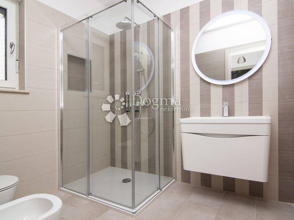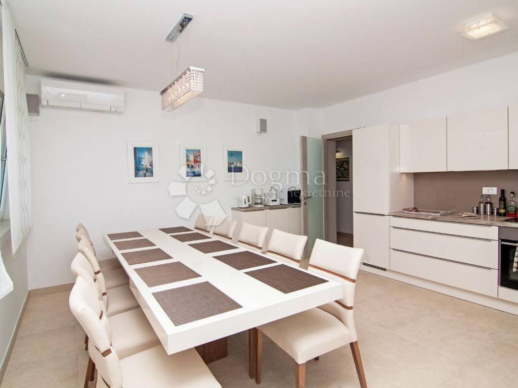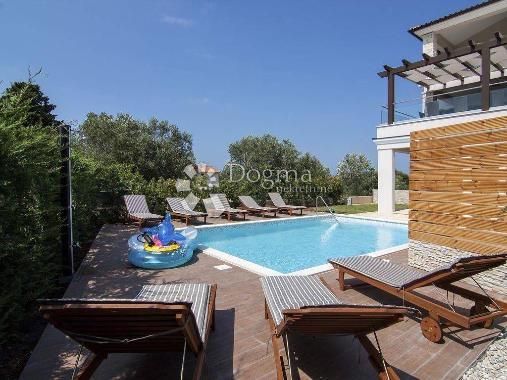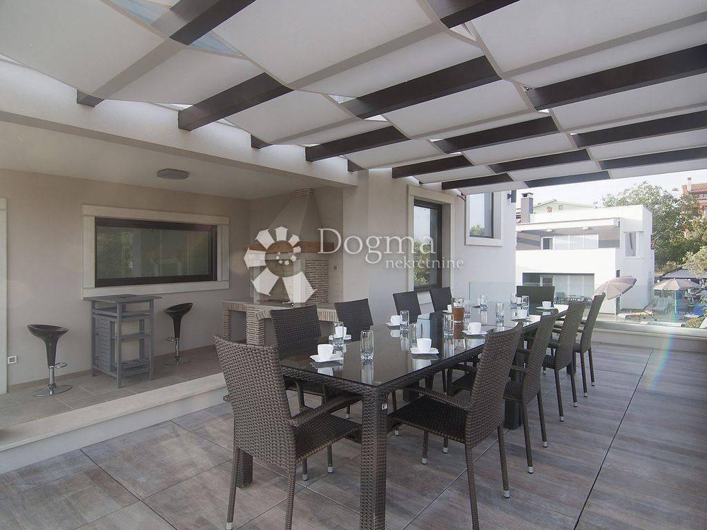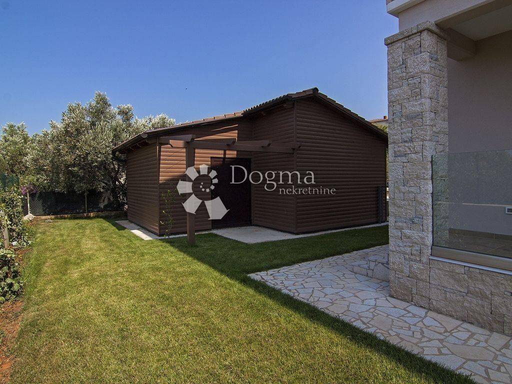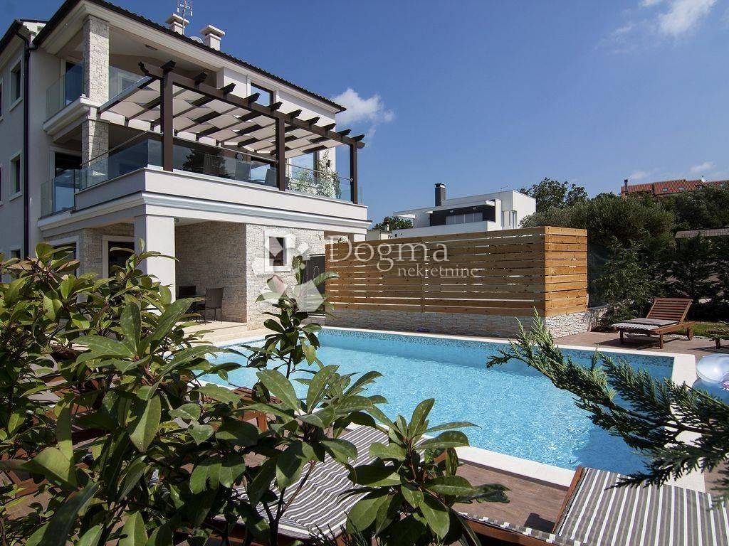 A picturesque fishing village on the southwest coast of the Istrian peninsula, near ancient Pula, the starting port for the Brijuni Islands - a national park with the attributes of an earthly paradise, is ideal for your vacation and recreation with many facilities. Families with children will find beautiful beaches and playgrounds, recreationists sports facilities, lovers of good food numerous restaurants, and nature lovers a beautiful promenade by the sea where everyone will enjoy the sunsets and sea air. Within 5 minutes walk to the sea is located this modern house with three apartments and a special space for entertainment. Heating and cooling is regulated by air inverter (9 units). Each apartment has a large terrace equipped with an outdoor grill. Next to the house there is a swimming pool of 32m2 and a sun deck. The garden is completely fenced, with 6 available parking spaces. GROUND FLOOR: * apartment of 149m2 consists of kitchen, dining room, living room, 2 bedrooms, 2 bathrooms. FIRST FLOOR: * apartment of 120m2 consists of a kitchen with access to a large covered terrace with barbecue overlooking the Brijuni archipelago, then 1 bedroom with bathroom and dressing room, one smaller room with terrace, 1 separate bathroom and 1 toilet. II FLOOR: * apartment of 120m2 consists of a kitchen with access to a large covered terrace with barbecue, then 1 bedroom with bathroom and dressing room, one smaller room with terrace, 1 separate bathroom and 1 toilet. Each apartment has a functional storage room. High quality insulation and PVC joinery with a double chamber guarantees high energy efficiency. Each apartment has separate electricity and water connections. An ideal investment with a quick return on investment in an attractive location with a breathtaking sea view.