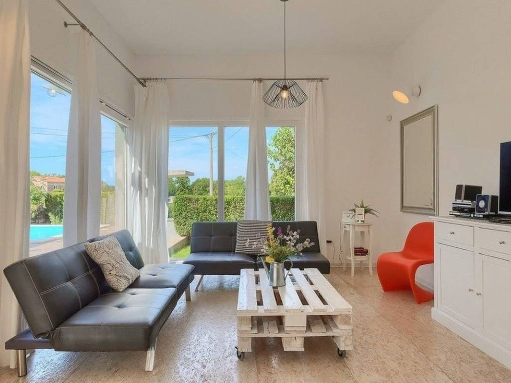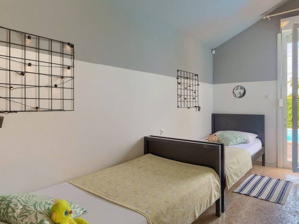 For sale is a single-family house of 120 m², located on a landscaped and fenced plot of 324 m², in a quiet and attractive location just a few minutes drive from Poreč and the sea. The surroundings are quiet and pleasant, which makes this property an ideal choice for family life, vacation or long-term residence. The property is sold fully furnished, which allows immediate move-in without additional investment. The interior layout is designed functionally and practically. The house consists of a fully equipped kitchen with an open-concept dining room and living room, a separate guest toilet, three bedrooms and two modern bathrooms. Large glass walls in the living room provide plenty of natural light and direct access to the terrace and courtyard. In the front part of the garden there is a swimming pool with a sunbathing area, surrounded by tall greenery that provides a sense of privacy and peace. In addition, the atrium with a fireplace and a large table is ideal for gatherings with family and friends throughout the year. The house is equipped with inverter air conditioners that enable efficient heating and cooling, which ensures a pleasant stay in all seasons. The facility is of prefabricated construction, which brings additional energy advantages and faster maintenance. This property represents a combination of practicality, comfort and a peaceful environment near the sea and all important facilities.