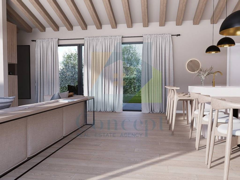 The house sits on a plot of 735 m and has a living space of 150 m. It is surrounded by greenery that provides privacy, and the outdoor area includes a pool, sun terrace, lounge zone, and an outdoor kitchen. This space is designed for maximum enjoyment outdoors, whether for family gatherings, relaxation, or entertaining friends.