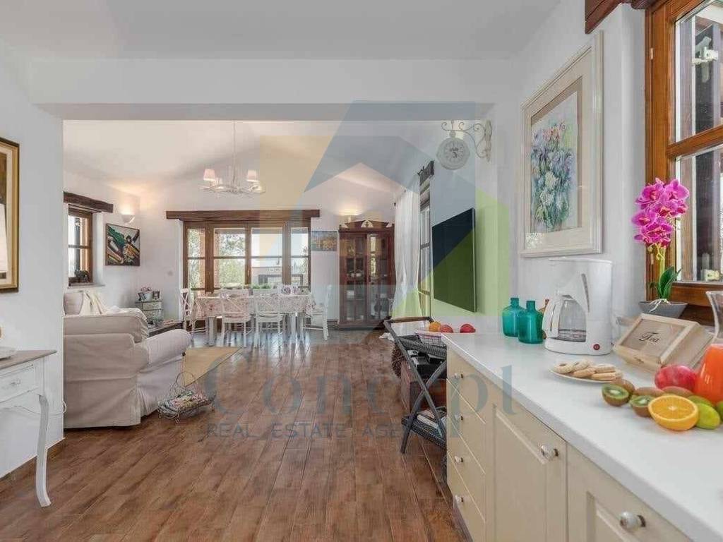 The outdoor area has been designed with special attention and includes a covered summer kitchen, perfect for outdoor gatherings. The yard features a pool and a sunbathing area, making it an ideal place to relax and enjoy the Mediterranean atmosphere.