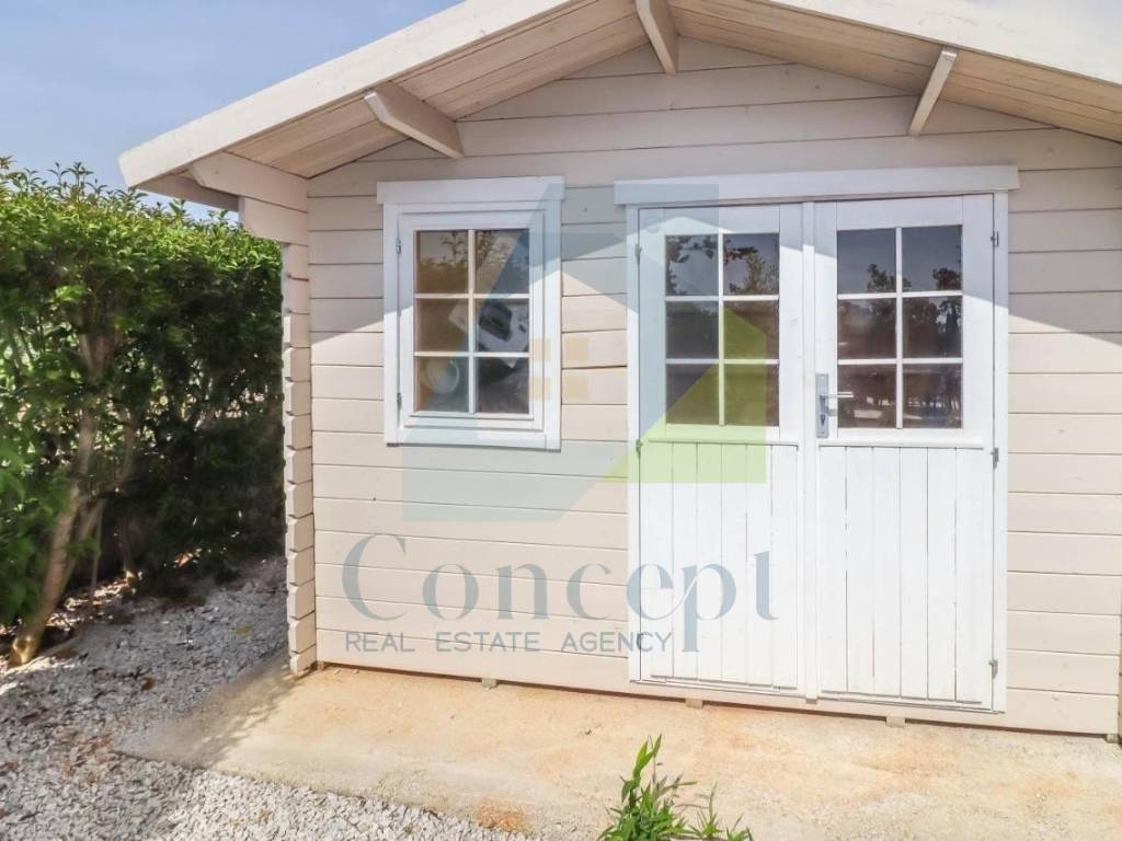 The outdoor area features a 30 m pool, a summer kitchen with a fireplace, and a covered terrace, providing the perfect spot to enjoy beautiful days. There is also a covered parking area for two cars.
