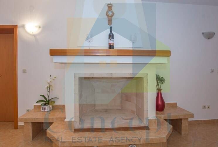 On the first floor, there is a spacious apartment of approximately 100 m consisting of a large living area with a kitchen, dining room, and living room with a fireplace, two spacious bedrooms, and a bathroom. The apartment opens onto a large terrace, further enriching the living space.