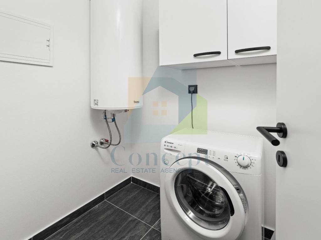 On the ground floor, there is an entrance hallway, a spacious living room, a fully equipped kitchen, one large bedroom, a bathroom, and a utility room. On the upper floor, there are two additional bedrooms, each with its own bathroom.