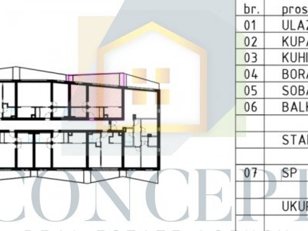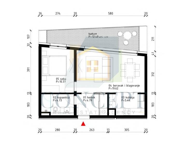 For sale is an apartment with an area of 52.45 m on the ground floor of a new residential building in Poreč, located just 800 meters from the sea. The apartment consists of an entrance hallway, a bathroom, a bedroom, and a living room with a kitchen and dining area that opens onto a balcony.