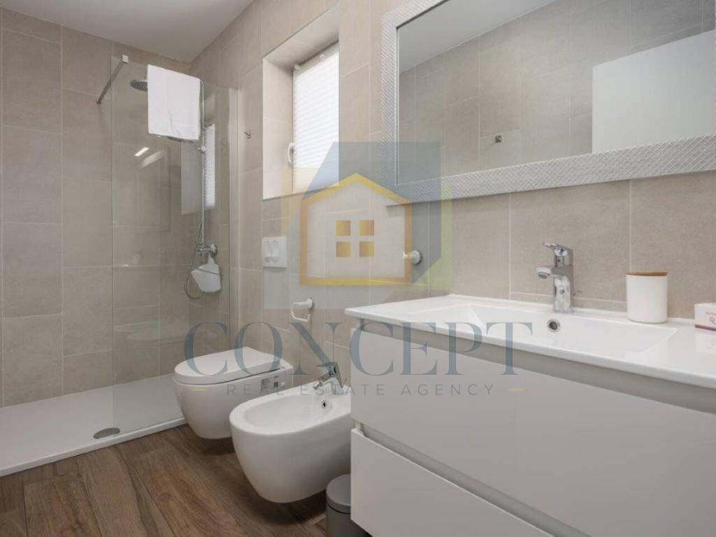 On the ground floor, there is a spacious living room connected to the kitchen and dining area, one bedroom with an en-suite bathroom, a guest toilet, and an entrance hall. The first floor features three comfortable bedrooms, each with its own bathroom, while two large terraces offer a stunning sea view.