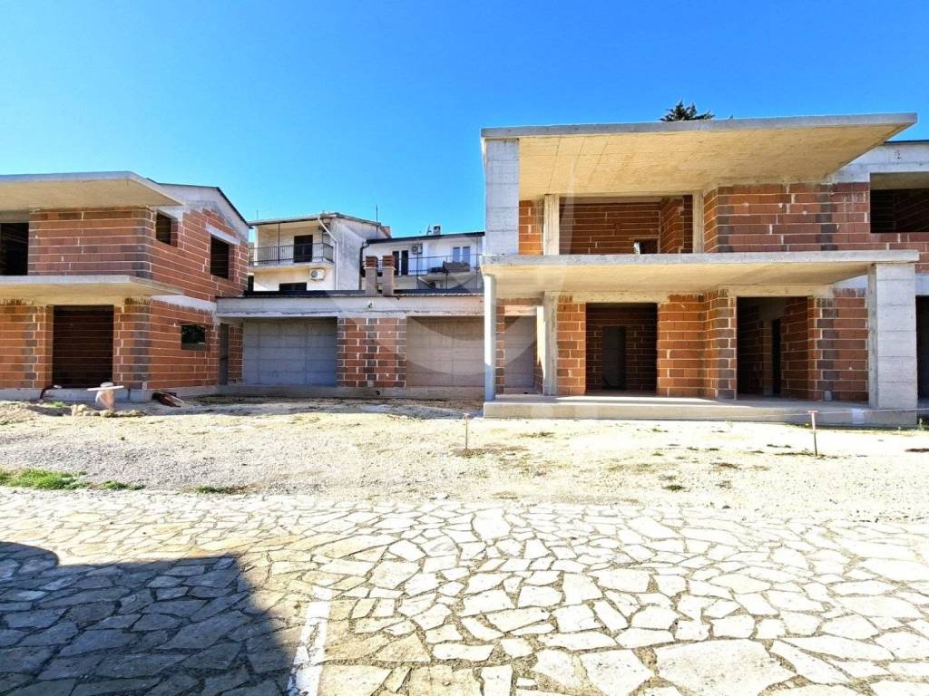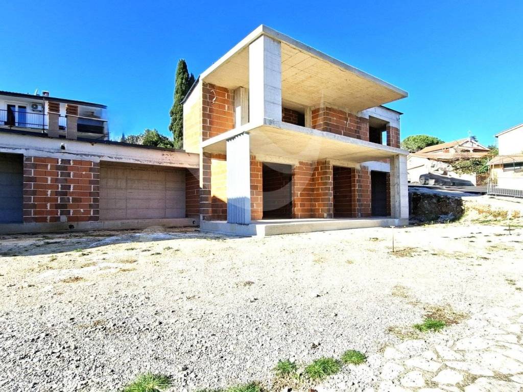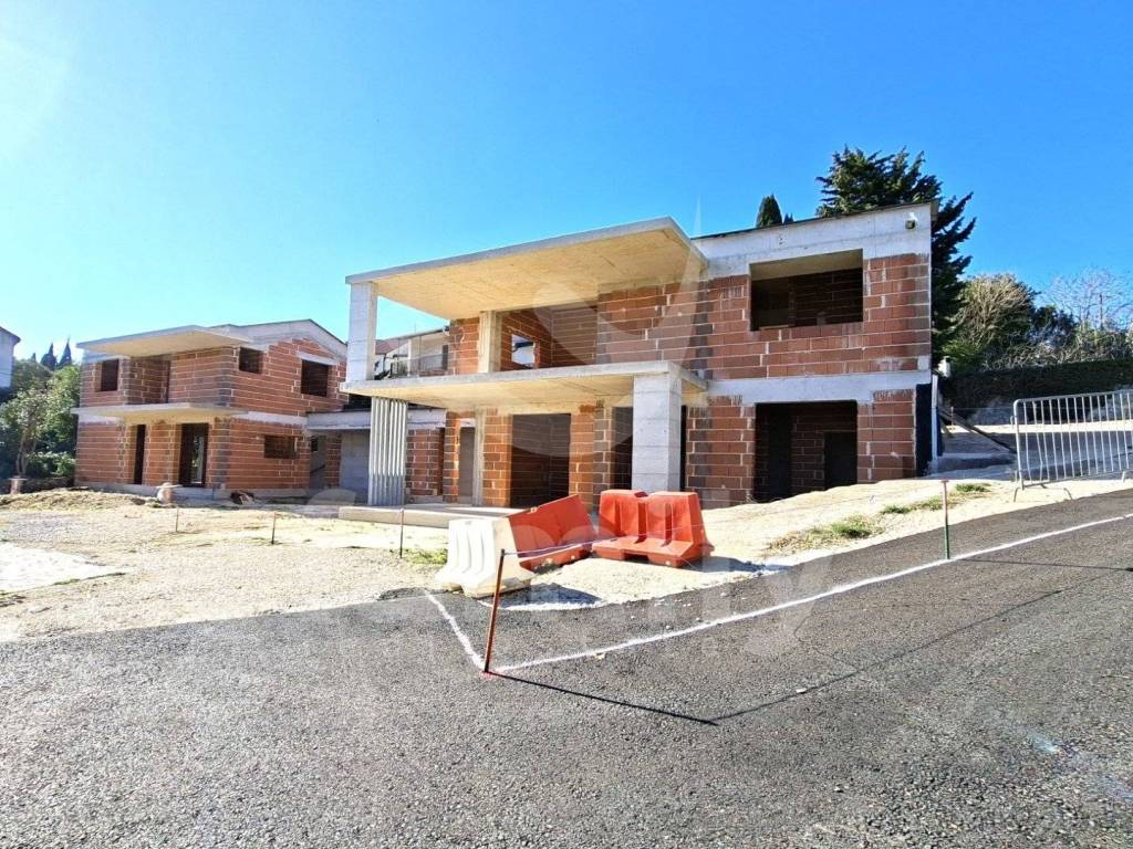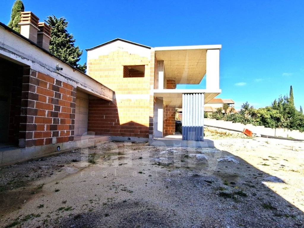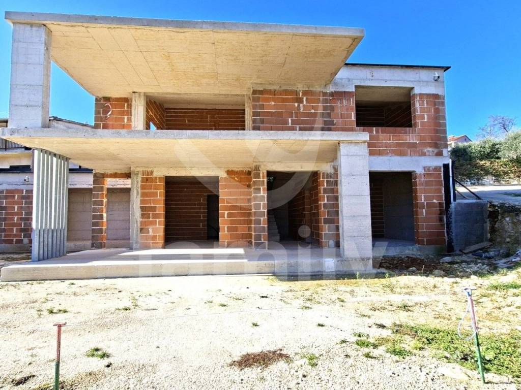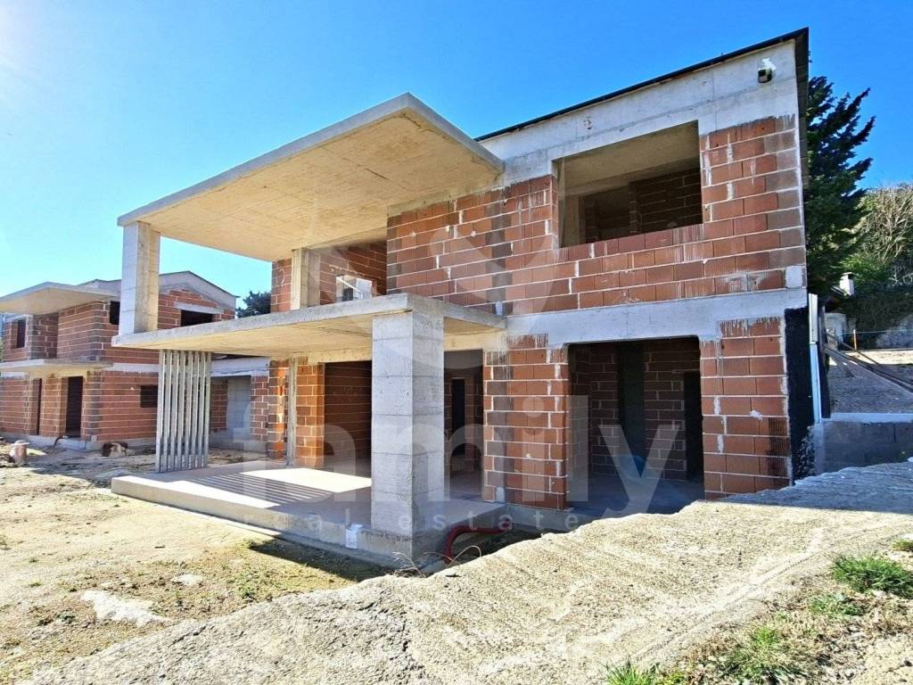 Internal stairs lead to the entrance hall, 2 bedrooms, 2 bathrooms and a covered terrace with a partial sea view. The utilities for the house and the connection to the sewerage system have been paid for, and electricity and water are in front of the plot. The project also includes a 22 m2 swimming pool and 5 parking spaces.
