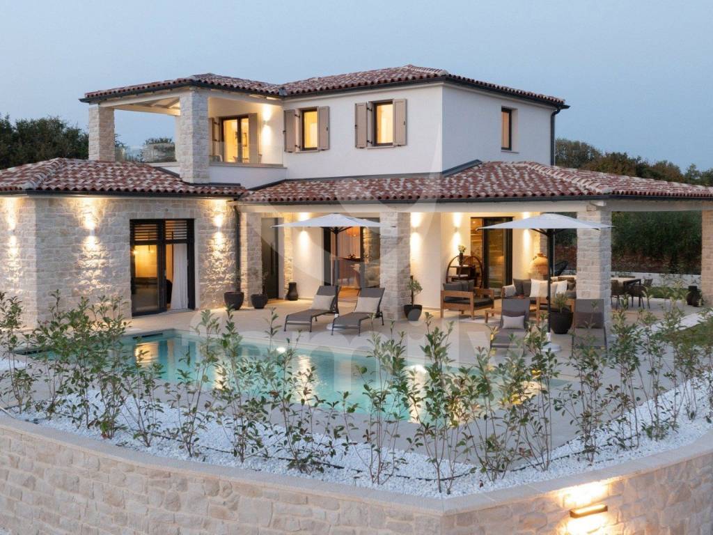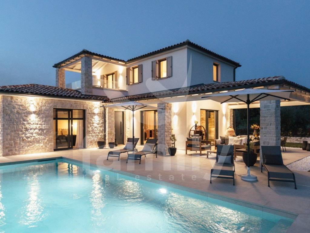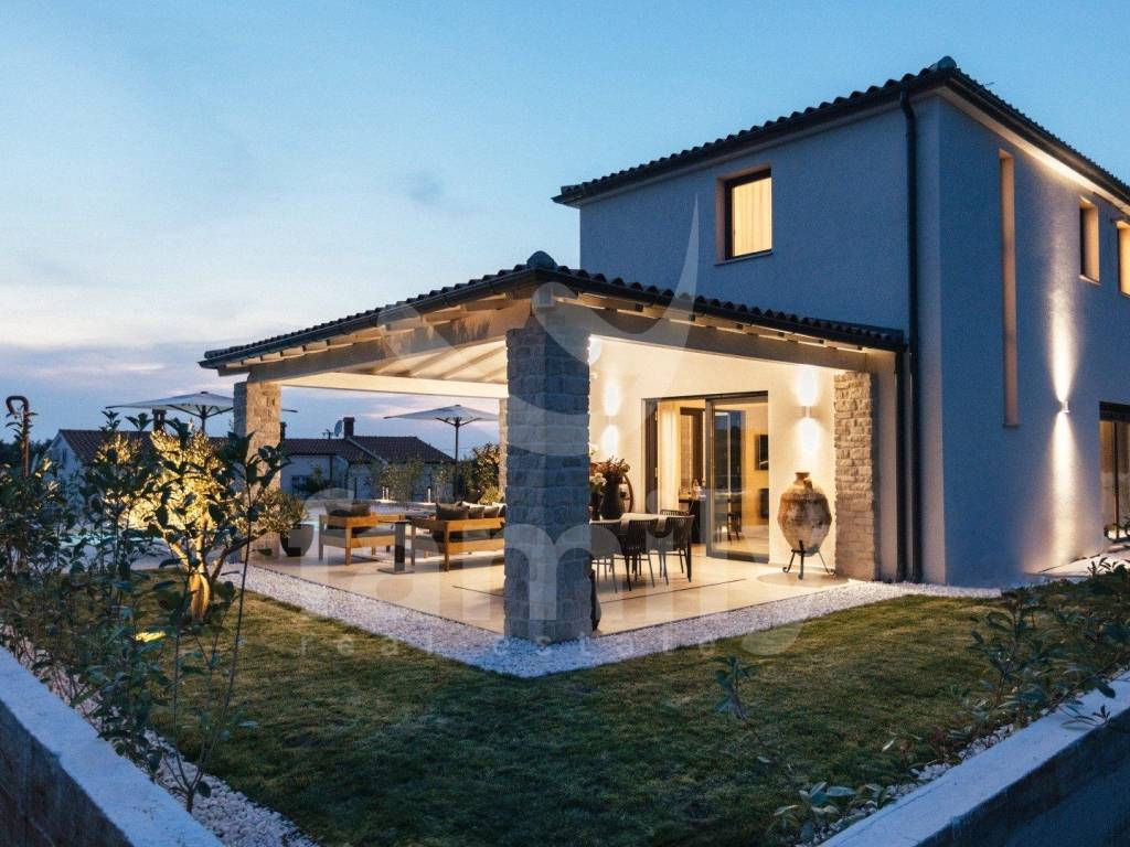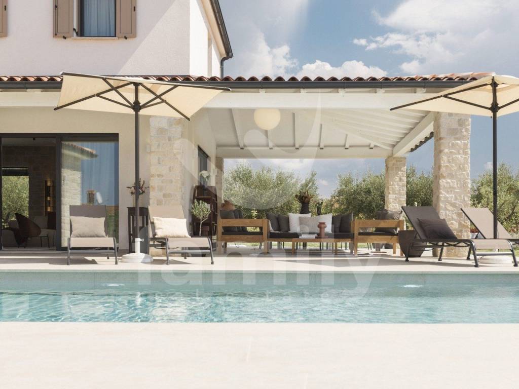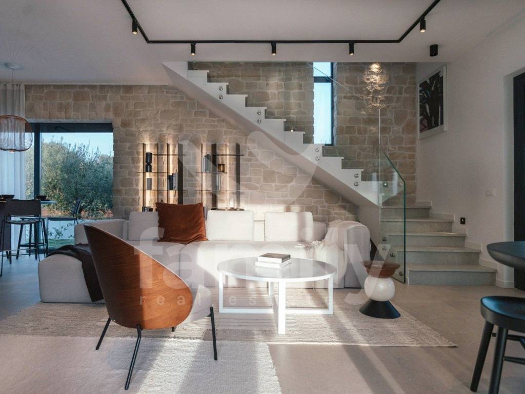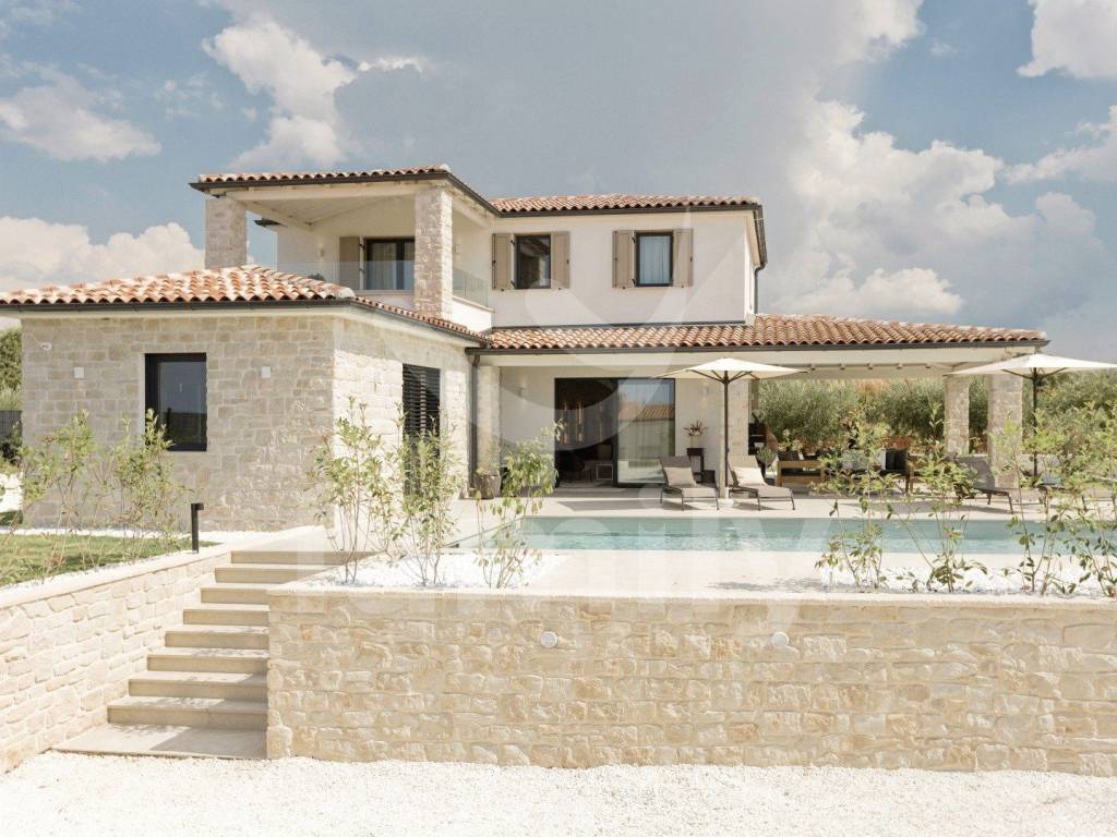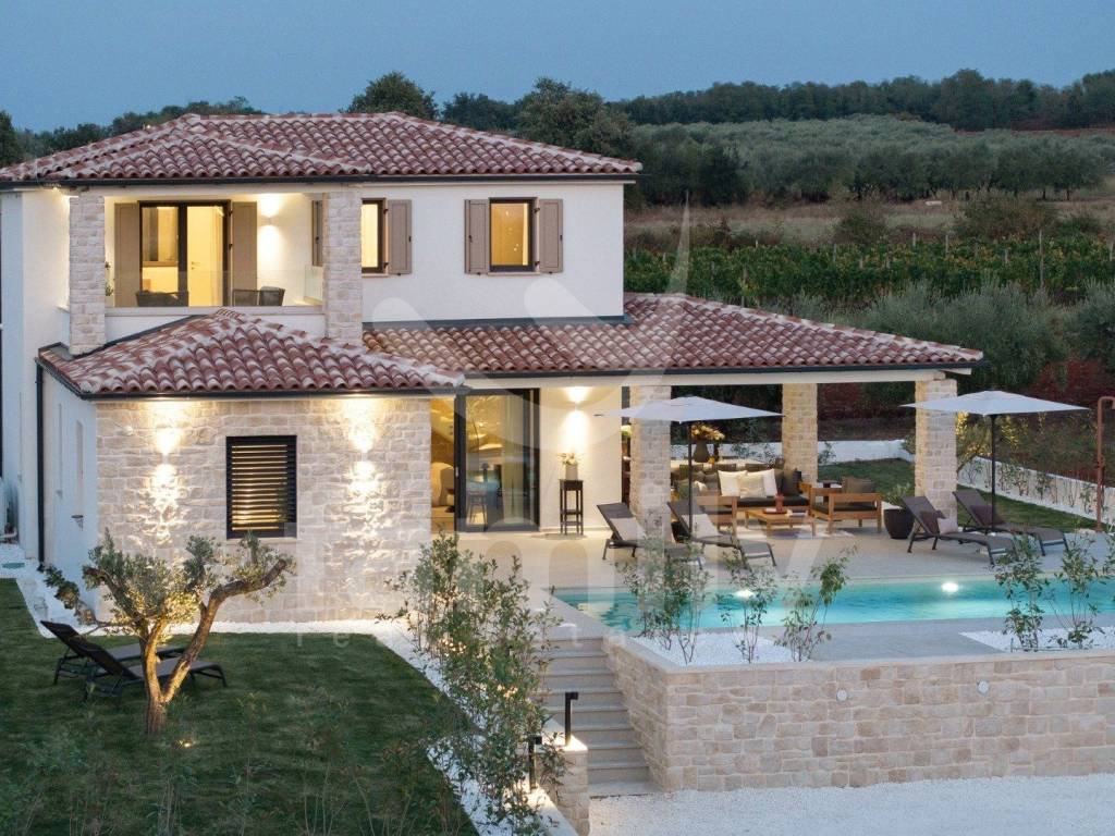 Not far from Poreč in a quiet village is located this spacious, luxurious and authentic villa of 165 m2 on a plot of 585 m2. This prestigious property extends over two floors, on the ground floor there is a spacious open concept living room with dining room and a modern and designer kitchen in which there are built-in quality Miele household appliances, a toilet, a bedroom with a bathroom, a technical room, while on the first floor there are two more bedrooms, each with its own bathroom and one of them has an exit to a terrace with a view of the sea. The property is extremely well equipped and every detail has been taken care of. The heating and cooling system is regulated by air conditioning in each room, and it also has underfloor heating via heat pumps. The floors throughout the house are covered with high-quality Italian ceramics, while the joinery is three-layer - aluminum with PVC shutters and mosquito nets, and on the ground floor there are also roller shutters with electric lifts. The yard is meticulously maintained and there is a spacious and beautiful covered terrace that can be accessed from the living room, a sundeck, a summer kitchen, a heated pool of 40 m2. The villa is owned by the company and the price shown is without VAT.