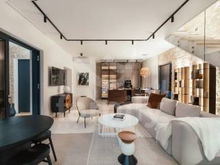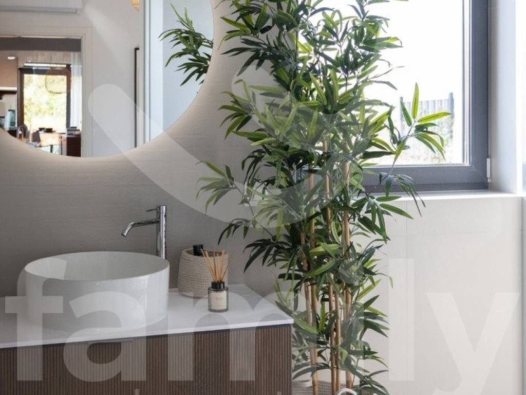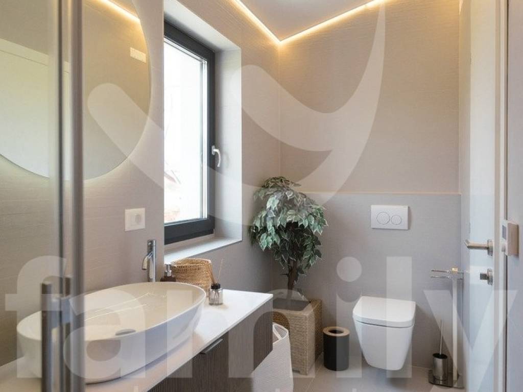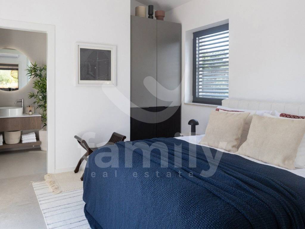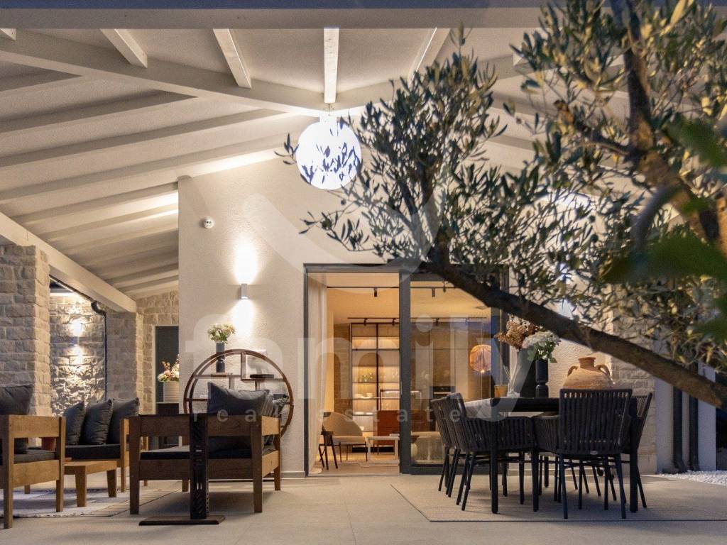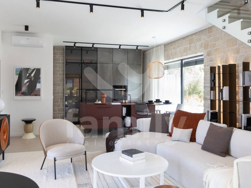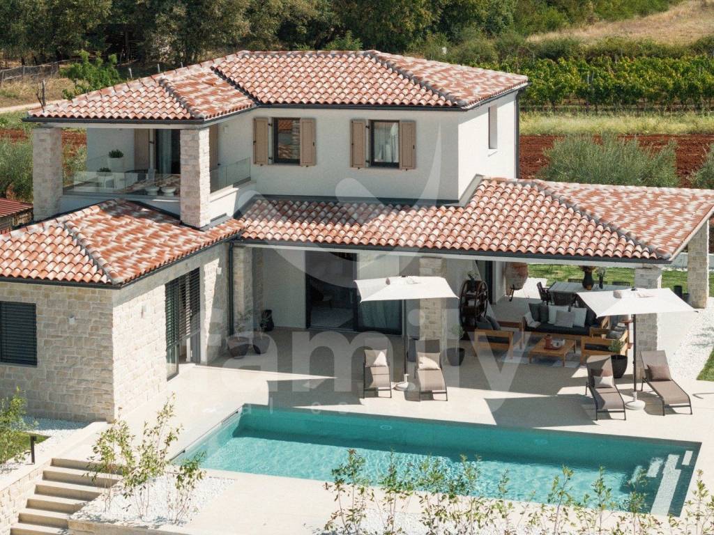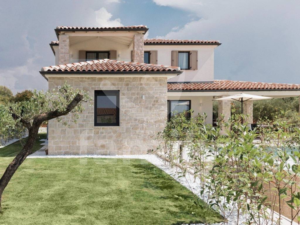 Not far from Poreč in a quiet village is located this spacious, luxurious and authentic villa of 165 m2 on a plot of 585 m2. This prestigious property extends over two floors, on the ground floor there is a spacious open concept living room with dining room and a modern and designer kitchen in which there are built-in quality Miele household appliances, a toilet, a bedroom with a bathroom, a technical room, while on the first floor there are two more bedrooms, each with its own bathroom and one of them has an exit to a terrace with a view of the sea. The property is extremely well equipped and every detail has been taken care of. The heating and cooling system is regulated by air conditioning in each room, and it also has underfloor heating via heat pumps. The floors throughout the house are covered with high-quality Italian ceramics, while the joinery is three-layer - aluminum with PVC shutters and mosquito nets, and on the ground floor there are also roller shutters with electric lifts. The yard is meticulously maintained and there is a spacious and beautiful covered terrace that can be accessed from the living room, a sundeck, a summer kitchen, a heated pool of 40 m2. The villa is owned by the company and the price shown is without VAT.