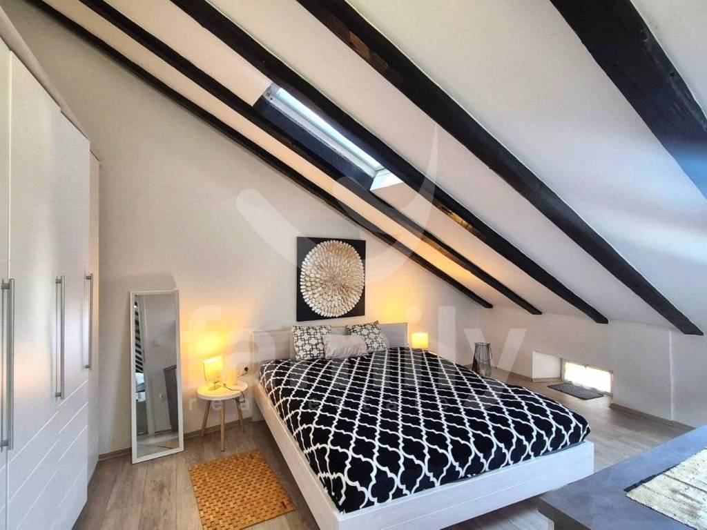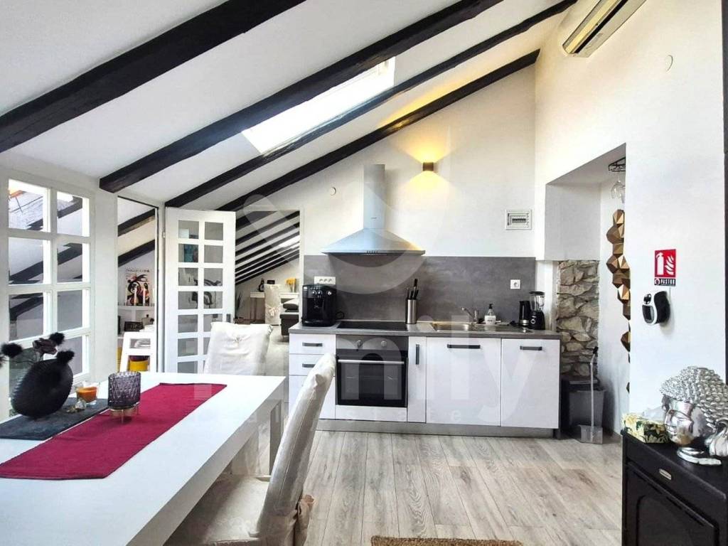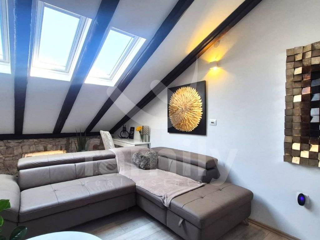 This attractive, spacious apartment of 62 m2 is located on the third floor of a multi-story building, close to the center of Pula. The apartment is located in the attic and consists of: entrance hall, bathroom, living room, kitchen with dining room, one bedroom and a closed terrace. The apartment is sold furnished and decorated. A wood-burning stove is used for heating, and three air conditioning units are used for cooling, one in each room. Laminate flooring is laid in all rooms. There is a possibility to convert the living room into another bedroom. There is a private parking lot in the courtyard of the building.