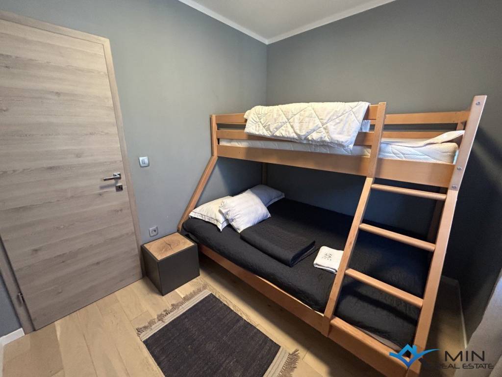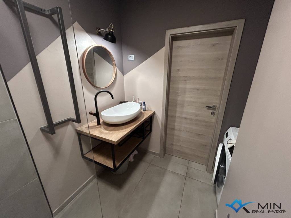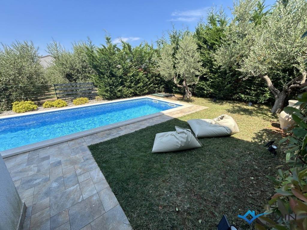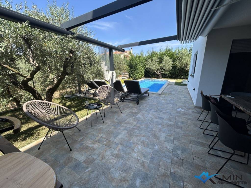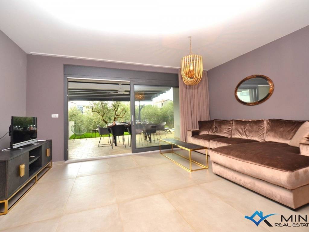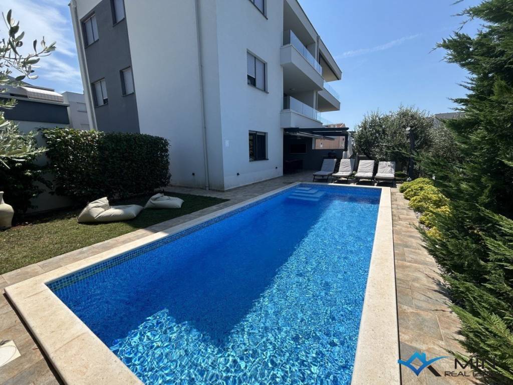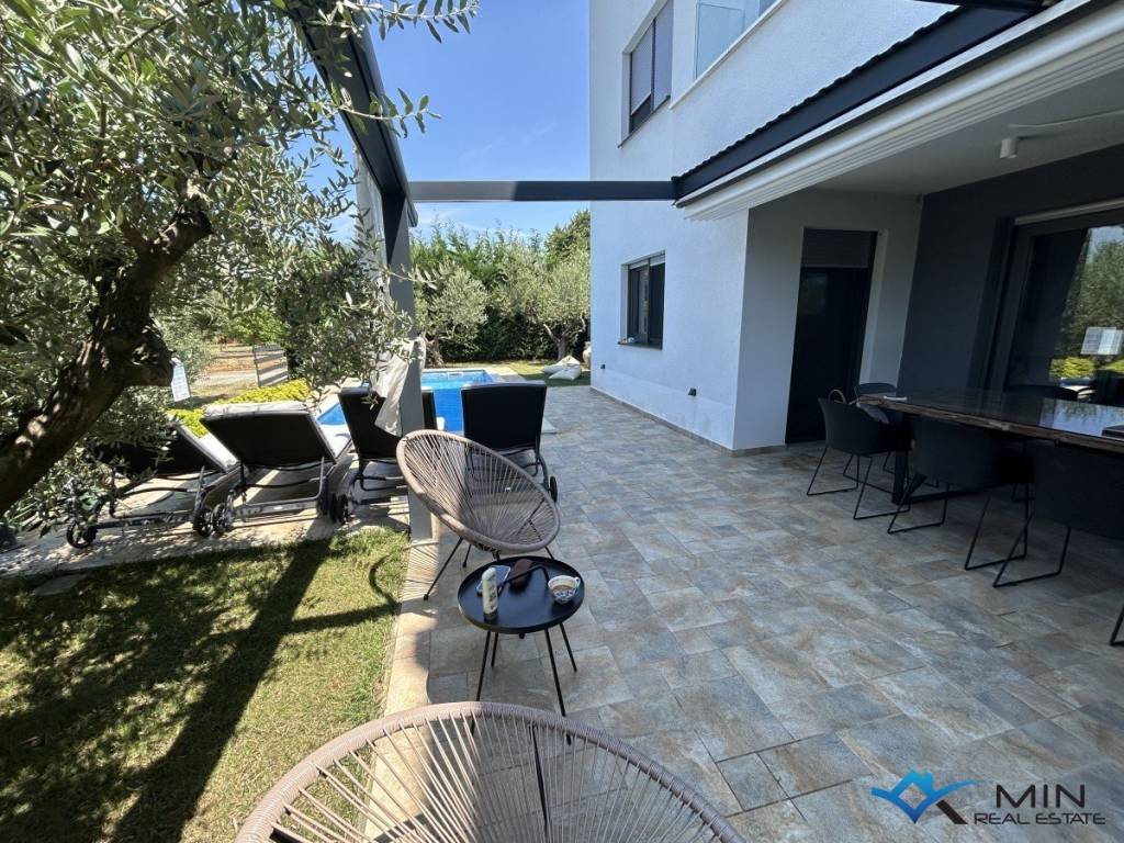 An apartment with a sea view is for sale in a quiet location surrounded by an olive grove. The apartment is located on the ground floor of a building with a total of 8 apartments. The apartment has 82 m2 and consists of a hallway, bathroom, 3 bedrooms and an open space room with a kitchen with a dining room and a living room with access to a terrace that is partially covered. The apartment has a beautifully landscaped garden of 172 m2 that is beautifully landscaped and has a swimming pool. Heating and cooling in the apartment is provided by air conditioning and underfloor heating. The apartment also has a private entrance through the courtyard, and the apartment has 1 parking space in front of the building. The distance from the sea and the beautifully landscaped beach is 900 m, and the city center is 1200 m away.
