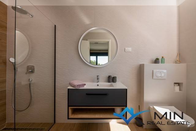 A modern villa for sale near Pula, located in the village of Krnica. The villa has 200 m and is spread over two floors: the ground floor and the first floor. The ground floor comprises an entrance hall, bathroom, bedroom with en-suite bathroom, kitchen with dining area, and a living room with access to a spacious courtyard of 884 m, where a 34 m swimming pool is situated. On the first floor there are three bedrooms, each with its own private bathroom, and two of the bedrooms have access to a terrace. The villa can be used for residential or tourist purposes.
