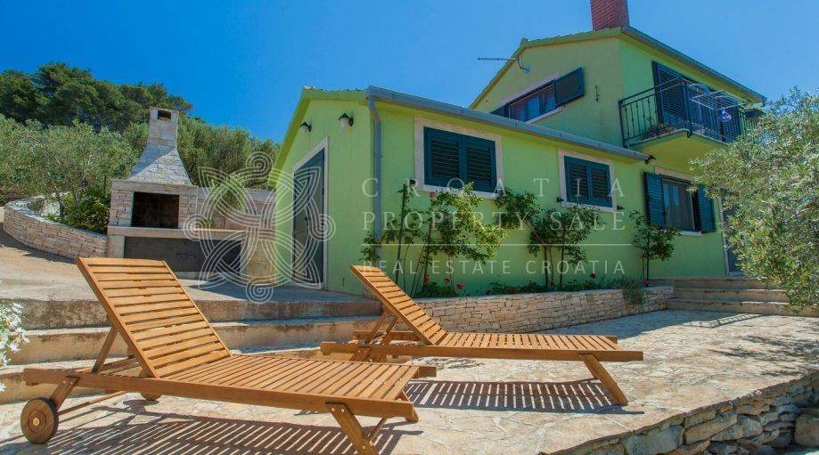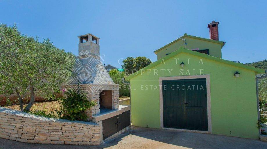 Croatia island Korcula house with sea view for sale offers stunning sea views and a peaceful setting, surrounded by 25 olive trees. The property spans 87 sq.m. and is situated on a 5 000 sq.m. lot, providing ample space and privacy.The house is spread across two floors and features 2 bedrooms, a bathroom, kitchen, dining room, and living room. With no neighboring houses, this property is ideal for a holiday home or rental opportunity.In front of the house, you'll find a lovely garden, outdoor fireplace, and deck chairs, perfect for relaxing while enjoying the views. Additional features include solar panels, air conditioning, and a wood stove for year-round comfort.