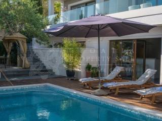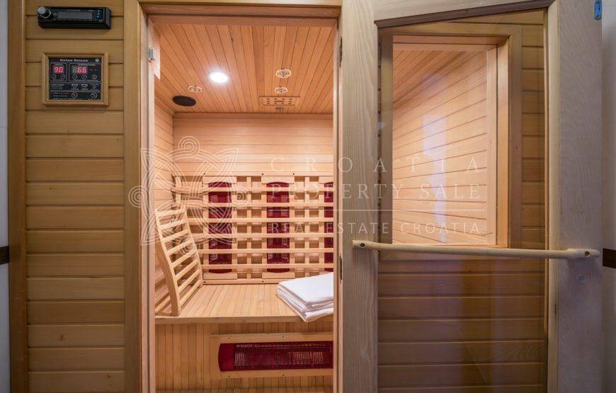 Villa is a high luxury 5-star villa situated on beautiful location. Consists of 5 bedrooms with bathrooms. Swimming pool with massage tips and counter-current swimming, sauna with infrared LED chromotherapy and professional massage equipment, all settled in walled, lush greenery with palm trees and Mediterranean plants that surround the pool and the villa offering privacy during the morning swim or lounging at the terrace. Large terraces overlooking the beach and sea are meant for romantic dinners outside or lunch in the shade of palm trees. For a complete outside dining experience, there is an outdoor barbecue and a bar with a sound system.