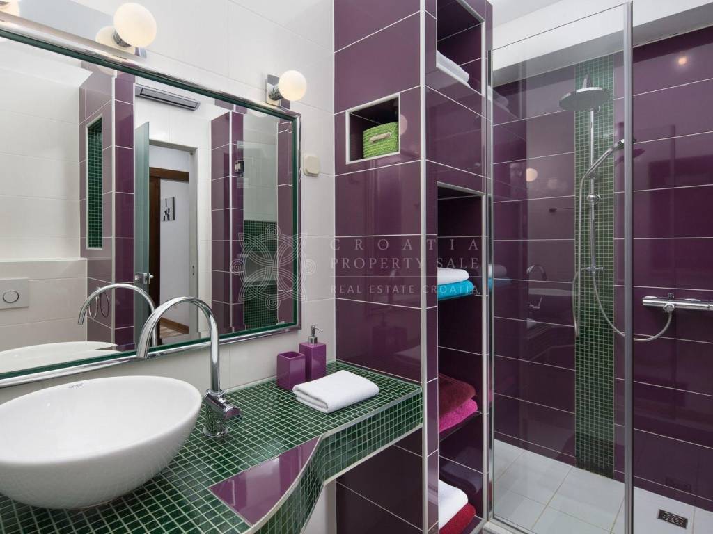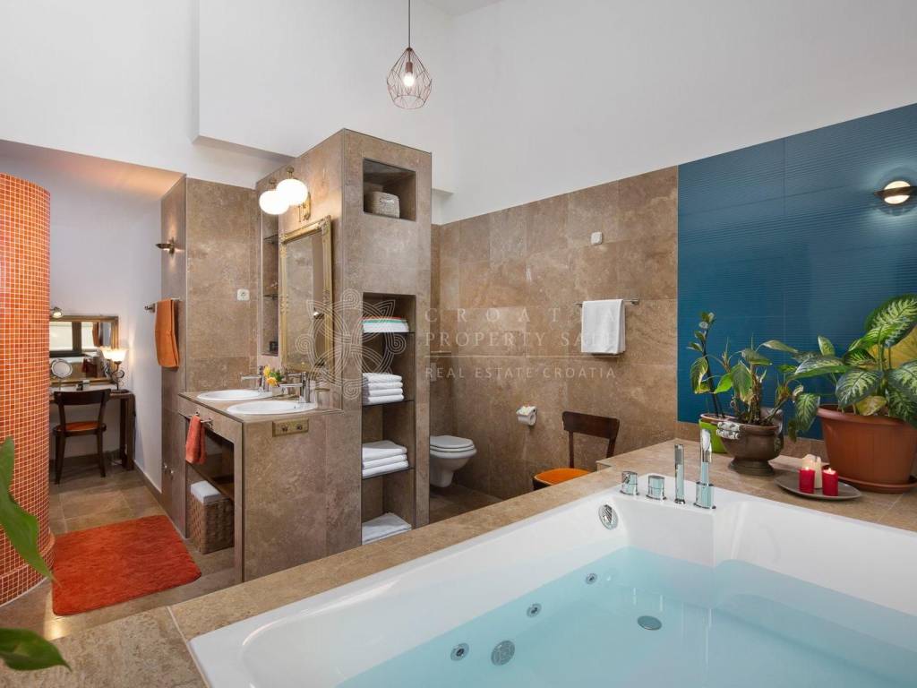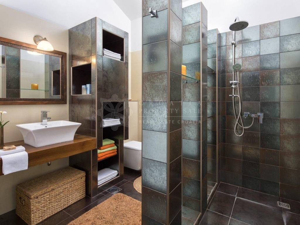 Villa has 4 double bedrooms and 1 twin bedroom on the gallery. Outdoor swimming pool has 40 sq.m. with the possibility of heating (integrated counter-current, vertical and horizontal massage, outdoor shower by the pool, bathroom with shower under the pool and gym). There are also outdoor and indoor grill, safe, hydro massage bathtub, gym, playground, outdoor bowling court, olives, and vegetable garden. The whole Villa is air-conditioned with built-in floor heating for colder weather. Villa has garage parking for 2 cars and 3 outdoor parking places. Villa has 3 floors.