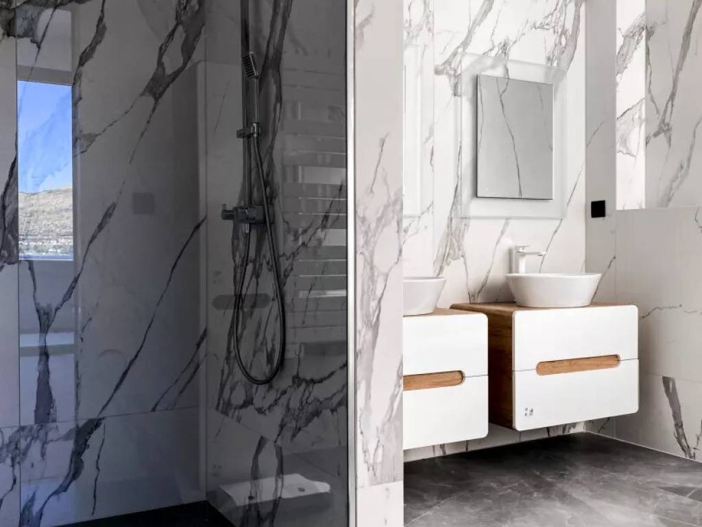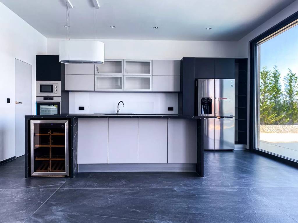 This modern contemporary residence has the living area of 349 sq.m., consisting of a large living room, fully installed modern kitchen, 5 bedrooms, 5 well-equipped bathrooms, and a two-car garage. Large seafront terraces are the central area for gathering by the pool or for an outdoor lunch or dinner. The terrace on the ground floor is fitted with an illuminated heated pool. The large terrace on the second floor has a Jacuzzi.