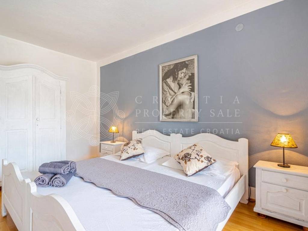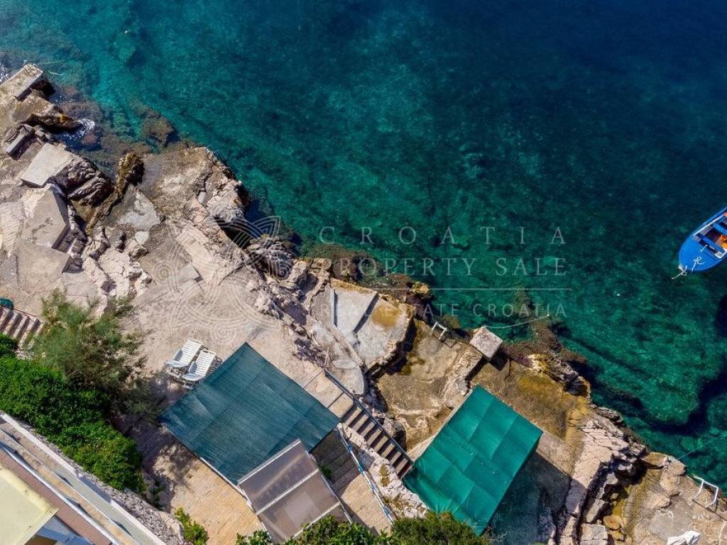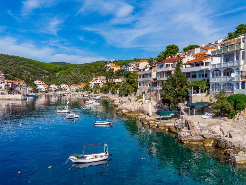 Croatia Korcula island waterfront residence for sale has 5 apartments, an attached garage and room for a boat mooring right in front of it! The total living space for this property is 396 sq.m.and includes 8 bedrooms, 5 kitchens, 5 bathrooms, 4 storage rooms and a garage on its 224 sq.m. plot.