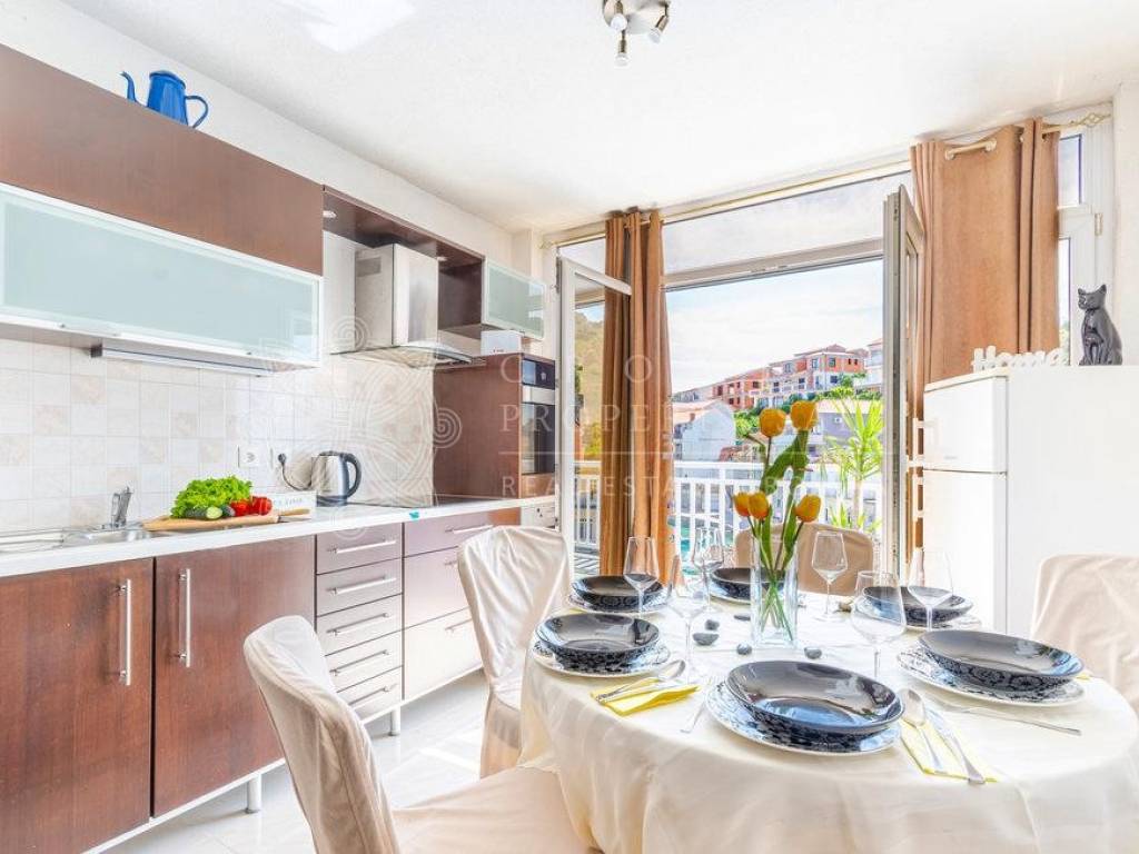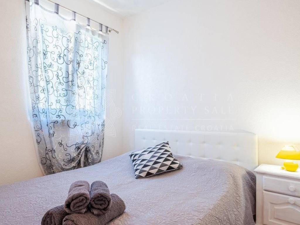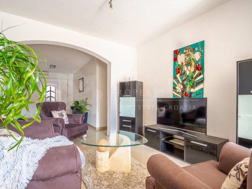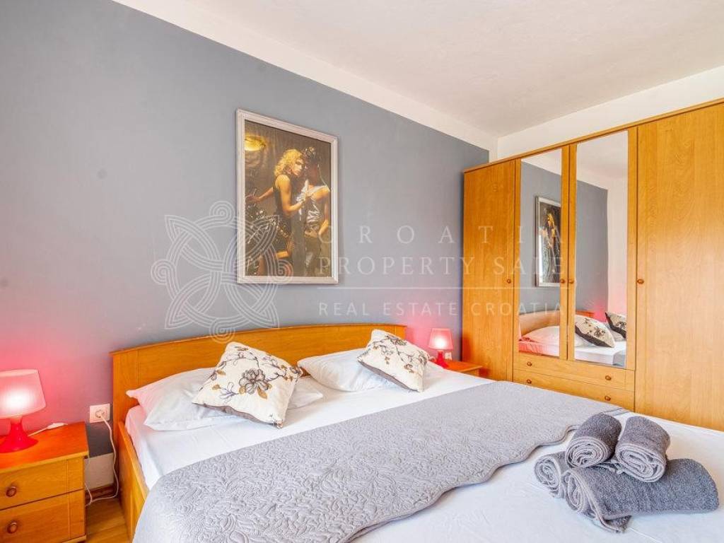 On the ground floor there is an attached garage with one-room apartment (57 sq.m.). On the first floor there are two apartments (115 sq.m.), 2 balconies and 2 storage rooms. On the second floor there is a three-room apartment with terrace (146 sq.m.) as well as 3 storage rooms. In addition to these apartments, there is also an attic floor apartment with calculated area of 78 sq.m. This apartment has loggia where you can enjoy in astonishing sea views. There is additional separate room with barbecue and a terrace on this attic floor. House is selling fully furnished.