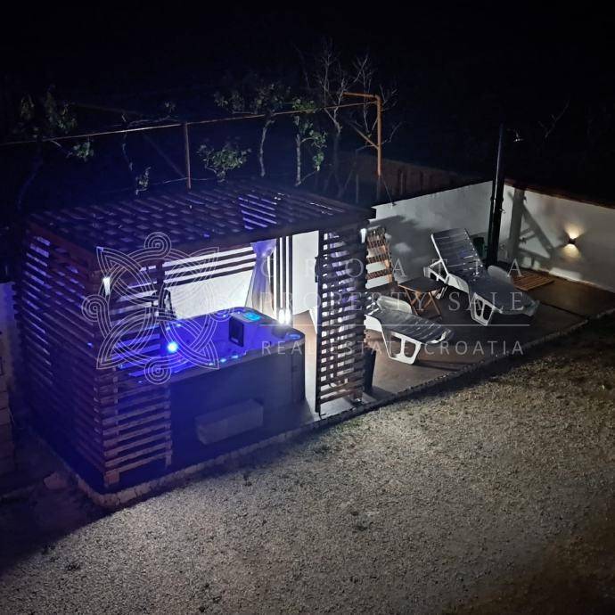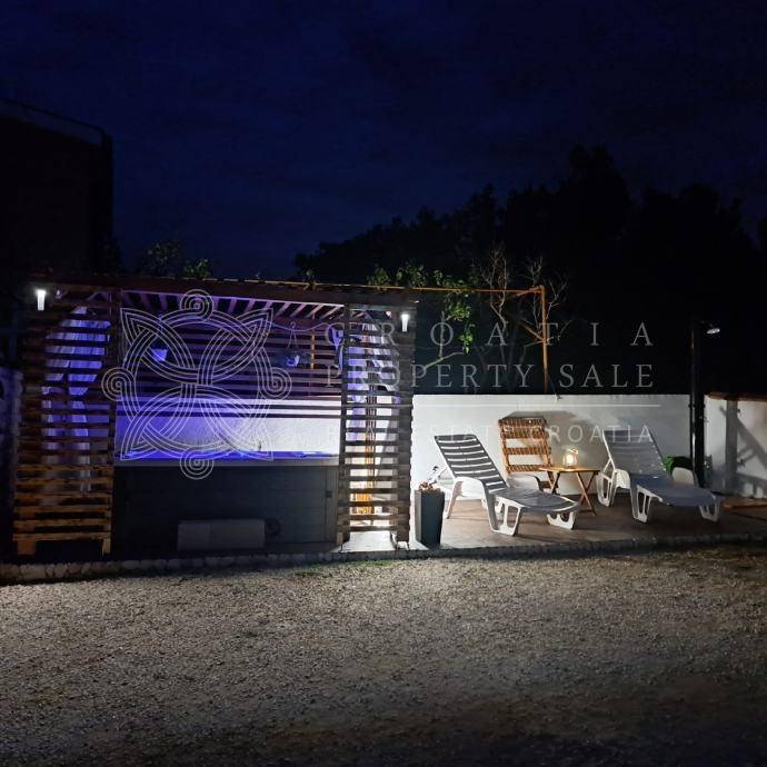 The yard is ideal for relaxing and entertaining, with a stone fireplace, a summer kitchen, a jacuzzi with a shower and sun loungers, and a vegetable garden with figs and Mediterranean plants. The garage can fit two cars and there is parking space for three more. Total size of this residence is about 250 m2 and land plot occupies 540 m2!