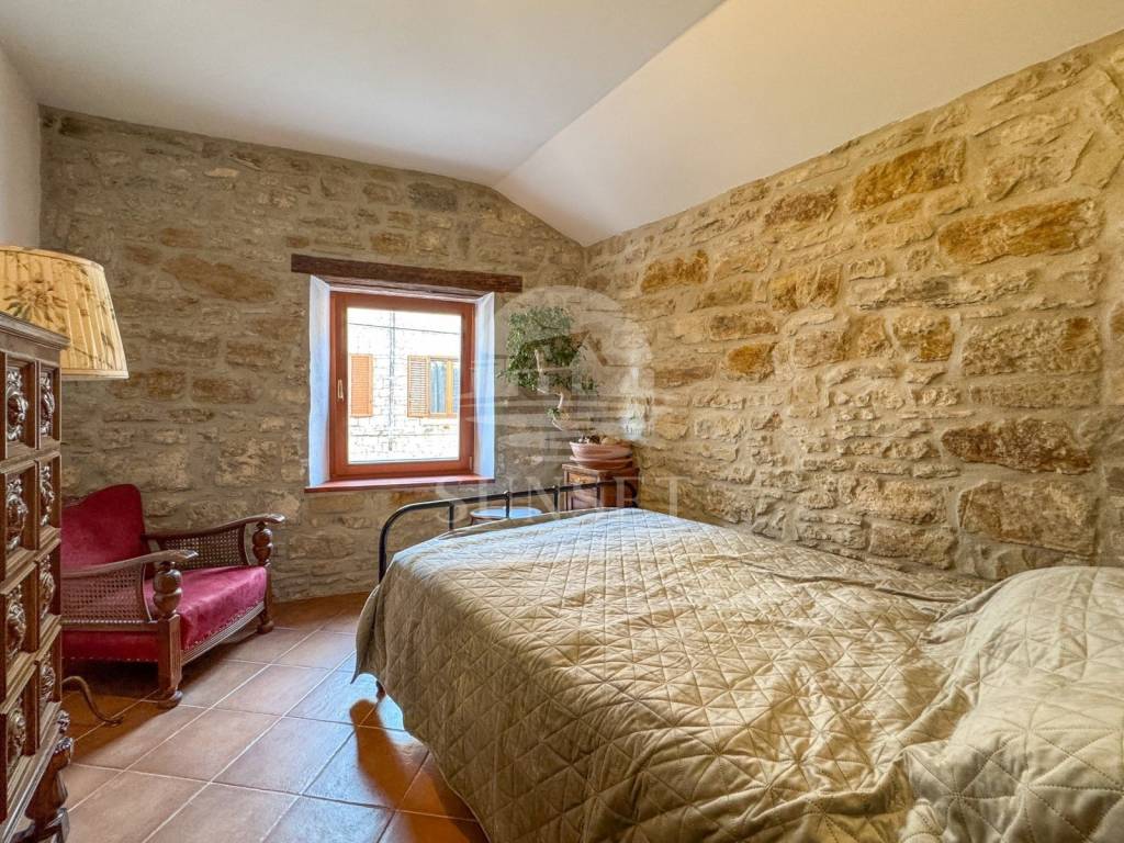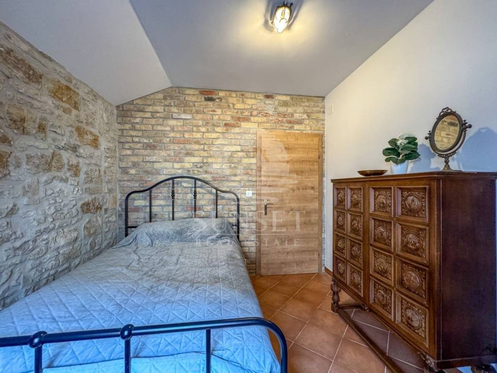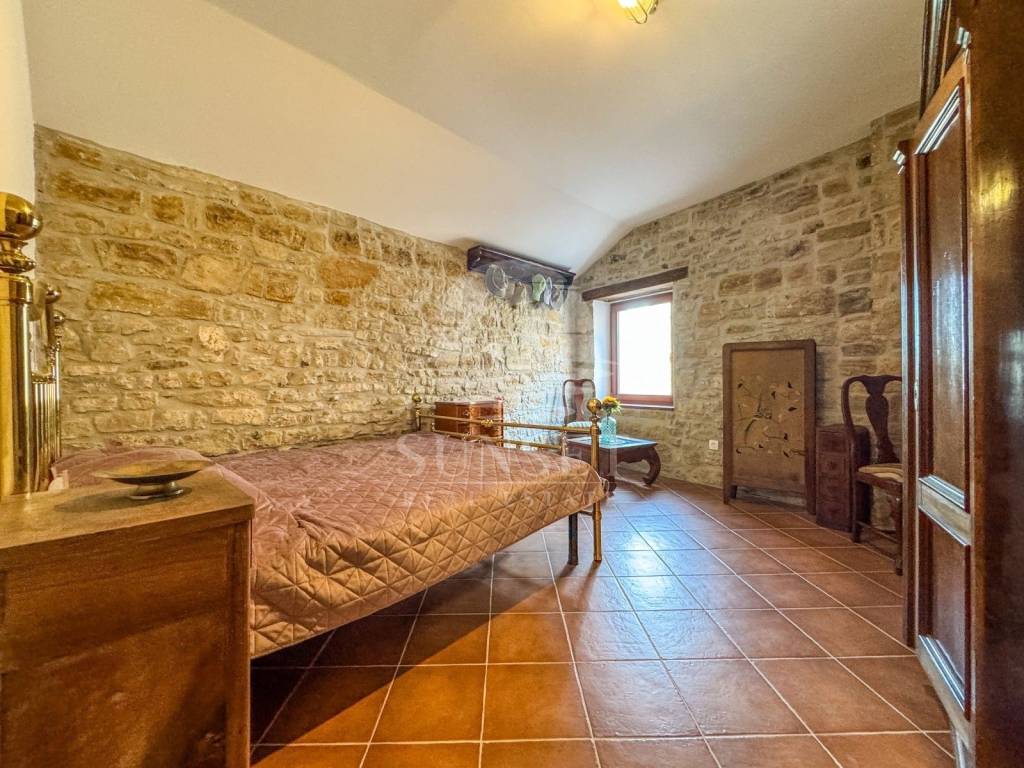 Upstairs are three bedrooms, two bathrooms, and a laundry room. The master bedroom has its own bathroom and walk-in closet, while the terrace offers views of the old town of Buje, surrounding hills, and the sea in the distance.
