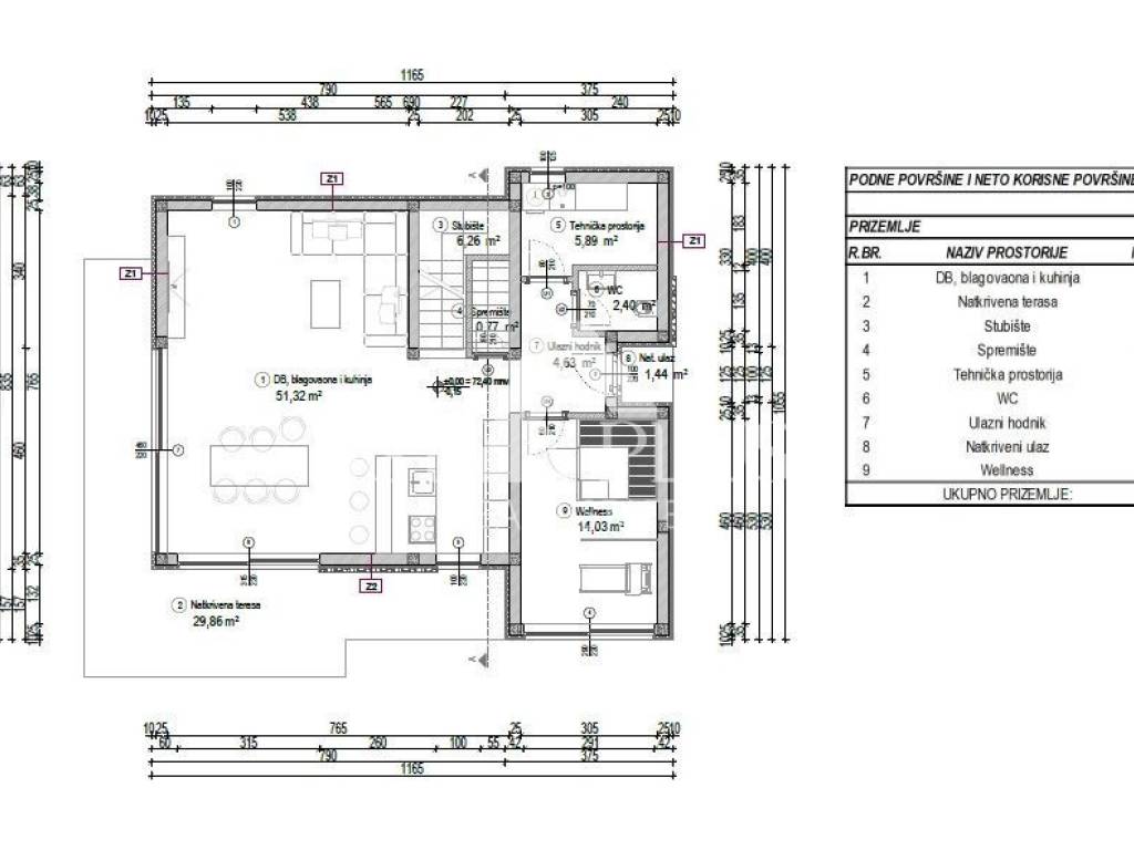 On the ground floor there is: a covered entrance, corridor, storage room, technical room, sauna and wellness, guest toilet, living room, kitchen and dining room according to the open space concept with access to a spacious covered terrace where there is a sunbathing area and a 27m swimming pool.