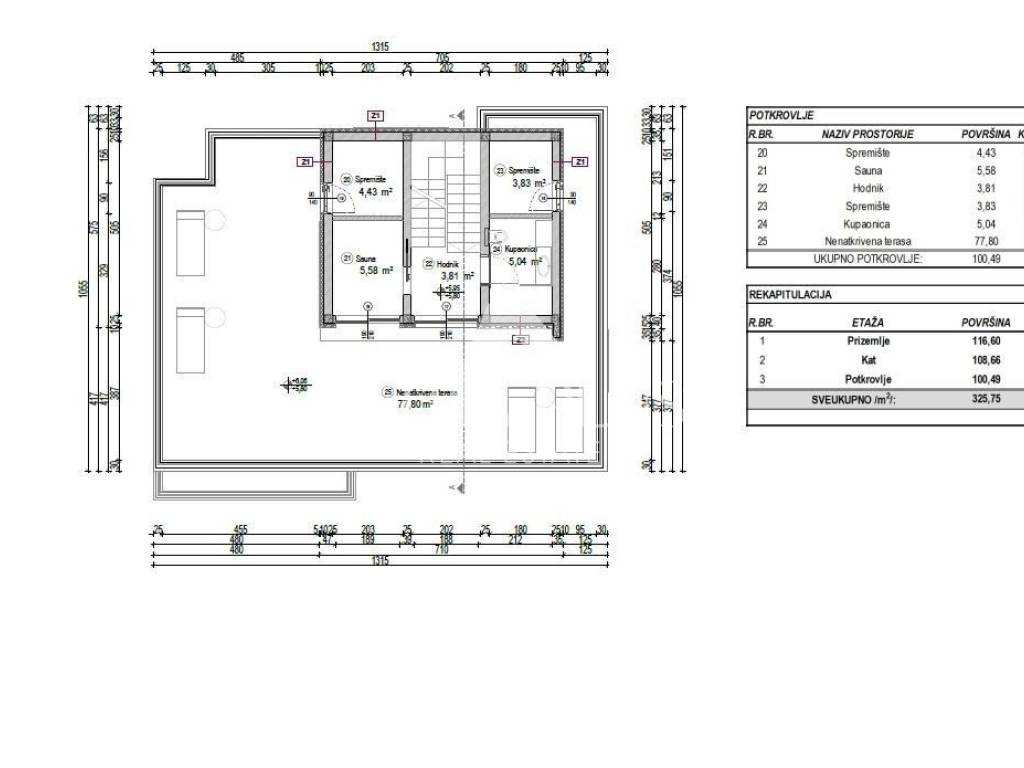 In the attic of the villa there is a corridor, a sauna, a bathroom, 2 storage rooms and a spacious terrace of 77.80 m with a beautiful view of the sea.