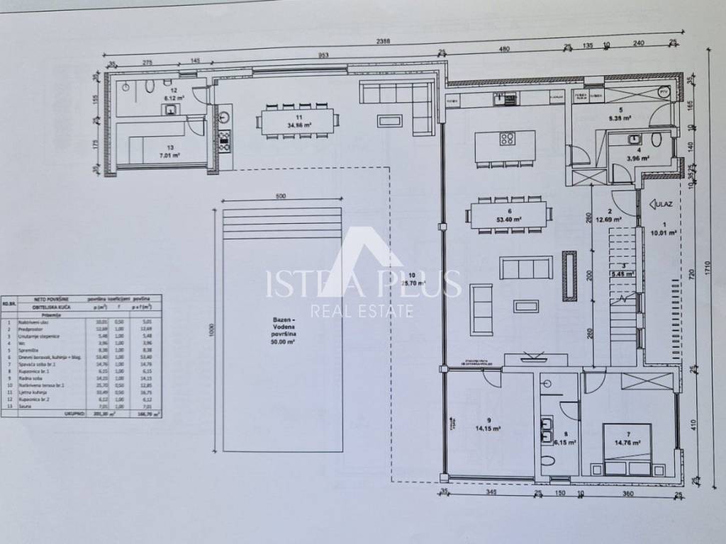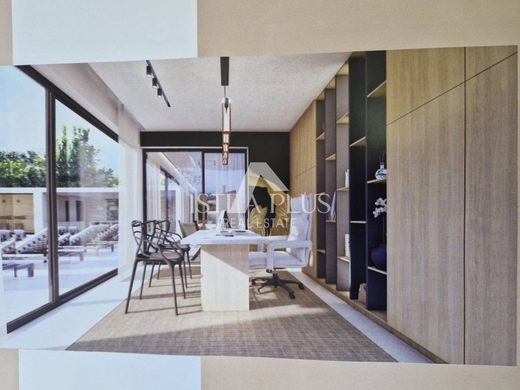 On the ground floor there is a covered entrance, through which you enter the villa, where there is a living room, a kitchen with a dining room, all according to the open space concept, a storage room with a laundry room, a guest toilet, a bedroom with its own bathroom and a study. In the living room and dining room, there is a glass sliding wall that leads to the yard, where there is a covered terrace, a sun deck, a heated pool of 50 m2, a spacious summer kitchen, a sauna and a bathroom.
