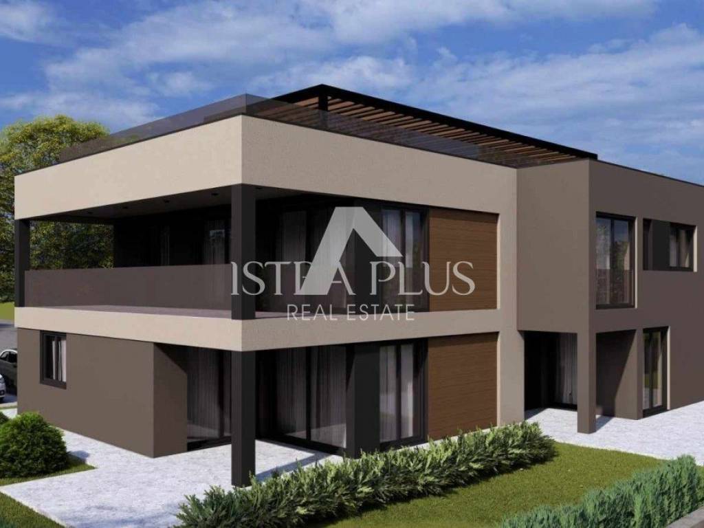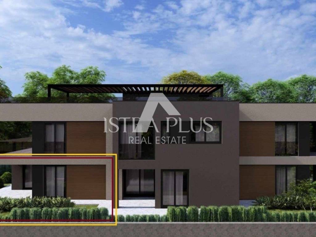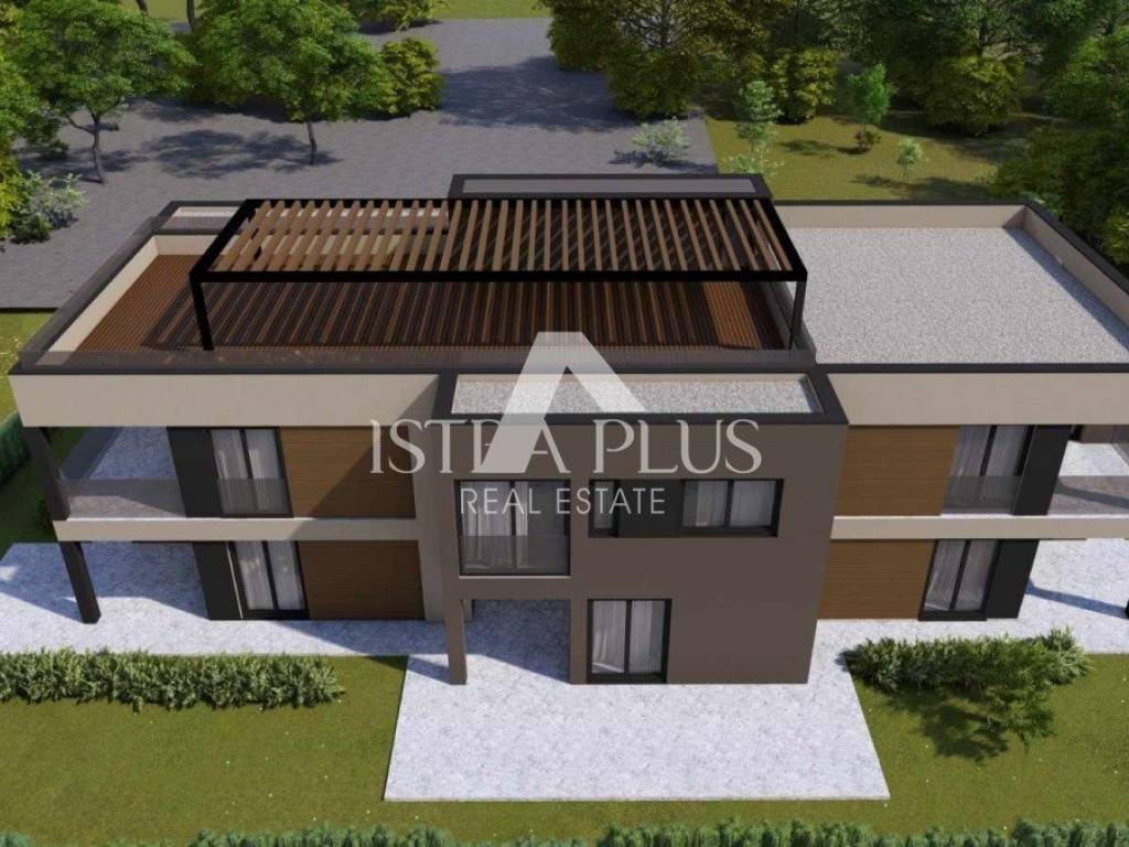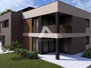 In a quiet village near Poreč, only 4 km from the city and the sea, apartments are for sale in a new modern building with a total of five residential units. The apartment is on the ground floor with a total area of 68.03 m, which also includes a terrace of 8.99 m and a spacious garden of 120 m. The apartment consists of an entrance hall, bathroom, two bedrooms and a living room with a kitchen and dining room, which opens onto a covered terrace connected to the garden.