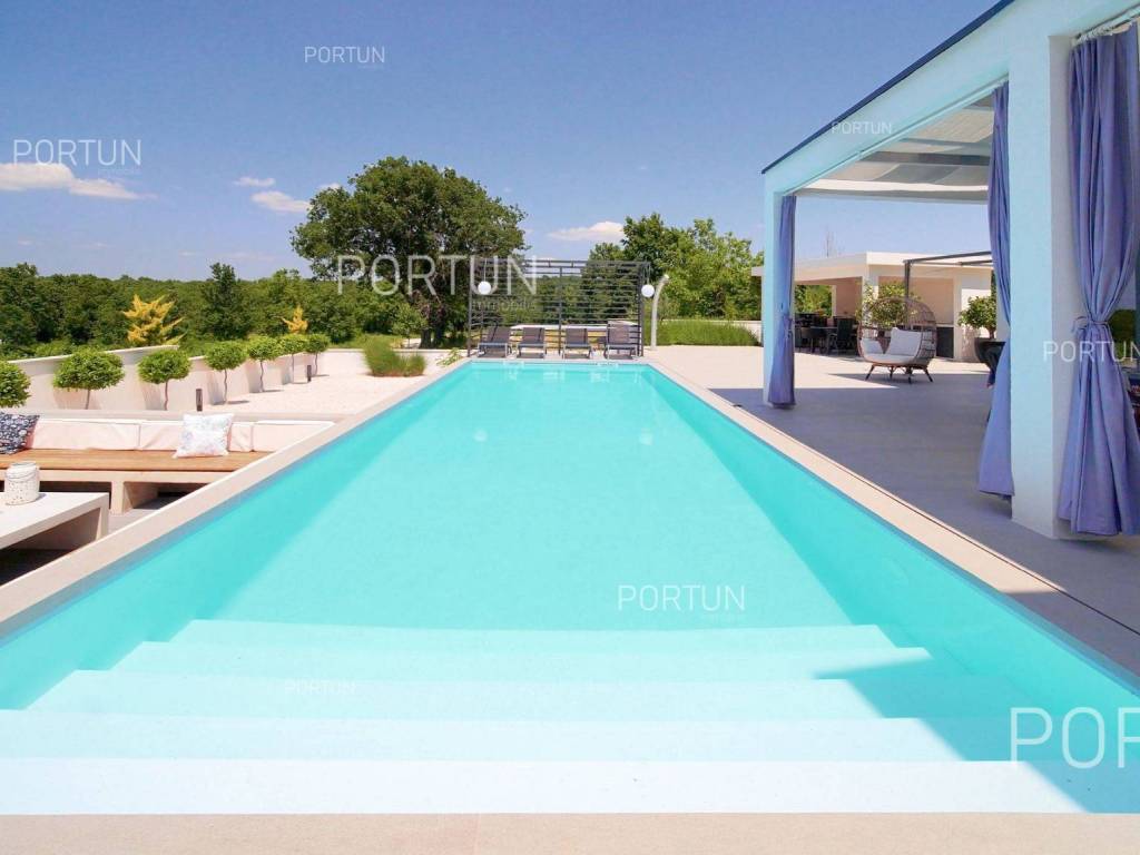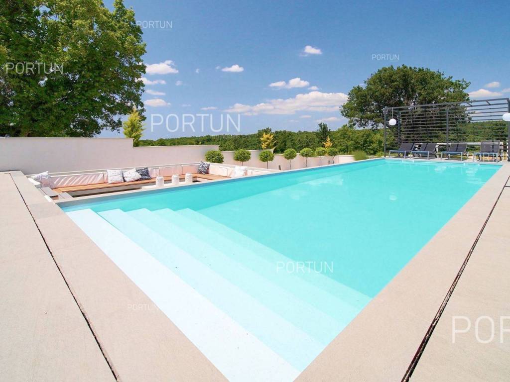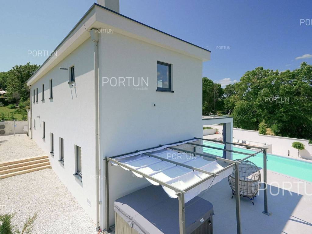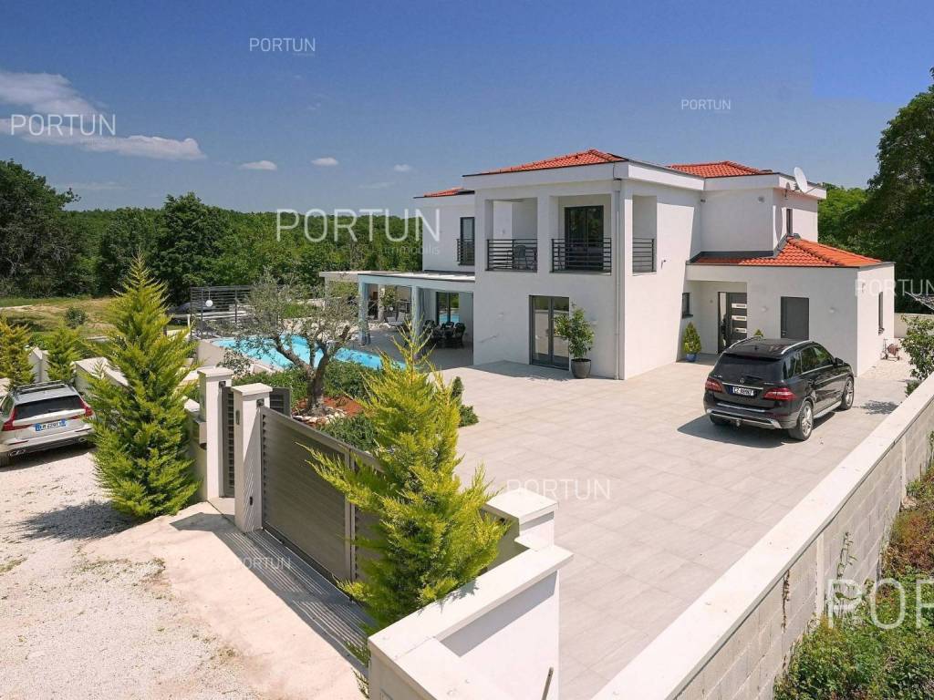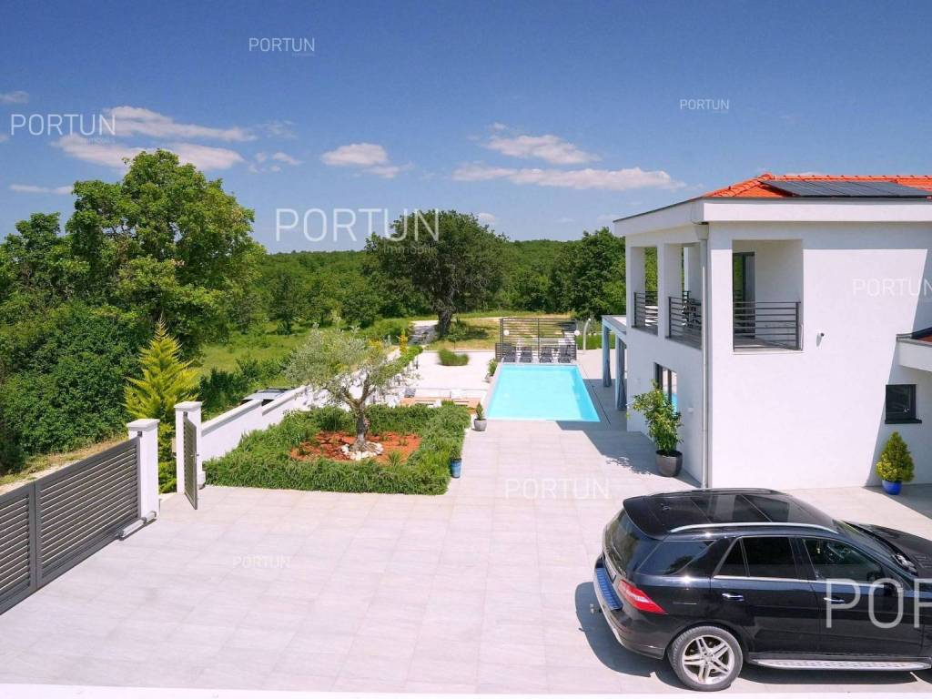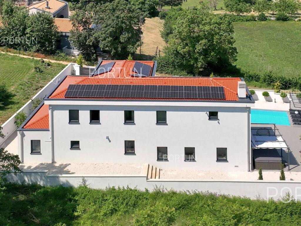 A contemporary villa with four bedrooms, a voluminous living room and a luxurious relaxation area is located in a quiet, rural setting in western Istria and offers a sea view and greenery. The modern interior offers all the necessary comfort for 8-10 guests, and the outdoor area is divided into several zones for relaxation and enjoyment under the open sky.The ground floor is dominated by a bright and airy living room decorated in neutral tones, decorated with minimalist lighting and modern furniture. A few steps above the living room is the dining and food preparation area. The superbly equipped L-shaped kitchen is modernly designed, and in the center there is a kitchen island with a hanging hood. On the ground floor we find another bedroom with bathroom, toilet and laundry room. The first floor is reserved for bedrooms, of which there are three, each with its own bathroom, while the master bedroom is additionally equipped with a large terrace with a view of the sea.The outdoor area is modernly decorated and requires minimal maintenance, while at the same time guests are offered the option of staying in different zones. The central part of the yard is occupied by a rectangular blue swimming pool with a wide staircase, and right next to it there is a sunken lounge area, which is ideal for evening gatherings with friends by the fire pit. Hot days can be spent in the deep shade offered by the covered terraces or in the pleasant shade offered by the summer kitchen. Here you can prepare various dishes on the grill, with the inevitable enjoyment of Istrian wines. If you want a massage and relaxation in the bubbles, it is enough to leave the living room and you can refresh yourself in the hydromassage tub.In order to reduce electricity consumption, photovoltaic panels with a total power of 10.7 kW were placed on the roof, and the house is equipped with a water softening system.In short, this villa on the edge of a small village near Kanfanar offers a peaceful environment in a natural setting. It contains four bedrooms with private bathrooms, a view of the sea from the first floor, a spacious living room with large glass openings, a covered terrace with a summer kitchen, a long swimming pool with a sun deck, an outdoor area for socializing, a modern kitchen with an island, a living room with a fireplace, a private parking for five cars and potential for investment in real estate and summer tourist rental.LocationIstria represents an ideal combination of crystal clear sea, hills and valleys, playful rivers and waterfalls, sun-drenched vineyards and numerous historical and cultural sights. Idyllic rural location in the western part of Istria, where the villa is situated, offers numerous amenities:Sea Beach 20 km Services Food store 7 km Elementary School 7 km Health center 25 km Pharmacy 7 km Marina 20 km Sports and fun Basketball court 7 km Water Park Aquacolors 21,6 km Special forest vegetation reserve "Kontija" 13 km Traffic Nearest highway entry 9 km Pula Airport 43 km About the propertyThe estate which extends to 984 square meters comprises: House 4 Bedrooms 4 Bathrooms 2 Floors 228,25 m2Summer kitchen 1 Floor 15,00 m2Swimming pool 48,00 m2LayoutThe modern villa with an excellent layout, with 228 square meters, is spread over two floors, namely the ground floor and the 1st floor. Ground floor The entrance to the villa is on the ground floor. This 139,25 m2 floor includes a living room with kitchen and dining room, a bedroom with en suite bathroom, a covered terrace, a lavatory and a laundry. First floor Internal stone stairs lead to the upper level, that is to the 1st floor. This 89,00 m2 level features three bedrooms with en suite bathrooms. The three most important rooms in this villa are The living room with kitchen and dining room Ground floor 67,00 m2 West facing Sea View Exit to the terrace Large glass walls Modern sofa set Armchairs (3x) Coffee table TV Wood fireplace Piazzetta Modern lighting Island kitchen Equipped with household appliances Massive wooden table 6 ChairsThe summer kitchen with dining room 15,00 m2 West facing Sea View Single-line kitchen Gas grill Modern table 6 ChairsThe bedroom Ground floor 25,00 m2 West facing Exit to the yard Modern design Wardrobe closet Bathroom with shower Double bed Dressing table LightingParking spaces Parking for five carsAbout the villaThe entrance to the villa is on the ground floor level, on the west side, and vertical communication takes place via an internal staircase. The basic architectural characteristics of this modern villa are: Floors Ground floor + First floor Orientation West External walls Brick wall + Styrofoam insulation 10 cm Concrete slab floors Roof Pitched roof - Tondach E.P.C. Awaiting EPC Built in 2022Furniture and equipmentFurniture All furniture is included in the price Modern furniture Outdoor furnitureEquipment Video intercom Alarm system for the house Video surveillance Smart-house system Designer sanitary wareJoinery Aluminum joinery PVC joinery Curtains Mosquito screens Aluminum entry door Internal wooden doorsMultimedia TV in the living room Installation for TV in each bedroomFlooring Ceramic tilesHeating and cooling Underfloor heating Fan coils Heat pumps BAXI Combined water boiler Fireplace Living roomOutdoor spaceEquipment Outdoor lighting Drip irrigationGreen areas Mediterranean herbs Old olive tree Cypresses LavendersFences Leylandii cypress hedge Concrete wallDriveway Metal door Motor drive Wing openingPedestrian entrance Modern doors Video intercomOutdoor relaxation area Skimmer pool 48,00 m2 Concrete construction Pool liner: Foil Salt water (disinfection by chlorine electrolysis) Hydro massage bath Jacuzzi 6 Persons Sunbathing area Deckchairs Solar shower Modern sofa setServices Connection to the power grid 18,2 kW Photovoltaic panels 10,7 kW Connection to the water supply network Water filtration system Nobel Biological waste water purifier Septic tank 40 m3 Unpaved public access road Distance to the pa