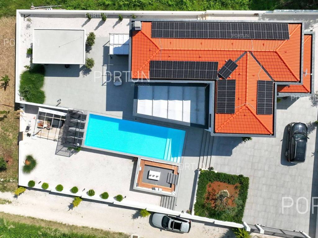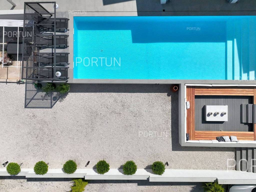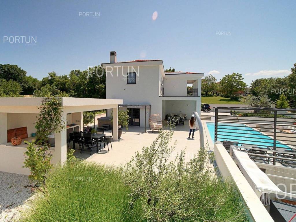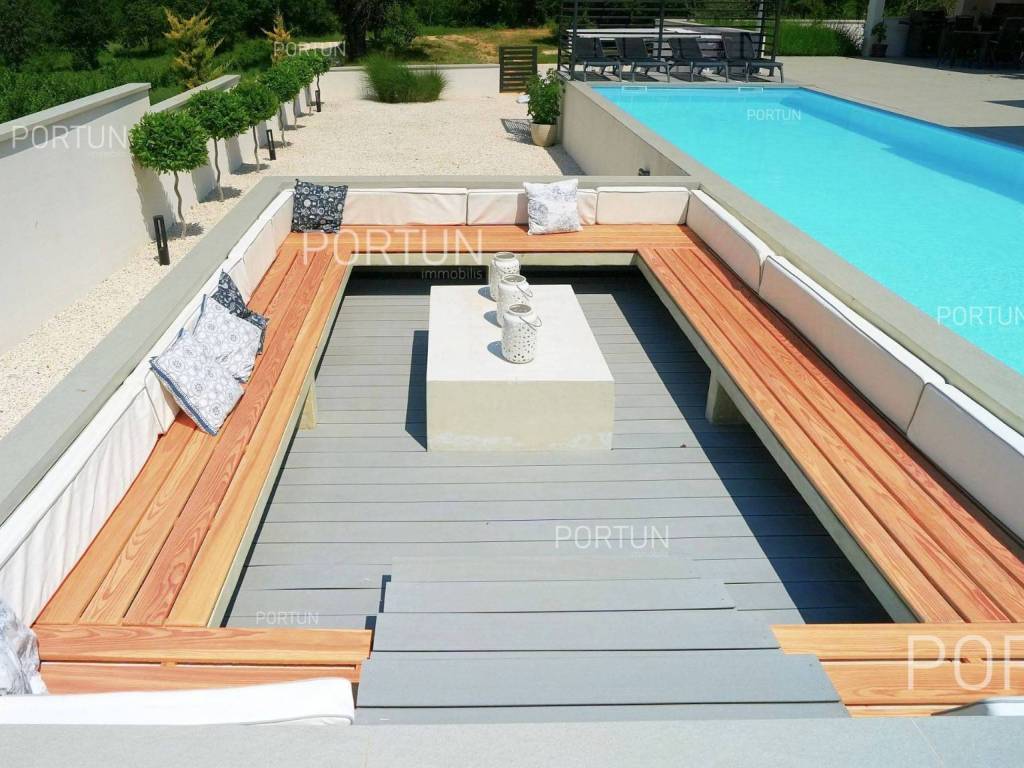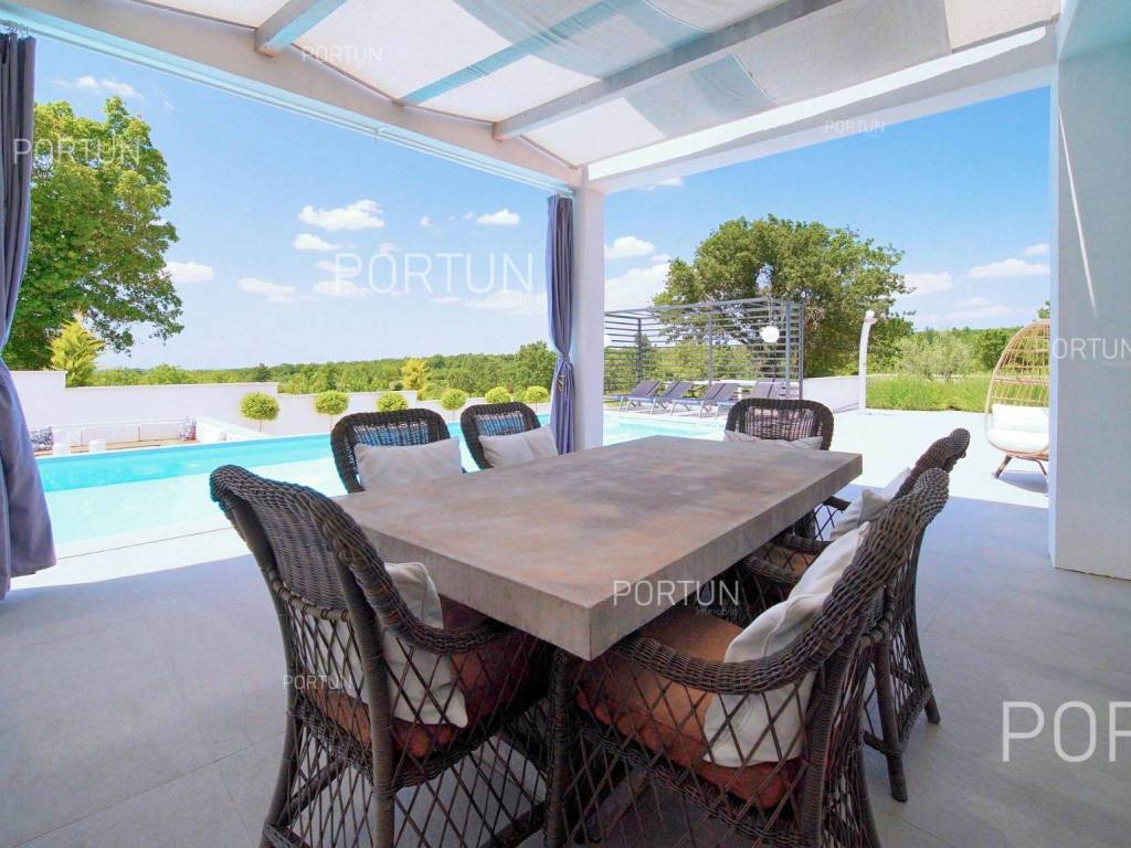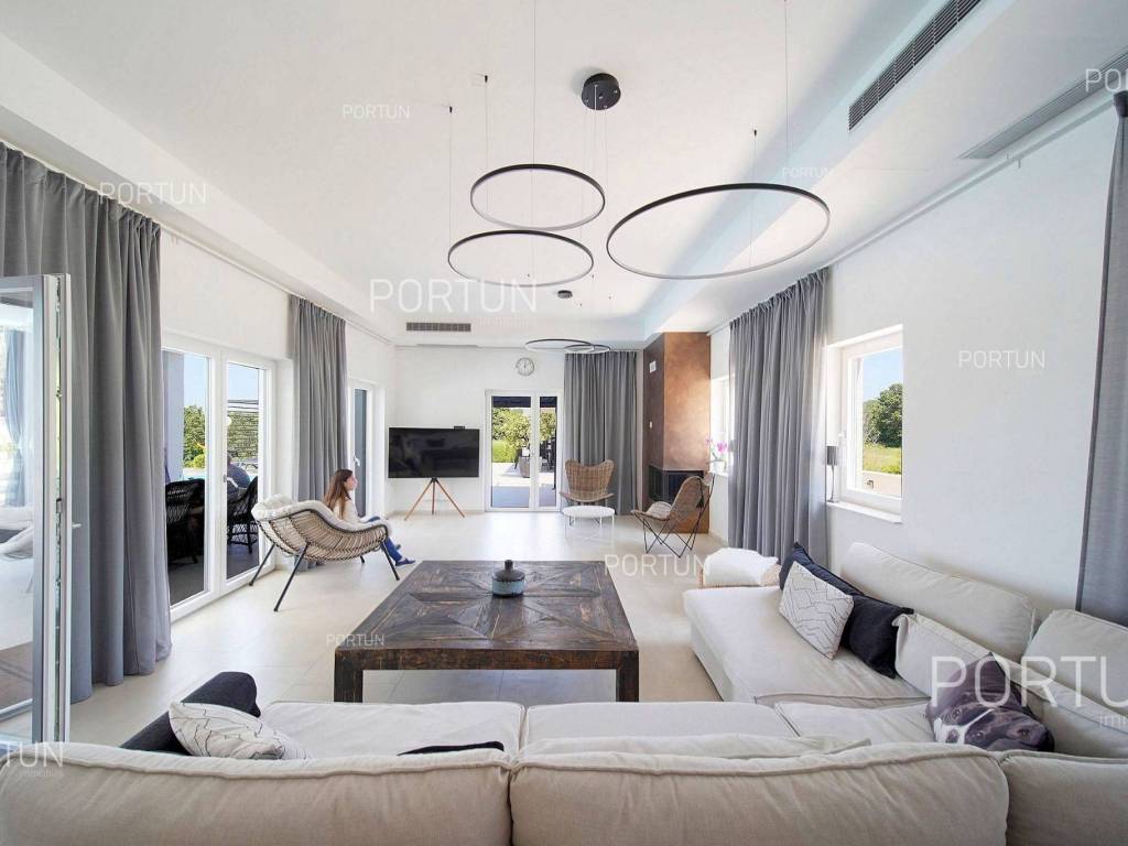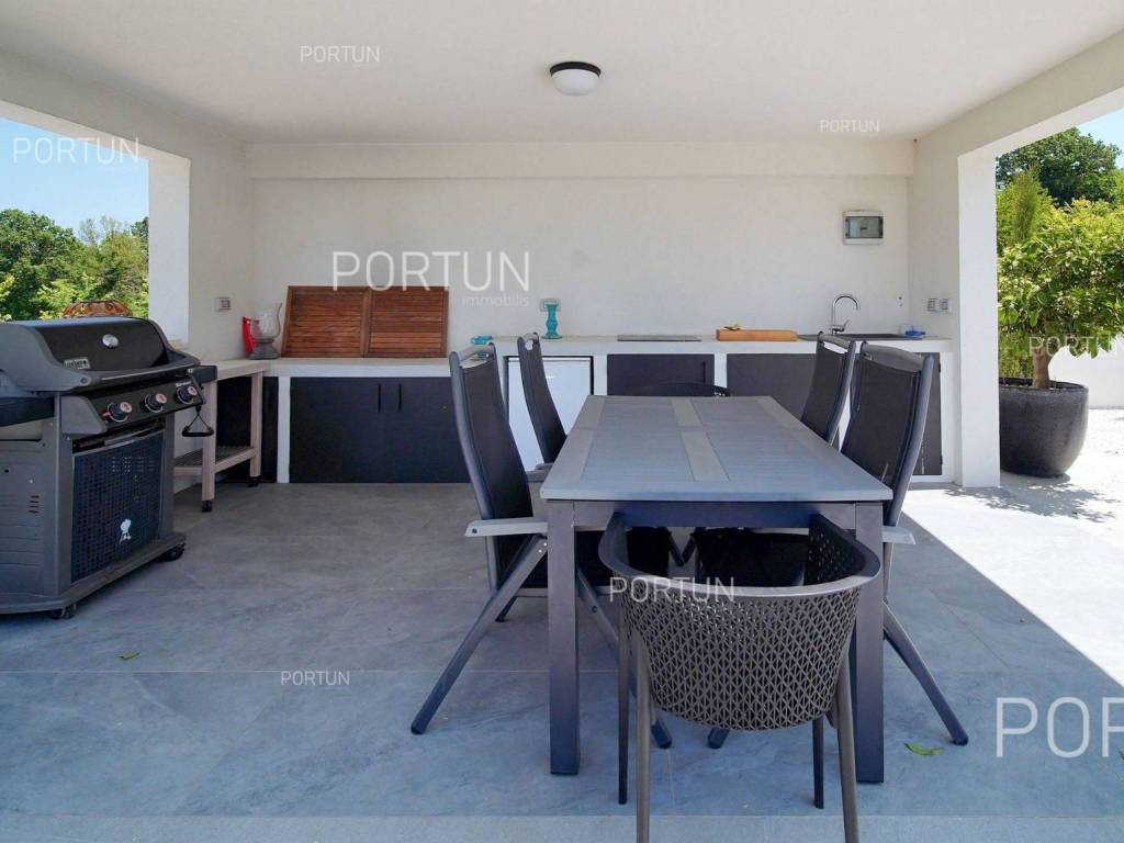 A contemporary villa with four bedrooms, a voluminous living room and a luxurious relaxation area is located in a quiet, rural setting in western Istria and offers a sea view and greenery. The modern interior offers all the necessary comfort for 8-10 guests, and the outdoor area is divided into several zones for relaxation and enjoyment under the open sky.The ground floor is dominated by a bright and airy living room decorated in neutral tones, decorated with minimalist lighting and modern furniture. A few steps above the living room is the dining and food preparation area. The superbly equipped L-shaped kitchen is modernly designed, and in the center there is a kitchen island with a hanging hood. On the ground floor we find another bedroom with bathroom, toilet and laundry room. The first floor is reserved for bedrooms, of which there are three, each with its own bathroom, while the master bedroom is additionally equipped with a large terrace with a view of the sea.The outdoor area is modernly decorated and requires minimal maintenance, while at the same time guests are offered the option of staying in different zones. The central part of the yard is occupied by a rectangular blue swimming pool with a wide staircase, and right next to it there is a sunken lounge area, which is ideal for evening gatherings with friends by the fire pit. Hot days can be spent in the deep shade offered by the covered terraces or in the pleasant shade offered by the summer kitchen. Here you can prepare various dishes on the grill, with the inevitable enjoyment of Istrian wines. If you want a massage and relaxation in the bubbles, it is enough to leave the living room and you can refresh yourself in the hydromassage tub.In order to reduce electricity consumption, photovoltaic panels with a total power of 10.7 kW were placed on the roof, and the house is equipped with a water softening system.In short, this villa on the edge of a small village near Kanfanar offers a peaceful environment in a natural setting. It contains four bedrooms with private bathrooms, a view of the sea from the first floor, a spacious living room with large glass openings, a covered terrace with a summer kitchen, a long swimming pool with a sun deck, an outdoor area for socializing, a modern kitchen with an island, a living room with a fireplace, a private parking for five cars and potential for investment in real estate and summer tourist rental.LocationIstria represents an ideal combination of crystal clear sea, hills and valleys, playful rivers and waterfalls, sun-drenched vineyards and numerous historical and cultural sights. Idyllic rural location in the western part of Istria, where the villa is situated, offers numerous amenities:Sea Beach 20 km Services Food store 7 km Elementary School 7 km Health center 25 km Pharmacy 7 km Marina 20 km Sports and fun Basketball court 7 km Water Park Aquacolors 21,6 km Special forest vegetation reserve "Kontija" 13 km Traffic Nearest highway entry 9 km Pula Airport 43 km About the propertyThe estate which extends to 984 square meters comprises: House 4 Bedrooms 4 Bathrooms 2 Floors 228,25 m2Summer kitchen 1 Floor 15,00 m2Swimming pool 48,00 m2LayoutThe modern villa with an excellent layout, with 228 square meters, is spread over two floors, namely the ground floor and the 1st floor. Ground floor The entrance to the villa is on the ground floor. This 139,25 m2 floor includes a living room with kitchen and dining room, a bedroom with en suite bathroom, a covered terrace, a lavatory and a laundry. First floor Internal stone stairs lead to the upper level, that is to the 1st floor. This 89,00 m2 level features three bedrooms with en suite bathrooms. The three most important rooms in this villa are The living room with kitchen and dining room Ground floor 67,00 m2 West facing Sea View Exit to the terrace Large glass walls Modern sofa set Armchairs (3x) Coffee table TV Wood fireplace Piazzetta Modern lighting Island kitchen Equipped with household appliances Massive wooden table 6 ChairsThe summer kitchen with dining room 15,00 m2 West facing Sea View Single-line kitchen Gas grill Modern table 6 ChairsThe bedroom Ground floor 25,00 m2 West facing Exit to the yard Modern design Wardrobe closet Bathroom with shower Double bed Dressing table LightingParking spaces Parking for five carsAbout the villaThe entrance to the villa is on the ground floor level, on the west side, and vertical communication takes place via an internal staircase. The basic architectural characteristics of this modern villa are: Floors Ground floor + First floor Orientation West External walls Brick wall + Styrofoam insulation 10 cm Concrete slab floors Roof Pitched roof - Tondach E.P.C. Awaiting EPC Built in 2022Furniture and equipmentFurniture All furniture is included in the price Modern furniture Outdoor furnitureEquipment Video intercom Alarm system for the house Video surveillance Smart-house system Designer sanitary wareJoinery Aluminum joinery PVC joinery Curtains Mosquito screens Aluminum entry door Internal wooden doorsMultimedia TV in the living room Installation for TV in each bedroomFlooring Ceramic tilesHeating and cooling Underfloor heating Fan coils Heat pumps BAXI Combined water boiler Fireplace Living roomOutdoor spaceEquipment Outdoor lighting Drip irrigationGreen areas Mediterranean herbs Old olive tree Cypresses LavendersFences Leylandii cypress hedge Concrete wallDriveway Metal door Motor drive Wing openingPedestrian entrance Modern doors Video intercomOutdoor relaxation area Skimmer pool 48,00 m2 Concrete construction Pool liner: Foil Salt water (disinfection by chlorine electrolysis) Hydro massage bath Jacuzzi 6 Persons Sunbathing area Deckchairs Solar shower Modern sofa setServices Connection to the power grid 18,2 kW Photovoltaic panels 10,7 kW Connection to the water supply network Water filtration system Nobel Biological waste water purifier Septic tank 40 m3 Unpaved public access road Distance to the pa