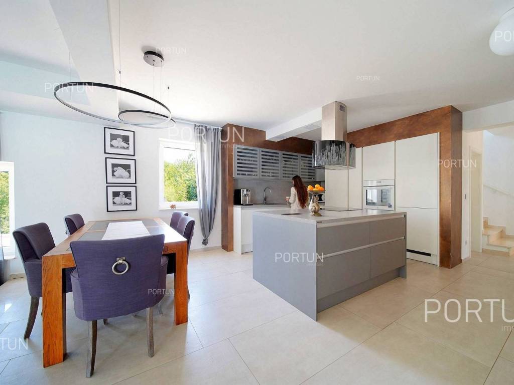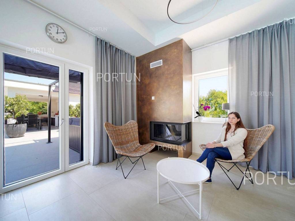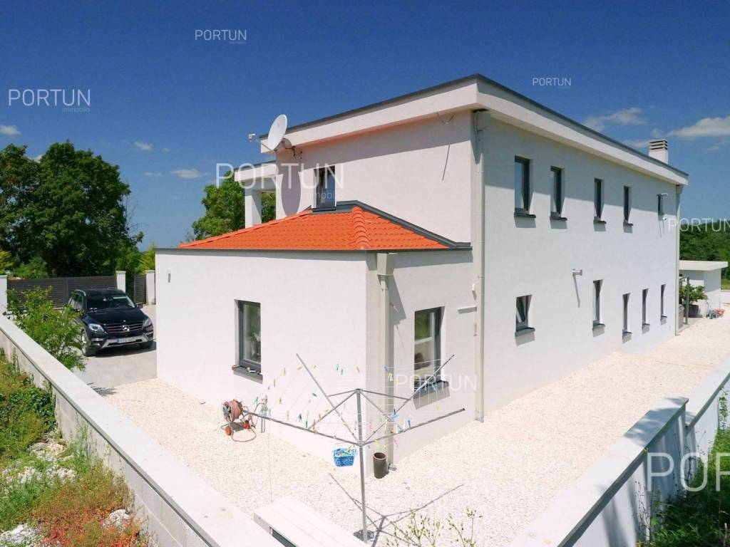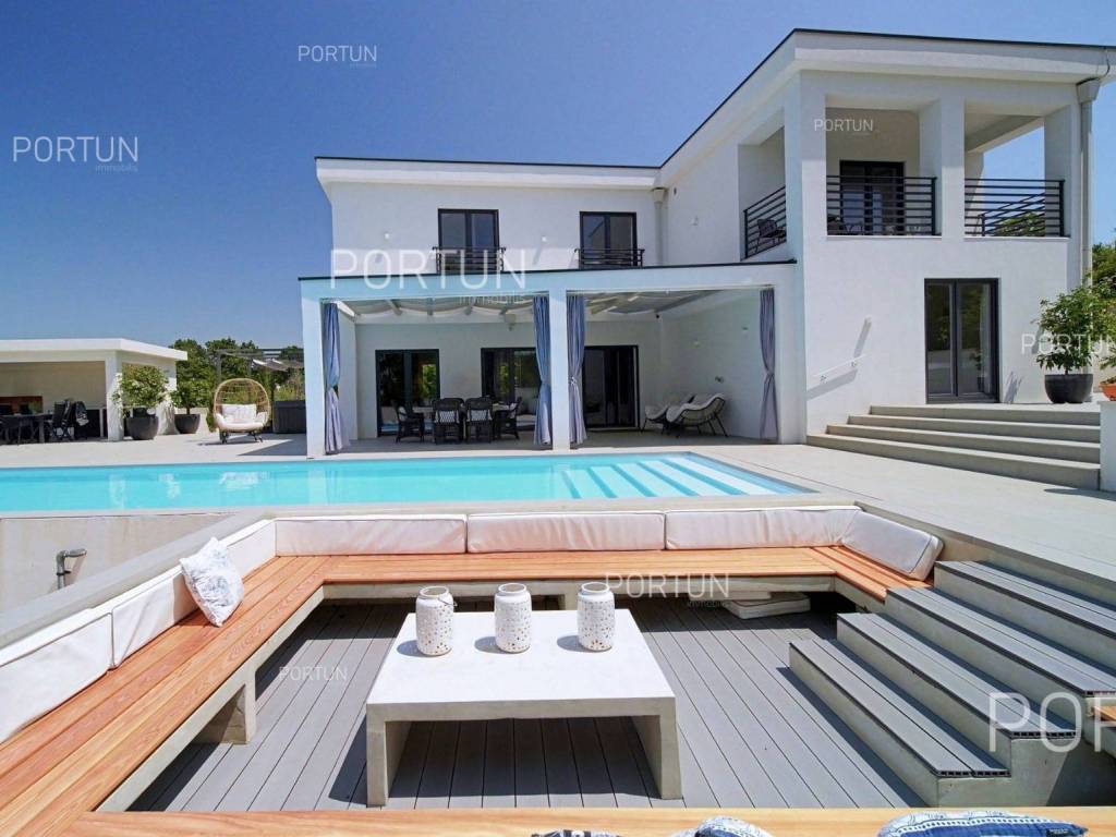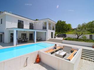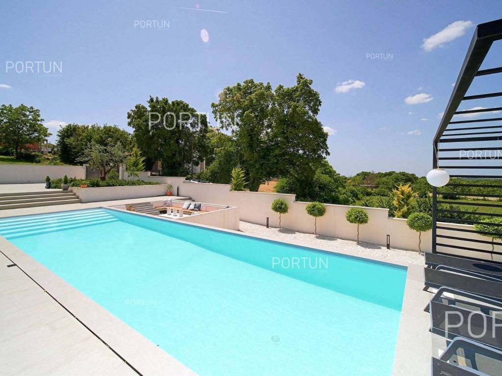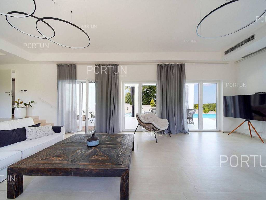 A contemporary villa with four bedrooms, a voluminous living room and a luxurious relaxation area is located in a quiet, rural setting in western Istria and offers a sea view and greenery. The modern interior offers all the necessary comfort for 8-10 guests, and the outdoor area is divided into several zones for relaxation and enjoyment under the open sky.The ground floor is dominated by a bright and airy living room decorated in neutral tones, decorated with minimalist lighting and modern furniture. A few steps above the living room is the dining and food preparation area. The superbly equipped L-shaped kitchen is modernly designed, and in the center there is a kitchen island with a hanging hood. On the ground floor we find another bedroom with bathroom, toilet and laundry room. The first floor is reserved for bedrooms, of which there are three, each with its own bathroom, while the master bedroom is additionally equipped with a large terrace with a view of the sea.The outdoor area is modernly decorated and requires minimal maintenance, while at the same time guests are offered the option of staying in different zones. The central part of the yard is occupied by a rectangular blue swimming pool with a wide staircase, and right next to it there is a sunken lounge area, which is ideal for evening gatherings with friends by the fire pit. Hot days can be spent in the deep shade offered by the covered terraces or in the pleasant shade offered by the summer kitchen. Here you can prepare various dishes on the grill, with the inevitable enjoyment of Istrian wines. If you want a massage and relaxation in the bubbles, it is enough to leave the living room and you can refresh yourself in the hydromassage tub.In order to reduce electricity consumption, photovoltaic panels with a total power of 10.7 kW were placed on the roof, and the house is equipped with a water softening system.In short, this villa on the edge of a small village near Kanfanar offers a peaceful environment in a natural setting. It contains four bedrooms with private bathrooms, a view of the sea from the first floor, a spacious living room with large glass openings, a covered terrace with a summer kitchen, a long swimming pool with a sun deck, an outdoor area for socializing, a modern kitchen with an island, a living room with a fireplace, a private parking for five cars and potential for investment in real estate and summer tourist rental.LocationIstria represents an ideal combination of crystal clear sea, hills and valleys, playful rivers and waterfalls, sun-drenched vineyards and numerous historical and cultural sights. Idyllic rural location in the western part of Istria, where the villa is situated, offers numerous amenities:Sea Beach 20 km Services Food store 7 km Elementary School 7 km Health center 25 km Pharmacy 7 km Marina 20 km Sports and fun Basketball court 7 km Water Park Aquacolors 21,6 km Special forest vegetation reserve "Kontija" 13 km Traffic Nearest highway entry 9 km Pula Airport 43 km About the propertyThe estate which extends to 984 square meters comprises: House 4 Bedrooms 4 Bathrooms 2 Floors 228,25 m2Summer kitchen 1 Floor 15,00 m2Swimming pool 48,00 m2LayoutThe modern villa with an excellent layout, with 228 square meters, is spread over two floors, namely the ground floor and the 1st floor. Ground floor The entrance to the villa is on the ground floor. This 139,25 m2 floor includes a living room with kitchen and dining room, a bedroom with en suite bathroom, a covered terrace, a lavatory and a laundry. First floor Internal stone stairs lead to the upper level, that is to the 1st floor. This 89,00 m2 level features three bedrooms with en suite bathrooms. The three most important rooms in this villa are The living room with kitchen and dining room Ground floor 67,00 m2 West facing Sea View Exit to the terrace Large glass walls Modern sofa set Armchairs (3x) Coffee table TV Wood fireplace Piazzetta Modern lighting Island kitchen Equipped with household appliances Massive wooden table 6 ChairsThe summer kitchen with dining room 15,00 m2 West facing Sea View Single-line kitchen Gas grill Modern table 6 ChairsThe bedroom Ground floor 25,00 m2 West facing Exit to the yard Modern design Wardrobe closet Bathroom with shower Double bed Dressing table LightingParking spaces Parking for five carsAbout the villaThe entrance to the villa is on the ground floor level, on the west side, and vertical communication takes place via an internal staircase. The basic architectural characteristics of this modern villa are: Floors Ground floor + First floor Orientation West External walls Brick wall + Styrofoam insulation 10 cm Concrete slab floors Roof Pitched roof - Tondach E.P.C. Awaiting EPC Built in 2022Furniture and equipmentFurniture All furniture is included in the price Modern furniture Outdoor furnitureEquipment Video intercom Alarm system for the house Video surveillance Smart-house system Designer sanitary wareJoinery Aluminum joinery PVC joinery Curtains Mosquito screens Aluminum entry door Internal wooden doorsMultimedia TV in the living room Installation for TV in each bedroomFlooring Ceramic tilesHeating and cooling Underfloor heating Fan coils Heat pumps BAXI Combined water boiler Fireplace Living roomOutdoor spaceEquipment Outdoor lighting Drip irrigationGreen areas Mediterranean herbs Old olive tree Cypresses LavendersFences Leylandii cypress hedge Concrete wallDriveway Metal door Motor drive Wing openingPedestrian entrance Modern doors Video intercomOutdoor relaxation area Skimmer pool 48,00 m2 Concrete construction Pool liner: Foil Salt water (disinfection by chlorine electrolysis) Hydro massage bath Jacuzzi 6 Persons Sunbathing area Deckchairs Solar shower Modern sofa setServices Connection to the power grid 18,2 kW Photovoltaic panels 10,7 kW Connection to the water supply network Water filtration system Nobel Biological waste water purifier Septic tank 40 m3 Unpaved public access road Distance to the pa