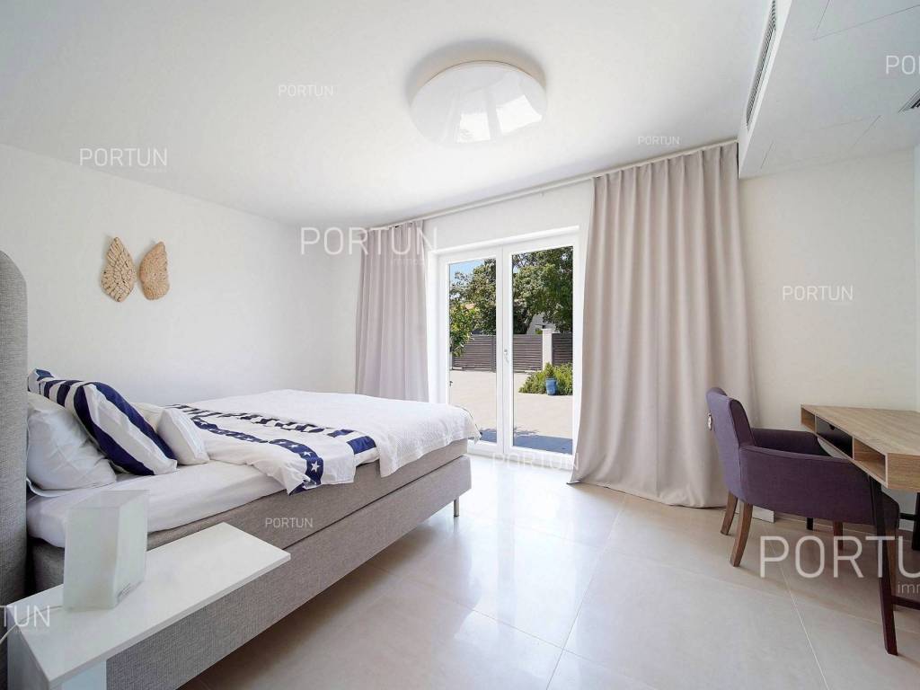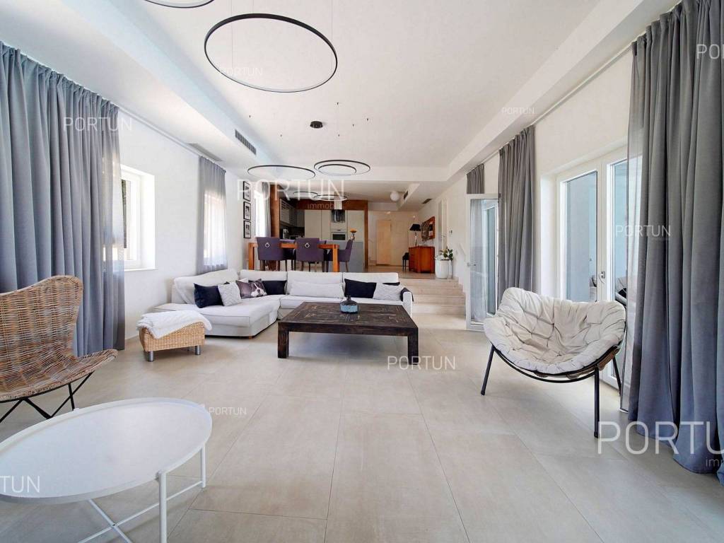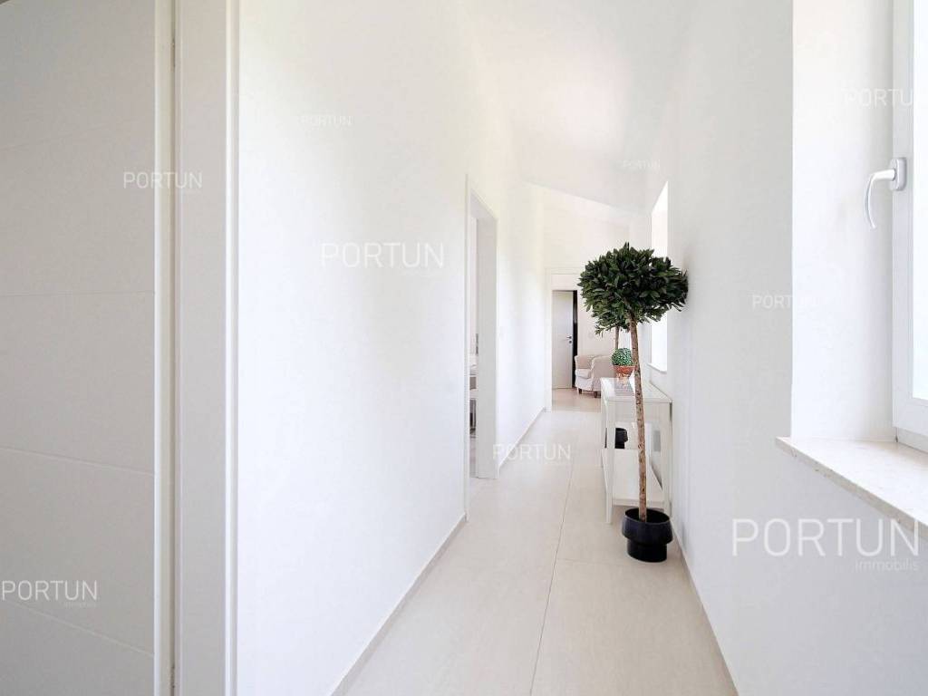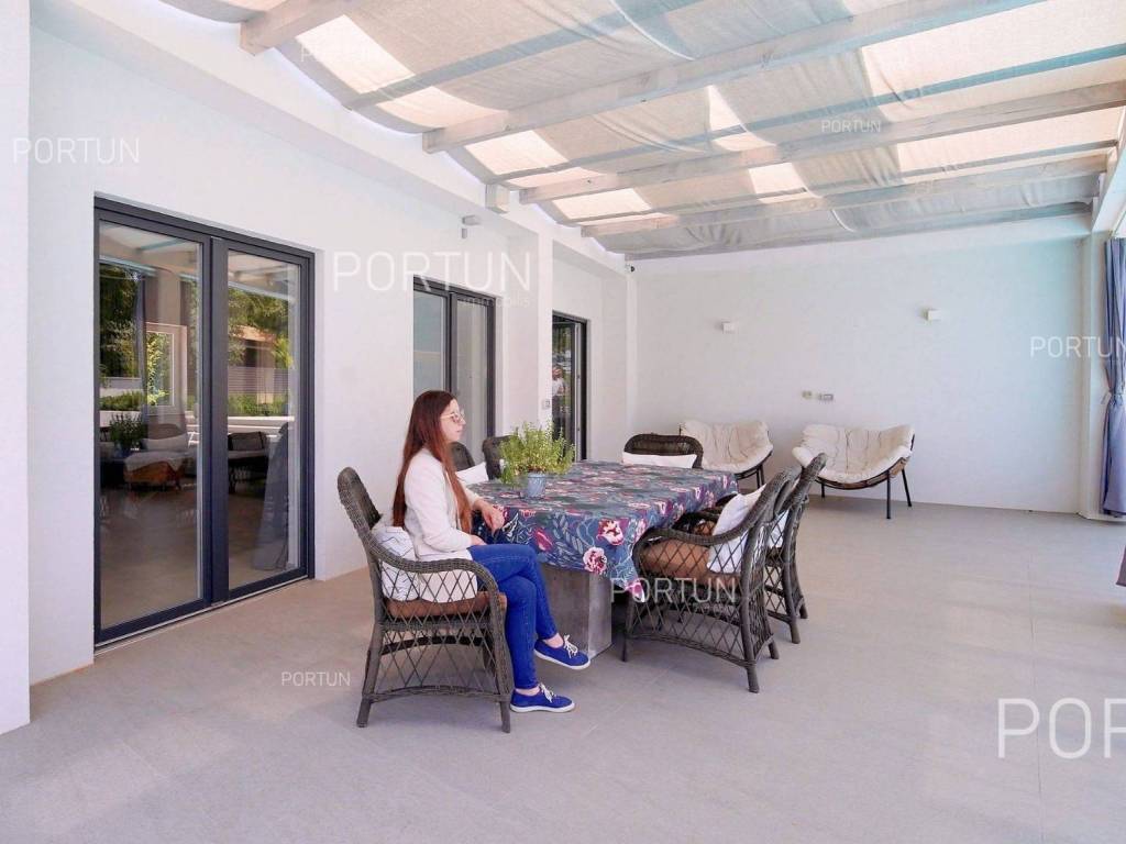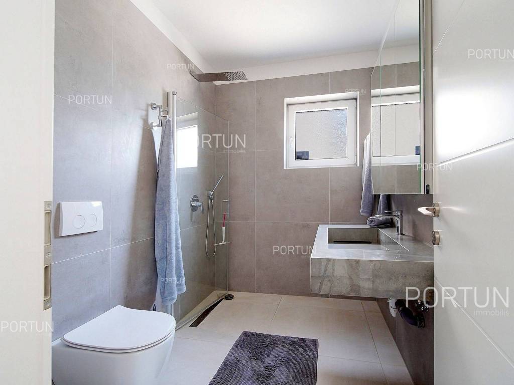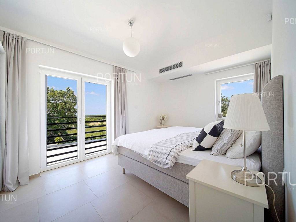 A contemporary villa with four bedrooms, a voluminous living room and a luxurious relaxation area is located in a quiet, rural setting in western Istria and offers a sea view and greenery. The modern interior offers all the necessary comfort for 8-10 guests, and the outdoor area is divided into several zones for relaxation and enjoyment under the open sky.The ground floor is dominated by a bright and airy living room decorated in neutral tones, decorated with minimalist lighting and modern furniture. A few steps above the living room is the dining and food preparation area. The superbly equipped L-shaped kitchen is modernly designed, and in the center there is a kitchen island with a hanging hood. On the ground floor we find another bedroom with bathroom, toilet and laundry room. The first floor is reserved for bedrooms, of which there are three, each with its own bathroom, while the master bedroom is additionally equipped with a large terrace with a view of the sea.The outdoor area is modernly decorated and requires minimal maintenance, while at the same time guests are offered the option of staying in different zones. The central part of the yard is occupied by a rectangular blue swimming pool with a wide staircase, and right next to it there is a sunken lounge area, which is ideal for evening gatherings with friends by the fire pit. Hot days can be spent in the deep shade offered by the covered terraces or in the pleasant shade offered by the summer kitchen. Here you can prepare various dishes on the grill, with the inevitable enjoyment of Istrian wines. If you want a massage and relaxation in the bubbles, it is enough to leave the living room and you can refresh yourself in the hydromassage tub.In order to reduce electricity consumption, photovoltaic panels with a total power of 10.7 kW were placed on the roof, and the house is equipped with a water softening system.In short, this villa on the edge of a small village near Kanfanar offers a peaceful environment in a natural setting. It contains four bedrooms with private bathrooms, a view of the sea from the first floor, a spacious living room with large glass openings, a covered terrace with a summer kitchen, a long swimming pool with a sun deck, an outdoor area for socializing, a modern kitchen with an island, a living room with a fireplace, a private parking for five cars and potential for investment in real estate and summer tourist rental.LocationIstria represents an ideal combination of crystal clear sea, hills and valleys, playful rivers and waterfalls, sun-drenched vineyards and numerous historical and cultural sights. Idyllic rural location in the western part of Istria, where the villa is situated, offers numerous amenities:Sea Beach 20 km Services Food store 7 km Elementary School 7 km Health center 25 km Pharmacy 7 km Marina 20 km Sports and fun Basketball court 7 km Water Park Aquacolors 21,6 km Special forest vegetation reserve "Kontija" 13 km Traffic Nearest highway entry 9 km Pula Airport 43 km About the propertyThe estate which extends to 984 square meters comprises: House 4 Bedrooms 4 Bathrooms 2 Floors 228,25 m2Summer kitchen 1 Floor 15,00 m2Swimming pool 48,00 m2LayoutThe modern villa with an excellent layout, with 228 square meters, is spread over two floors, namely the ground floor and the 1st floor. Ground floor The entrance to the villa is on the ground floor. This 139,25 m2 floor includes a living room with kitchen and dining room, a bedroom with en suite bathroom, a covered terrace, a lavatory and a laundry. First floor Internal stone stairs lead to the upper level, that is to the 1st floor. This 89,00 m2 level features three bedrooms with en suite bathrooms. The three most important rooms in this villa are The living room with kitchen and dining room Ground floor 67,00 m2 West facing Sea View Exit to the terrace Large glass walls Modern sofa set Armchairs (3x) Coffee table TV Wood fireplace Piazzetta Modern lighting Island kitchen Equipped with household appliances Massive wooden table 6 ChairsThe summer kitchen with dining room 15,00 m2 West facing Sea View Single-line kitchen Gas grill Modern table 6 ChairsThe bedroom Ground floor 25,00 m2 West facing Exit to the yard Modern design Wardrobe closet Bathroom with shower Double bed Dressing table LightingParking spaces Parking for five carsAbout the villaThe entrance to the villa is on the ground floor level, on the west side, and vertical communication takes place via an internal staircase. The basic architectural characteristics of this modern villa are: Floors Ground floor + First floor Orientation West External walls Brick wall + Styrofoam insulation 10 cm Concrete slab floors Roof Pitched roof - Tondach E.P.C. Awaiting EPC Built in 2022Furniture and equipmentFurniture All furniture is included in the price Modern furniture Outdoor furnitureEquipment Video intercom Alarm system for the house Video surveillance Smart-house system Designer sanitary wareJoinery Aluminum joinery PVC joinery Curtains Mosquito screens Aluminum entry door Internal wooden doorsMultimedia TV in the living room Installation for TV in each bedroomFlooring Ceramic tilesHeating and cooling Underfloor heating Fan coils Heat pumps BAXI Combined water boiler Fireplace Living roomOutdoor spaceEquipment Outdoor lighting Drip irrigationGreen areas Mediterranean herbs Old olive tree Cypresses LavendersFences Leylandii cypress hedge Concrete wallDriveway Metal door Motor drive Wing openingPedestrian entrance Modern doors Video intercomOutdoor relaxation area Skimmer pool 48,00 m2 Concrete construction Pool liner: Foil Salt water (disinfection by chlorine electrolysis) Hydro massage bath Jacuzzi 6 Persons Sunbathing area Deckchairs Solar shower Modern sofa setServices Connection to the power grid 18,2 kW Photovoltaic panels 10,7 kW Connection to the water supply network Water filtration system Nobel Biological waste water purifier Septic tank 40 m3 Unpaved public access road Distance to the pa
