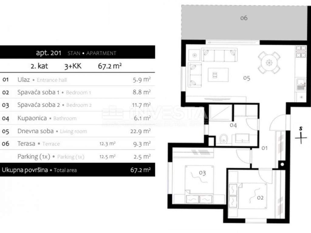 A new modern apartment for sale, located on the first floor of a new building in Premantura. This apartment is a perfect opportunity for anyone looking for a quality home close to the sea and the natural beauty of Kamenjak Nature Park.