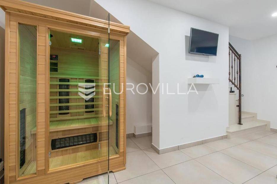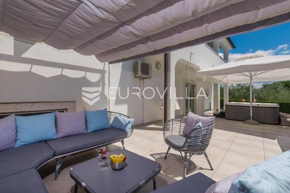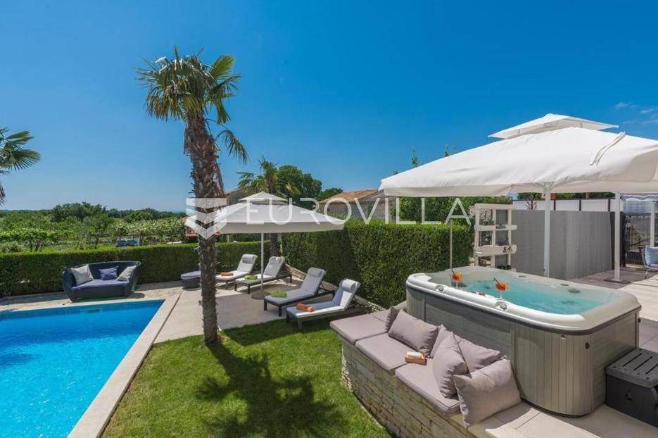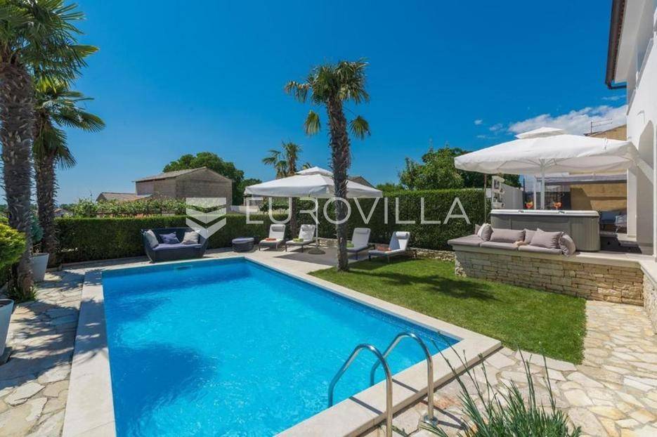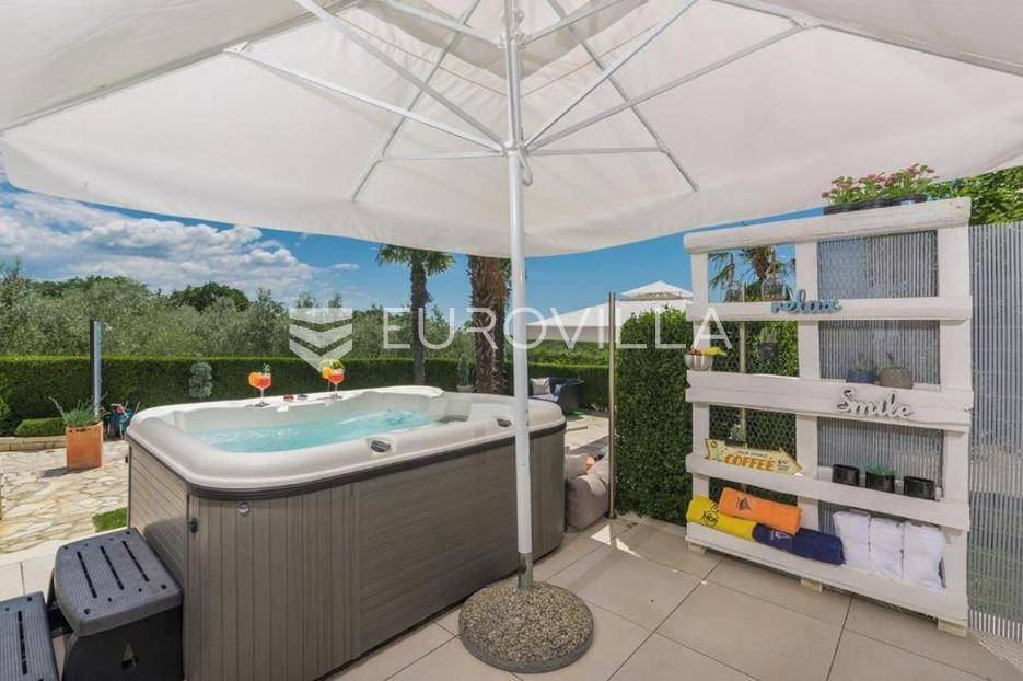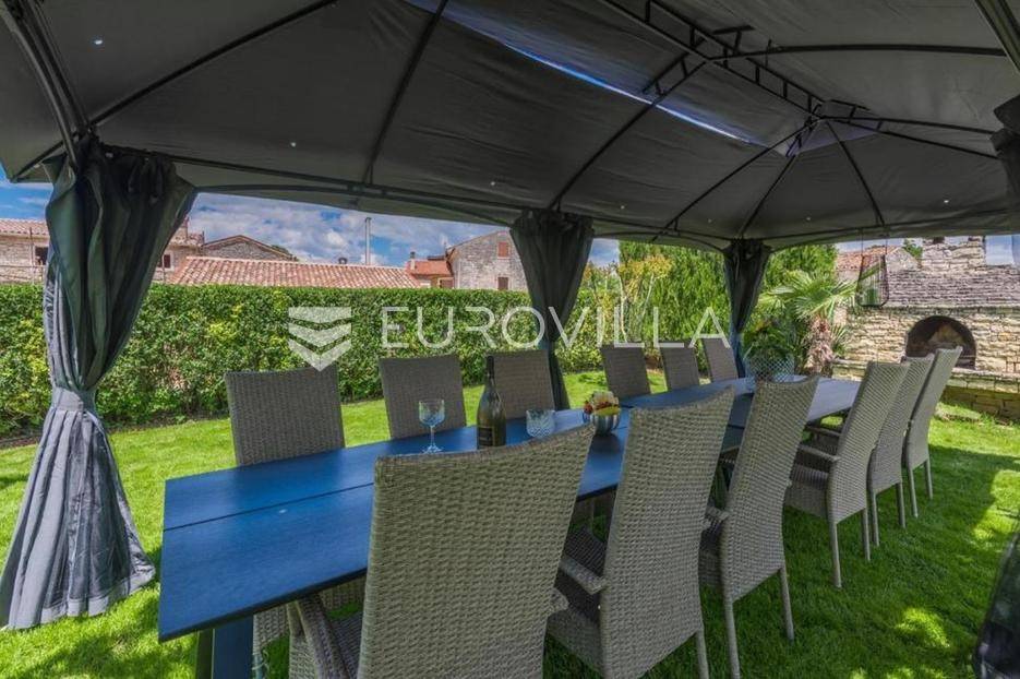 Istra, Sv. Lovreč - prostrana kuća s bazenom, jacuzzijem i prekrasnim pogledomNa prodaju je izuzetna kuća za odmor smještena u mirnom okruženju nedaleko Svetog Lovreča, na samom rubu mjesta, što osigurava potpunu privatnost i mir. Kuća se nalazi na parceli od 312 m², s privatnim ograđenim vrtom površine 230 m².Nekretnina se proteže na tri etaže, s ukupnom neto površinom od 380 m², te nudi mnoštvo sadržaja za ugodan boravak:PrizemljePrivatni, ograđeni vrtBazen 30m2 i jacuzziDvije natkrivene teraseProstrani dnevni boravak s izlazom na terasu povezanu s vrtomKuhinja i blagovaonica s vlastitom terasomSuterenTeretanaSaunaMeđukatSpavaća soba s vlastitom kupaonicomPrvi katTri spavaće sobeTri kupaoniceTerasa s prekrasnim pogledom na prirodu i morePotkrovljeDvije spavaće sobeDvije kupaoniceKuća je dio dvojne cjeline u selu Selina, u blizini Poreča. Opremljena je sa šest klimatiziranih spavaćih soba, šest modernih kupaonica, potpuno opremljenom kuhinjom, blagovaonicom i udobnim dnevnim boravkom. Ograđeni vrt pruža dodatni prostor za boravak na otvorenom, s dječjim igralištem, vrtnom garniturom, ležaljkama i lijepim bazenom idealnim za ljetno osvježenje.Ova kuća predstavlja idealnu priliku za ulaganje u turistički najam ili kao privatno utočište za odmor.Za više informacija i dogovor oko obilaska, slobodno nas kontaktirajte.