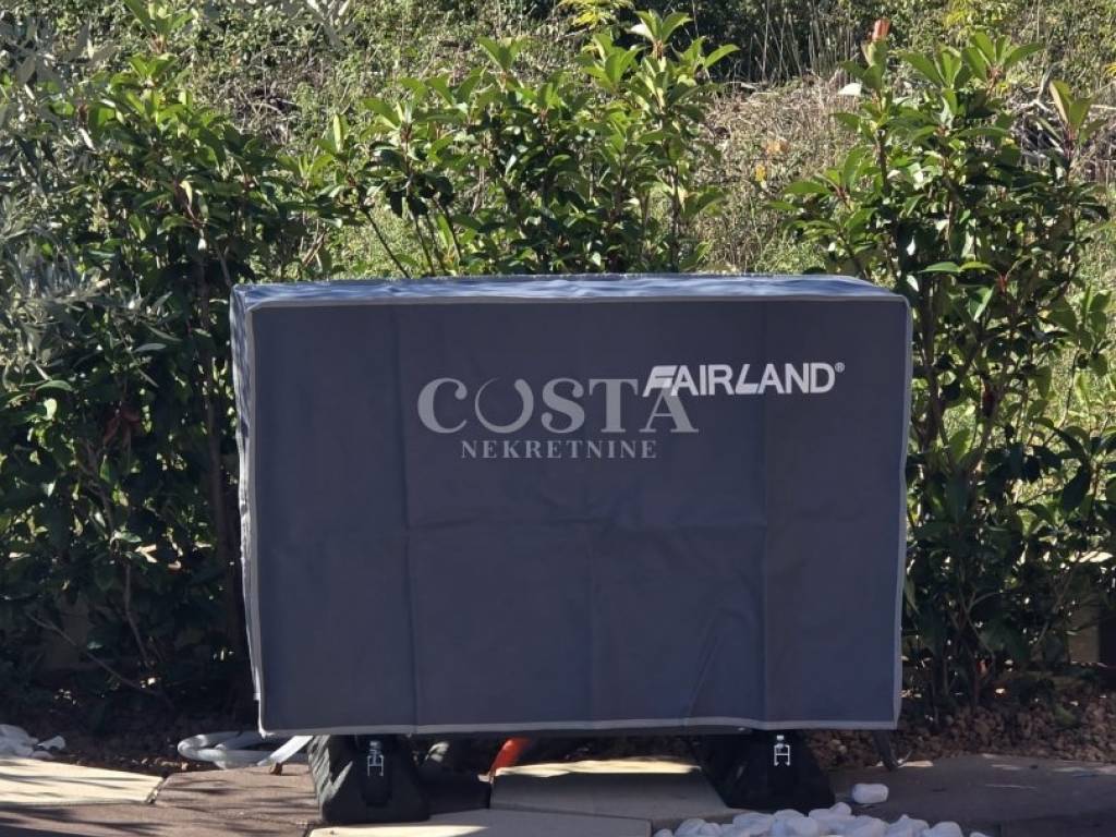 This high-quality home with a smart home system with remote control includes air conditioning in all rooms, underfloor heating via a Daikin heat pump for heating and cooling, custom-made furniture with built-in Electrolux appliances. The heated pool comes with an automatic pH value dispenser and a pool cleaning robot.