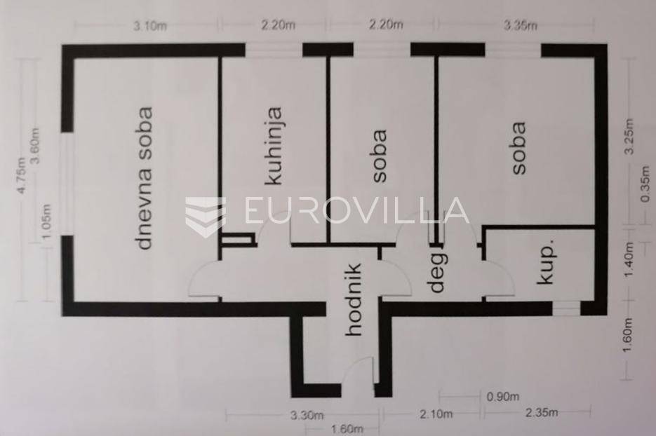 Stan površine 53,79 m2 sastoji se od hodnika, predsoblja, kupaonice, dvije spavaće sobe, odvojene kuhinje i zasebno dnevnog boravka.Stan je djelomično adaptiran 2015. godine, nova ALU stolarija, protuprovalna vrata, orahov parket, grijanje centralno ili klima.