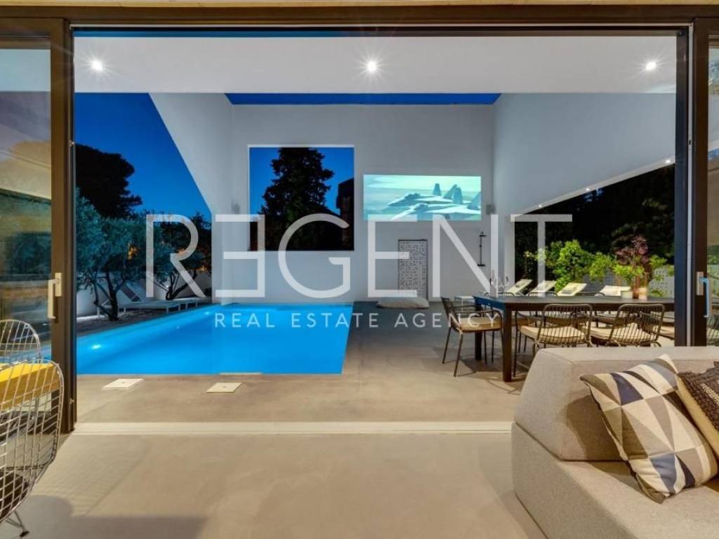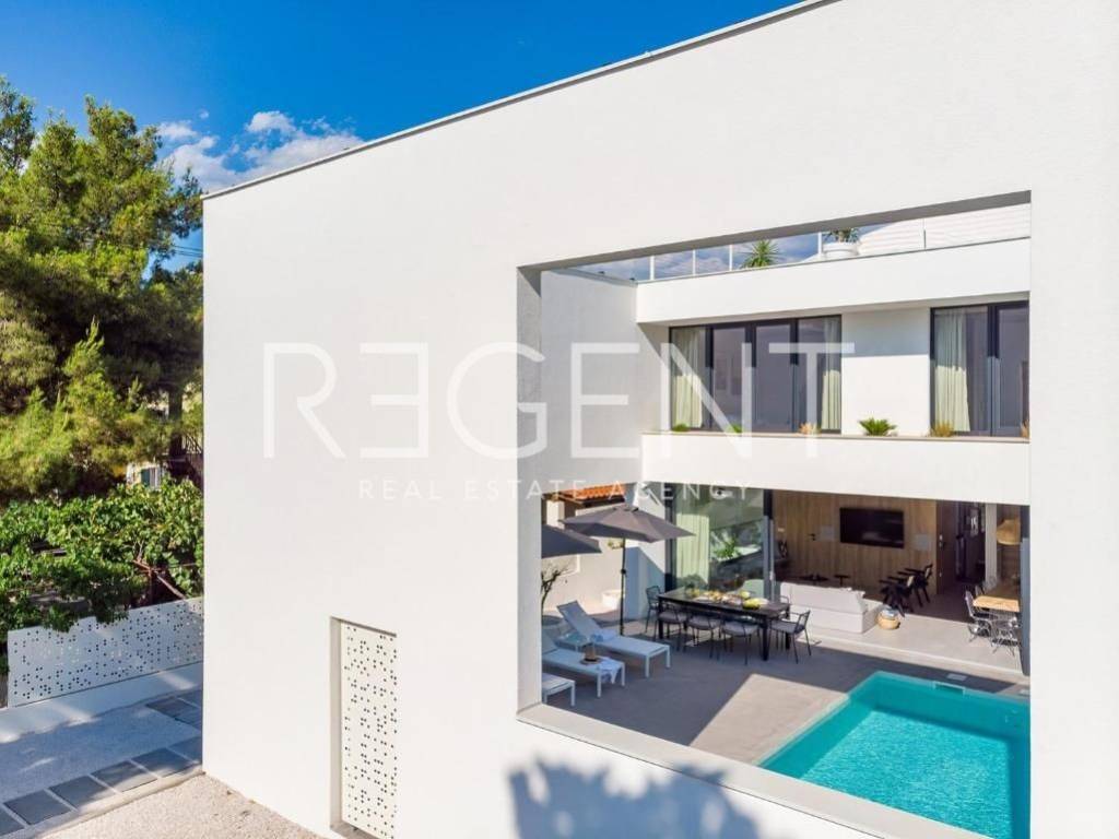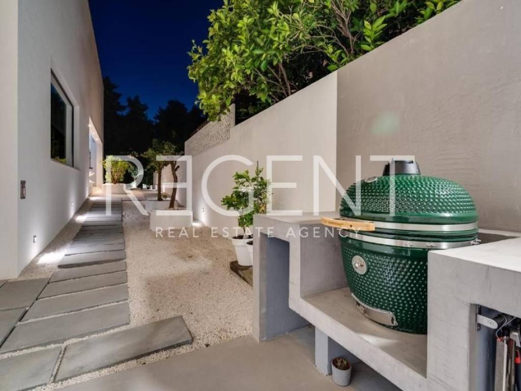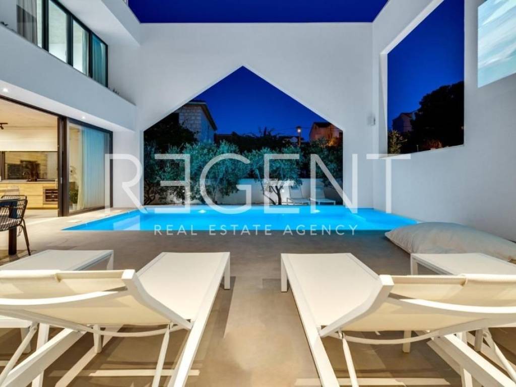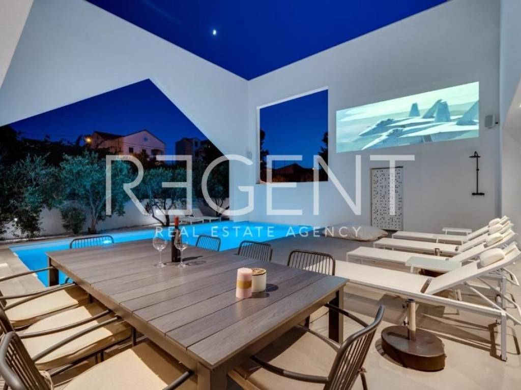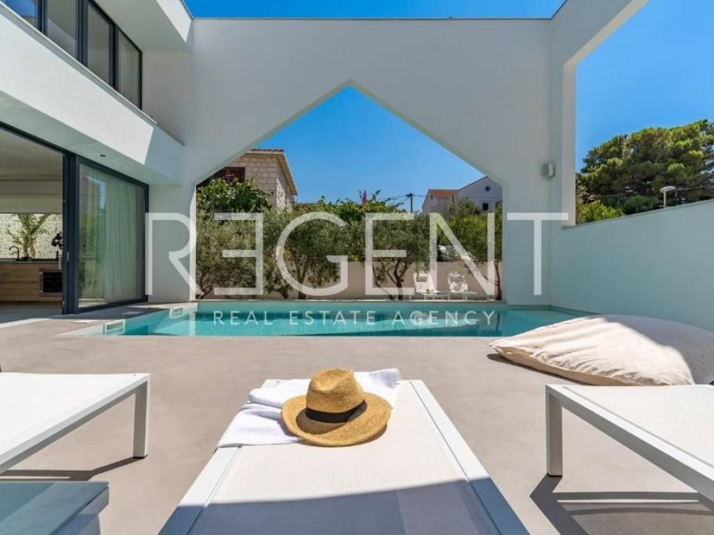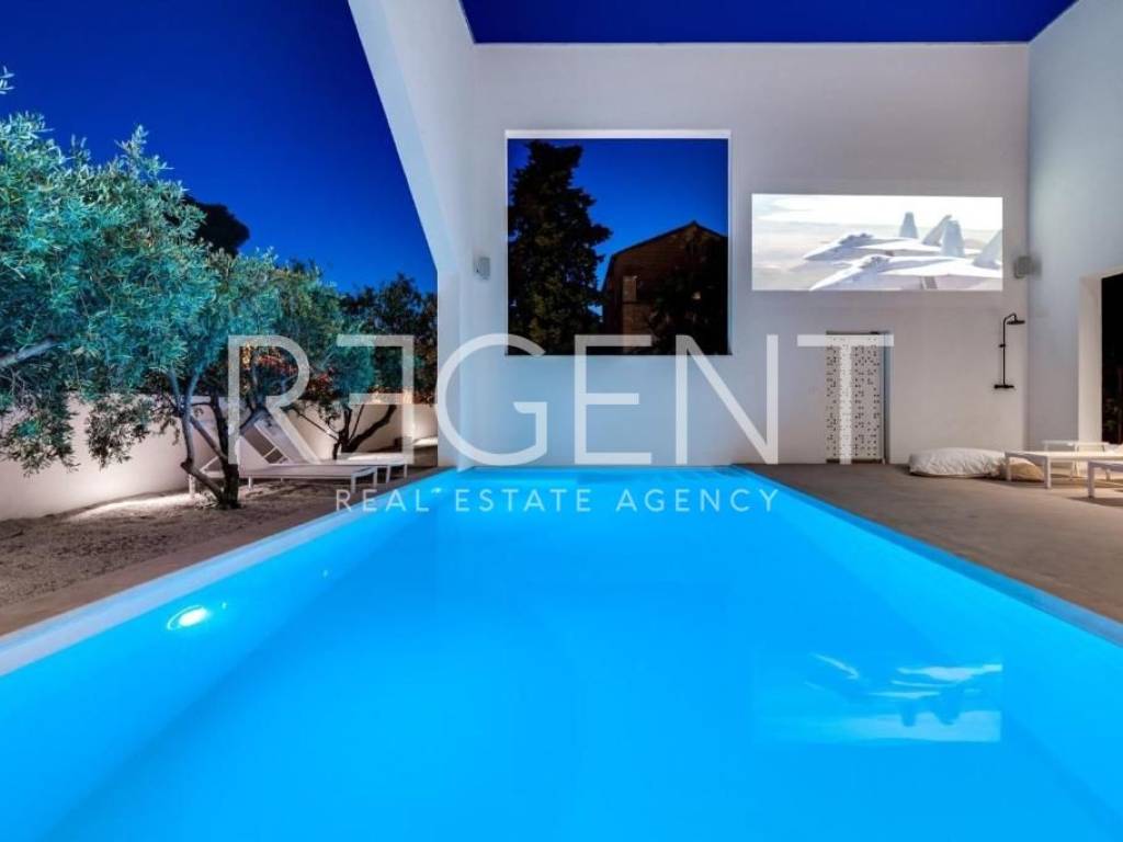 Sur l'île de Brač, à seulement 50 mètres de la mer et à dix minutes à pied du centre de Supetar, se trouve une villa de luxe contemporaine qui offre la combinaison parfaite d'élégance, de confort et du style de vie méditerranéen. Entourée d'un environnement dalmate typique et d'un jardin paysagé, cette propriété offre une intimité et une détente exceptionnelles avec un niveau d'équipement haut de gamme. La propriété s'étend sur 225 m² de surface habitable sur un terrain clôturé de 481 m², et est répartie sur plusieurs étages avec l'ajout d'un spacieux salon sur le toit. L'intérieur comprend cinq chambres, cinq salles de bains modernes, une cuisine élégante avec salle à manger et un salon semi-ouvert relié à l'extérieur par de grandes baies vitrées. L'ambiance agréable est complétée par une piscine chauffée de 34 m² avec hydromassage, un espace de détente avec un projecteur de cinéma extérieur et un sauna finlandais pour une relaxation complète. La propriété comprend également une pièce spécialement aménagée pour un bureau à domicile dans le grenier avec deux postes de travail, une kitchenette et une climatisation supplémentaire - une solution idéale pour travailler ou jouer dans un environnement calme. Un système de son surround, la climatisation et le WiFi rapide sont installés dans tout l'espace, et une console PS4 est également disponible pour les clients. Une valeur ajoutée est fournie par la cour de conception moderne avec des murs blancs qui assurent l'intimité, tout en donnant une touche architecturale élégante à l'ensemble du bâtiment. La plage de galets la plus proche est à seulement 50 mètres, tandis que la plage de sable est à environ 1 km. À proximité immédiate se trouvent des restaurants, une supérette et toutes les commodités nécessaires pour un séjour agréable, tandis que de plus grands supermarchés sont accessibles à quelques minutes en voiture. Cette villa représente une excellente opportunité pour ceux qui recherchent une résidence secondaire haut de gamme, une oasis de luxe pour des vacances ou une propriété attrayante pour la location touristique sur l'une des îles adriatiques les plus prisées. Pour plus d'informations et pour organiser une visite, nous sommes à votre disposition.