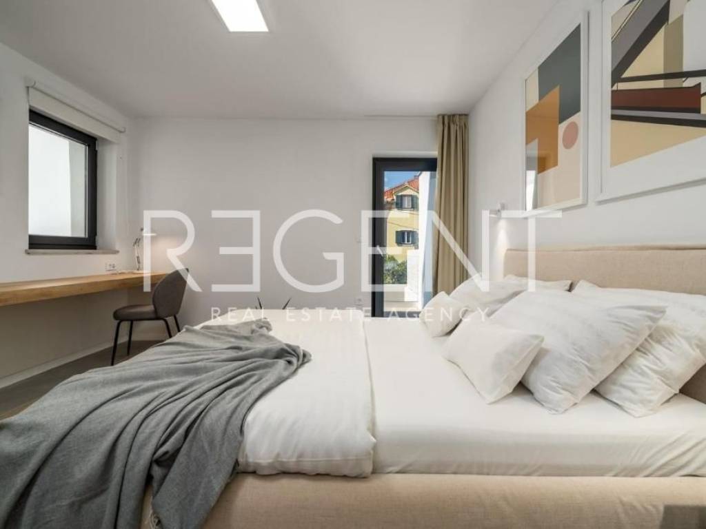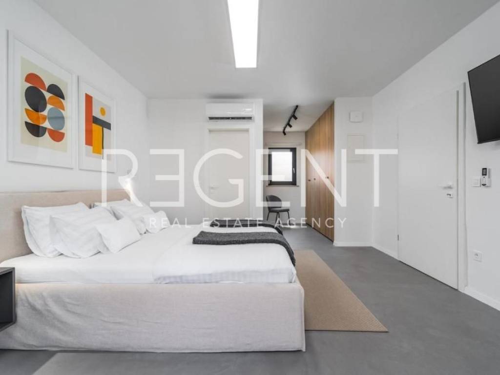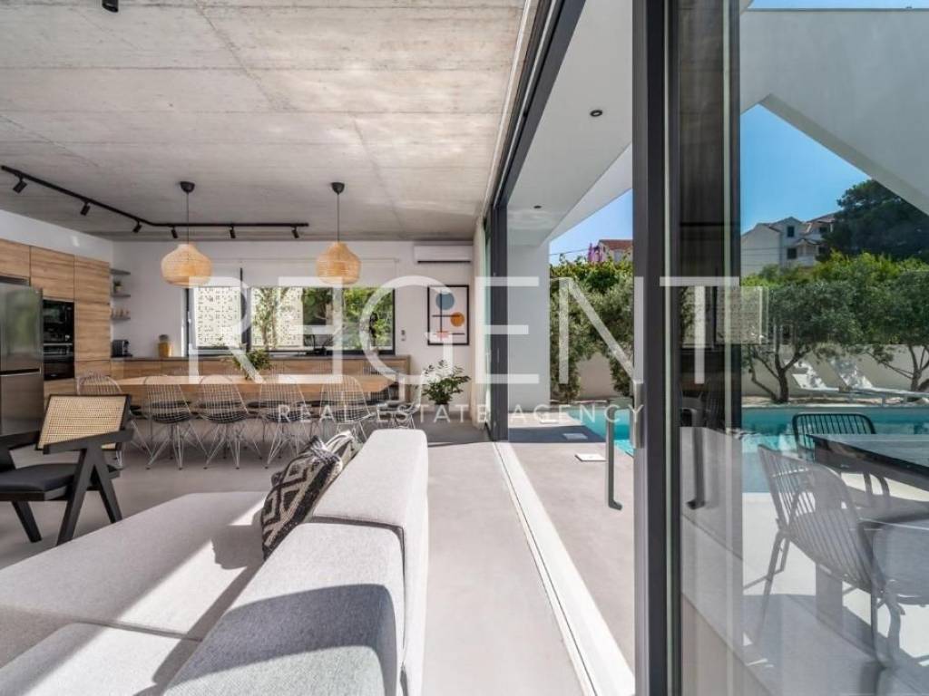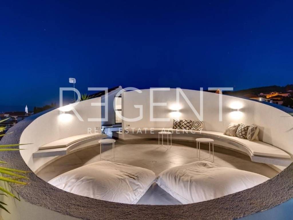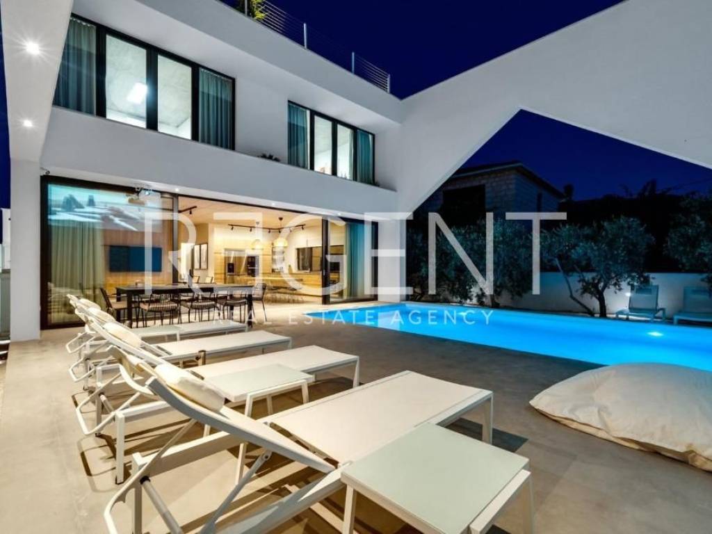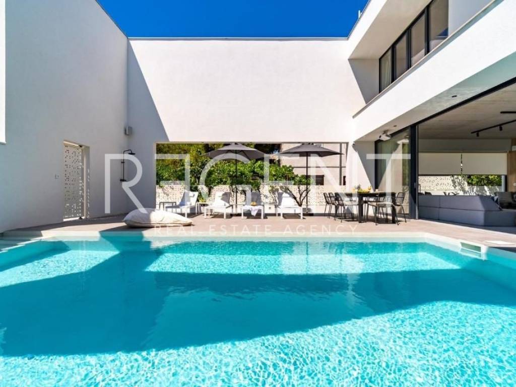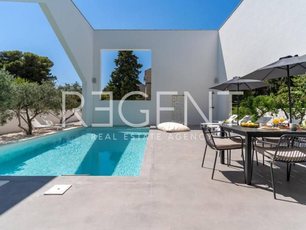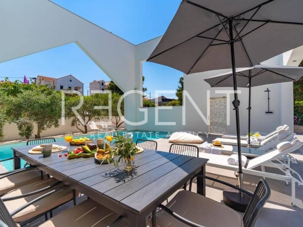 Sur l'île de Brač, à seulement 50 mètres de la mer et à dix minutes à pied du centre de Supetar, se trouve une villa de luxe contemporaine qui offre la combinaison parfaite d'élégance, de confort et du style de vie méditerranéen. Entourée d'un environnement dalmate typique et d'un jardin paysagé, cette propriété offre une intimité et une détente exceptionnelles avec un niveau d'équipement haut de gamme. La propriété s'étend sur 225 m² de surface habitable sur un terrain clôturé de 481 m², et est répartie sur plusieurs étages avec l'ajout d'un spacieux salon sur le toit. L'intérieur comprend cinq chambres, cinq salles de bains modernes, une cuisine élégante avec salle à manger et un salon semi-ouvert relié à l'extérieur par de grandes baies vitrées. L'ambiance agréable est complétée par une piscine chauffée de 34 m² avec hydromassage, un espace de détente avec un projecteur de cinéma extérieur et un sauna finlandais pour une relaxation complète. La propriété comprend également une pièce spécialement aménagée pour un bureau à domicile dans le grenier avec deux postes de travail, une kitchenette et une climatisation supplémentaire - une solution idéale pour travailler ou jouer dans un environnement calme. Un système de son surround, la climatisation et le WiFi rapide sont installés dans tout l'espace, et une console PS4 est également disponible pour les clients. Une valeur ajoutée est fournie par la cour de conception moderne avec des murs blancs qui assurent l'intimité, tout en donnant une touche architecturale élégante à l'ensemble du bâtiment. La plage de galets la plus proche est à seulement 50 mètres, tandis que la plage de sable est à environ 1 km. À proximité immédiate se trouvent des restaurants, une supérette et toutes les commodités nécessaires pour un séjour agréable, tandis que de plus grands supermarchés sont accessibles à quelques minutes en voiture. Cette villa représente une excellente opportunité pour ceux qui recherchent une résidence secondaire haut de gamme, une oasis de luxe pour des vacances ou une propriété attrayante pour la location touristique sur l'une des îles adriatiques les plus prisées. Pour plus d'informations et pour organiser une visite, nous sommes à votre disposition.