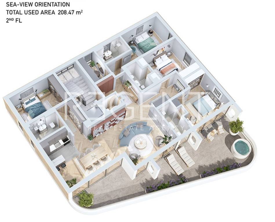 Dans un emplacement attrayant à Volosko, à seulement 250 mètres de la mer et à proximité du centre d'Opatija, se trouve ce luxueux appartement de cinq pièces d'une superficie de 208,47 m², situé dans l'un des deux immeubles modernes avec 12 logements exclusifs qui assurent calme, intimité et un haut niveau de confort. L'appartement S2 est situé au 2ème étage et se caractérise par une disposition réfléchie : hall d'entrée (6,91 m2) WC (2,08 m2) cuisine (5,88 m2) espace ouvert salon avec salle à manger (50,70 m2), salle de bain 1 (4,71 m2), chambre 1 (13,18 m2), chambre 2 (15,98 m2), salle de bain 2 (4,88 m2), dressing (5,30 m2), chambre 3 (15,49 m2), salle de bain 3 (3,80 m2) chambre 4 (16,96 m2) salle de bain 4 (4,82 m2), terrasse 1 (40,83 m2) terrasse 2 (12,05 m2) terrasse spacieuse avec préparation pour jacuzzi Le prix comprend une place de parking dans le garage et une salle de stockage. L'appartement est équipé de matériaux de haute qualité, du chauffage au sol, de la climatisation dans toutes les pièces, de menuiseries en aluminium avec volets roulants électriques et d'un système de sécurité haut de gamme. L'immeuble dispose d'un ascenseur et appartient à une classe énergétique à haute efficacité. Cette propriété est idéale pour les personnes recherchant une propriété de luxe pour vivre dans l'un des lieux côtiers les plus prisés de Croatie, mais aussi pour ceux qui recherchent un investissement sûr pour la location touristique. Pour plus d'informations, n'hésitez pas à nous contacter !