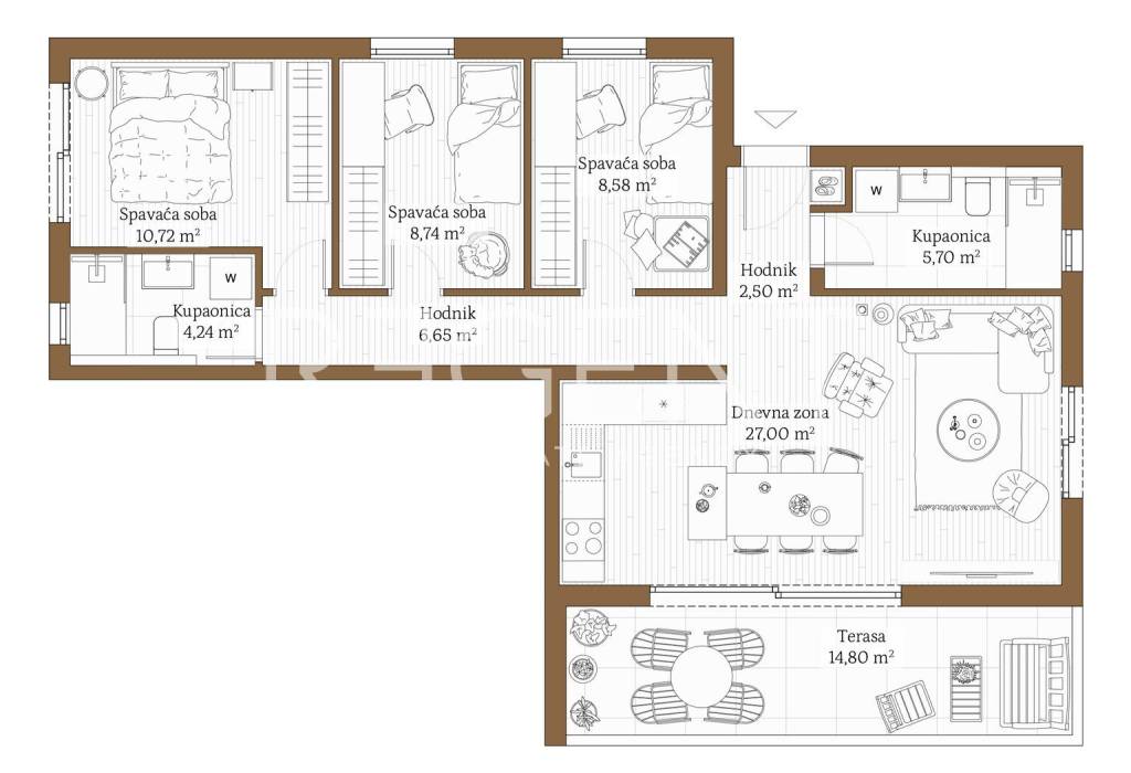 Au premier étage d'un nouvel immeuble dans un quartier calme de Kaštel Lukšić, se trouve un appartement de quatre pièces d'une superficie nette totale de 81,53 m² avec une terrasse de 14,80 m². L'appartement a un agencement fonctionnel et se compose de trois chambres, deux salles de bains, un couloir et un espace de vie avec cuisine, salle à manger et salon. L'espace de vie donne sur une terrasse qui permet de séjourner à l'extérieur et de profiter de la vue sur la mer. L'appartement est équipé de chauffage au sol, de climatisation et de menuiseries PVC. Les revêtements de sol sont réalisés dans une combinaison de céramique et de parquet. Toutes les pièces bénéficient de lumière naturelle. Le projet est situé dans un quartier résidentiel entre Kaštel Lukšić et Kaštel Kambelovac, en contrebas de la route principale. À proximité immédiate se trouvent une école, une maternelle, des commerces, une école de ballet, les transports en commun et toutes les commodités importantes. La mer et la promenade sont accessibles en quelques minutes en voiture. Le début de la construction est prévu pour septembre 2025 et l'achèvement pour fin 2026. Le paiement peut être convenu par étapes, en fonction de l'avancement de la construction. Un financement par crédit est également possible avec une participation propre minimale de 40 %. Pour plus d'informations et pour organiser une visite, n'hésitez pas à nous contacter.