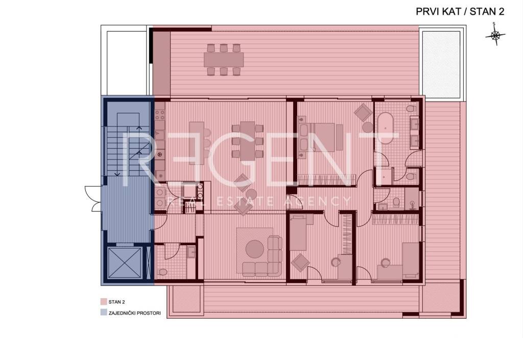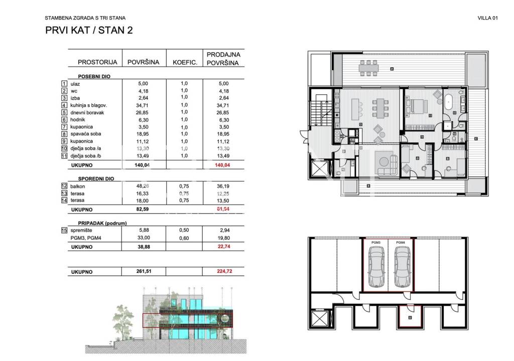 L'appartement est situé au 1er étage d'une villa moderne située dans un quartier paisible de Gornji Bukovac, connu pour sa verdure et son environnement agréable. L'emplacement offre un équilibre parfait entre intimité et proximité des commodités de la ville et est idéal pour les familles et les couples à la recherche d'une maison avec un confort supérieur. L'appartement a une superficie totale de 140,04 m², et se compose d'une entrée, d'un salon avec cuisine et salle à manger à aire ouverte, de trois chambres, de deux salles de bains, de toilettes supplémentaires et d'un débarras. Depuis le salon, on accède à un balcon spacieux et à deux terrasses d'une superficie totale de plus de 60 m² - parfaites pour se détendre et séjourner en plein air. Le design intérieur est en harmonie avec le mode de vie moderne - de grandes baies vitrées apportent beaucoup de lumière naturelle, et l'agencement des pièces permet une fonctionnalité et un confort complets. La chambre principale dispose de sa propre salle de bains, tandis que les chambres d'enfants sont situées dans une partie calme de l'appartement. La villa est construite selon des normes élevées d'efficacité énergétique et équipée de matériaux de qualité supérieure : menuiseries en aluminium avec triple vitrage, chauffage au sol, climatisation et portes anti-effraction. Il y a un débarras et deux places de parking dans le garage au sous-sol. Une rue calme, la proximité immédiate de l'école, de la maternelle, du magasin et des transports en commun font de cet endroit un lieu de vie familial idéal. Maksimir et le centre-ville ne sont qu'à quelques minutes en voiture, et il existe de nombreuses promenades et espaces verts dans les environs. Pour plus d'informations, n'hésitez pas à nous contacter.