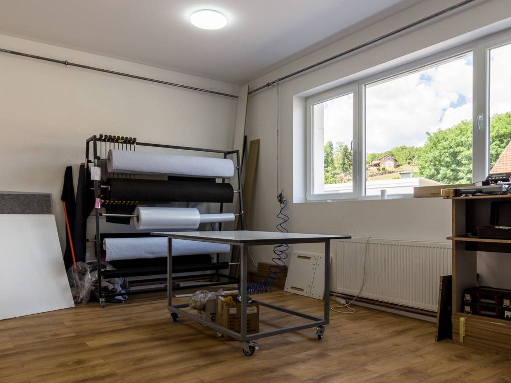 Kat (280 m2) uključuje dva ureda s pogledom na proizvodni prostor, kuhinju s blagovaonicom, spremište koje se može koristiti kao garderoba te veliku natkrivenu terasu s pogledom na zelenilo.