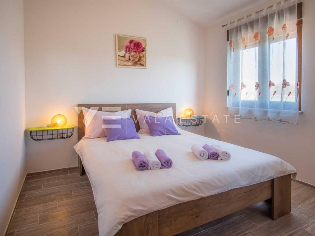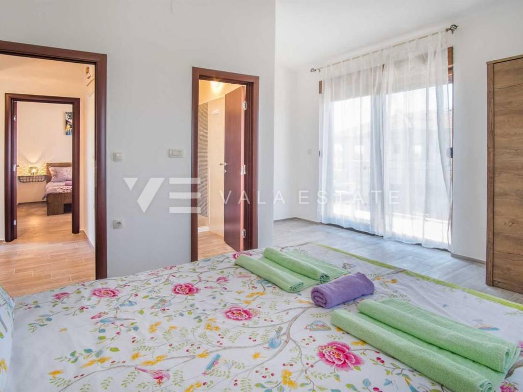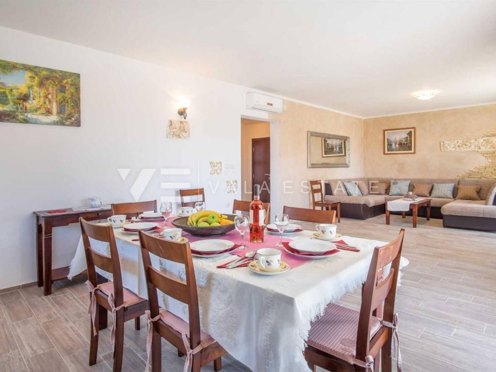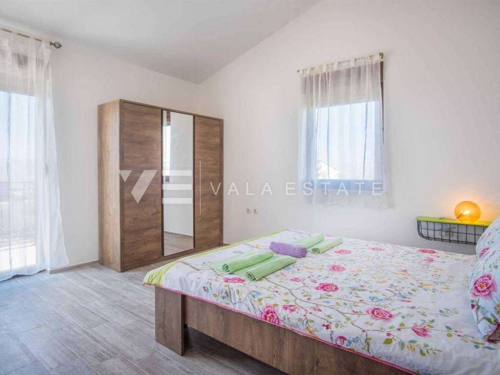 Real estate island of Krk, town of Krk surroundings - for sale is a semi-detached house with 200 m2 of living space, which is arranged on the ground floor and first floor. The ground floor consists of an entrance hall, bedroom, bathroom, kitchen with dining area and living room with access to a covered terrace and garden, while the first floor includes a hallway and three bedrooms, each with its own bathroom, two of which have access to a covered terrace with a beautiful sea view. The house is built of very high-quality materials, the floor is covered with ceramics and parquet, it is air-conditioned, has PVC joinery and is fully furnished and equipped. On the landscaped garden there is a swimming pool with a sunbathing area, a summer kitchen and two parking spaces. A beautiful, quiet location with an open view of the sea for all lovers of a peaceful holiday, but also a good opportunity for investment for tourist rental purposes. The distance from the sea and beaches and all amenities is about 1800 meters.